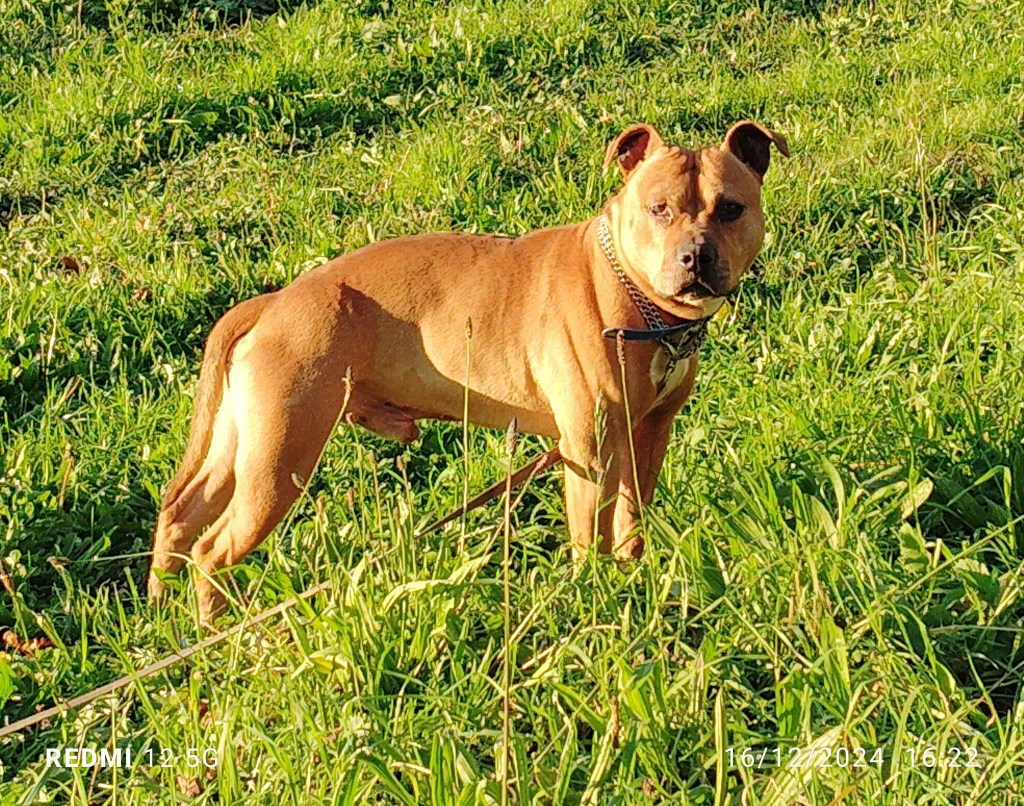 Armani est un American Staffordshire Terrier, de taille moyenne. Il est inscrit au LOF. Il écoute, a de bonnes bases d’éducation et se balade tranquillement. Armani adore les adultes qui peuvent le manipuler facilement. Par contre, Armani n’aime pas les enfants et les autres animaux. Armani a une dégénérescence prématurée des cellules du cervelet (abiotrophie, encore appelée dégénérescence cérébelleuse). C’est une affection héréditaire. Cela se traduit par des problèmes d’équilibre et de coordination (ataxie). Armani peut être maladroit, parfois chuter et avoir des tremblements. L’évolution de la maladie est différente d’un chien à un autre. Pour Armani, la maladie a été détectée en mai 2024. Depuis, ses symptômes sont stables. Il reste vif et alerte (cf vidéo). Armani est un amour de loulou et nous espérons qu’il trouvera un foyer, malgré sa maladie. Il n’a pas de traitement médical en cours. S’il y avait de futurs frais vétérinaires, le refuge les prendrait en charge. Pour adopter Armani ou être sa famille d’accueil, il faut avoir le permis de détention de chiens de catégorie 2. Nous pouvons vous orienter vers des structures qui forment au certificat de capacité. Plus de photos sur Albums photos