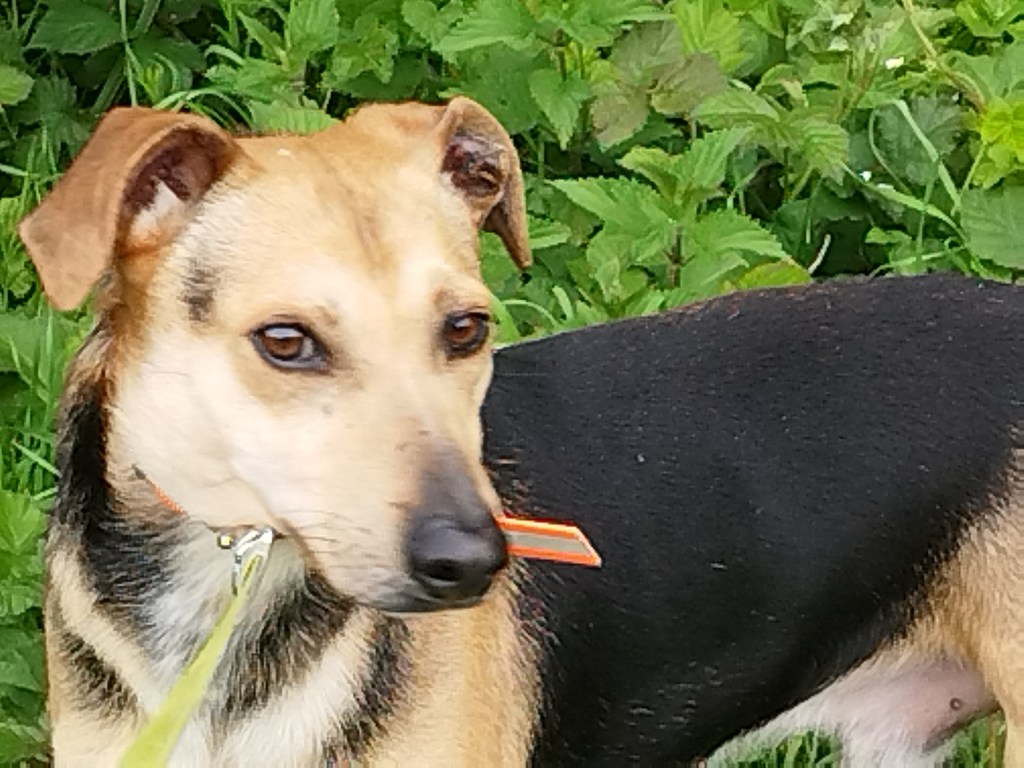 Zoé est une chienne de taille moyenne, de 1 an et demi environ, croisée chien courant. Zoé a été trouvée. Elle est très gentille, se laisse câliner et aime les balades. Elle est de plus en plus confiante.