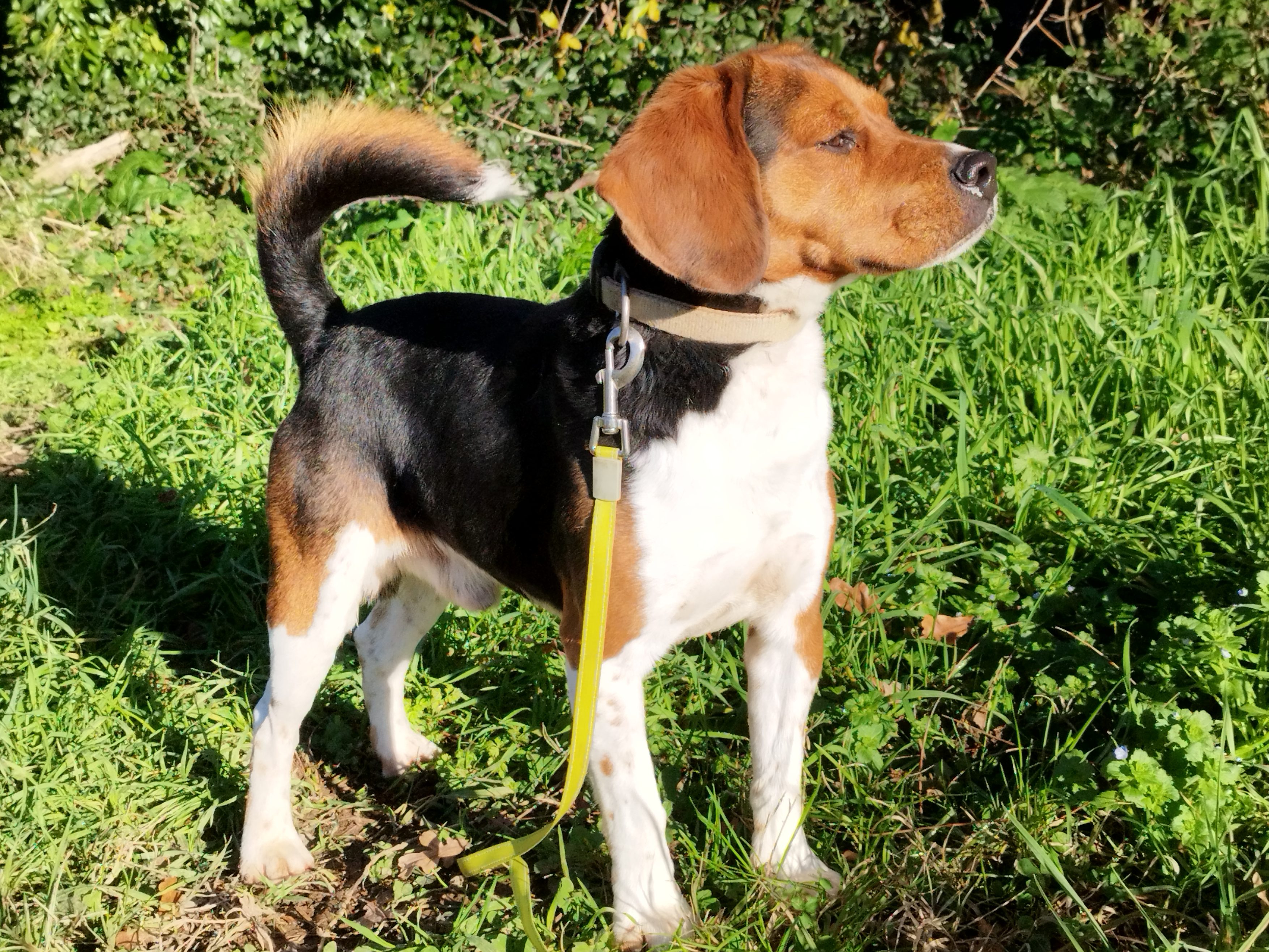 Midol est un chien de taille moyenne, croisé Beagle, de 4 ans. Il se promène facilement, sans tirer. Midol aime bien les caresses mais n’aime pas être enlacé.