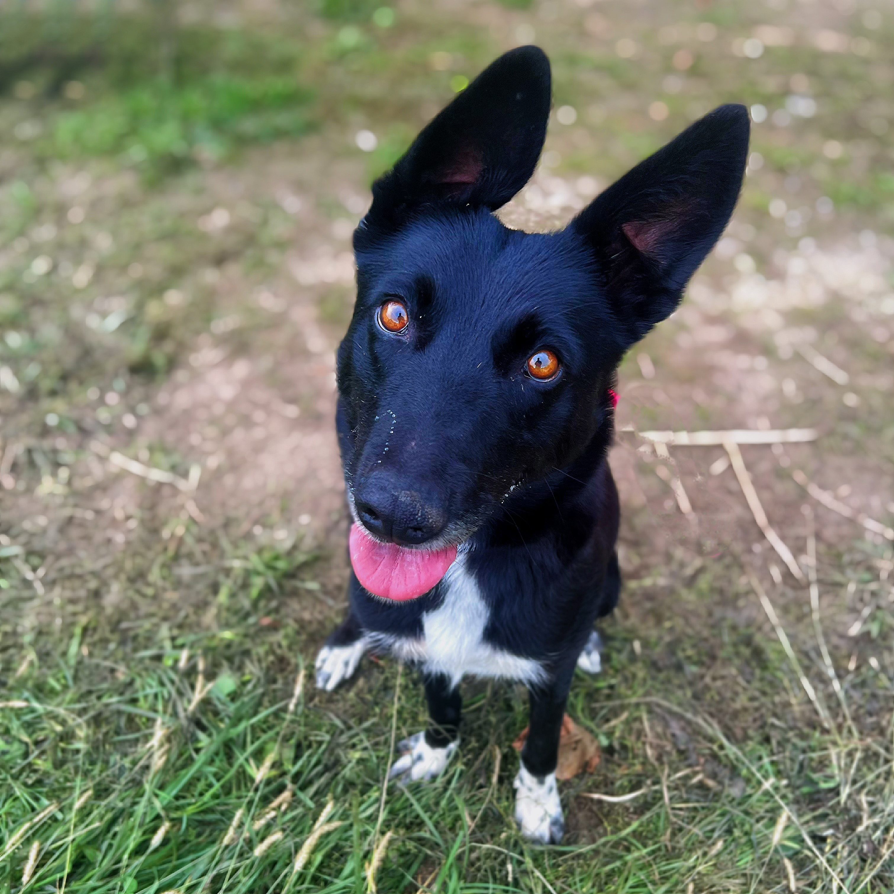 Stella est une femelle de taille moyenne, croisée Border Collie et Berger, âgée d’un an et demi, environ. Elle est très gentille et se promène facilement.