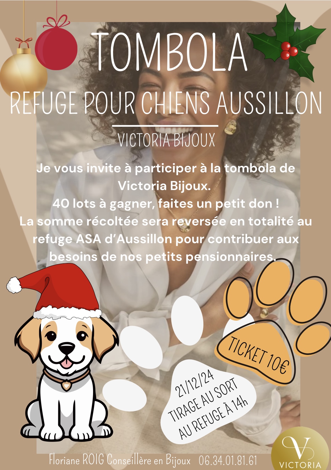 Nous remercions vivement Floriane, une bénévole qui a pris l’initiative d’organiser une tombola au profit des pensionnaires du refuge. Les billets sont à retirer au refuge, les après-midis, de 14h à 17h. Le tirage au sort aura lieu le samedi 21 décembre, à 14h, au refuge. Nous remercions également la Clinique vétérinaire Masson et les magasins qui ont accepté de vendre des billets et/ou d’afficher l’événement : Isabel Coiffure, Love Literie, Beauty Dog, La Pierre de Lune, La Vie Claire, Royal Pressing, Zoomalia, Cap animal, salon de coiffure Pour elle et lui.