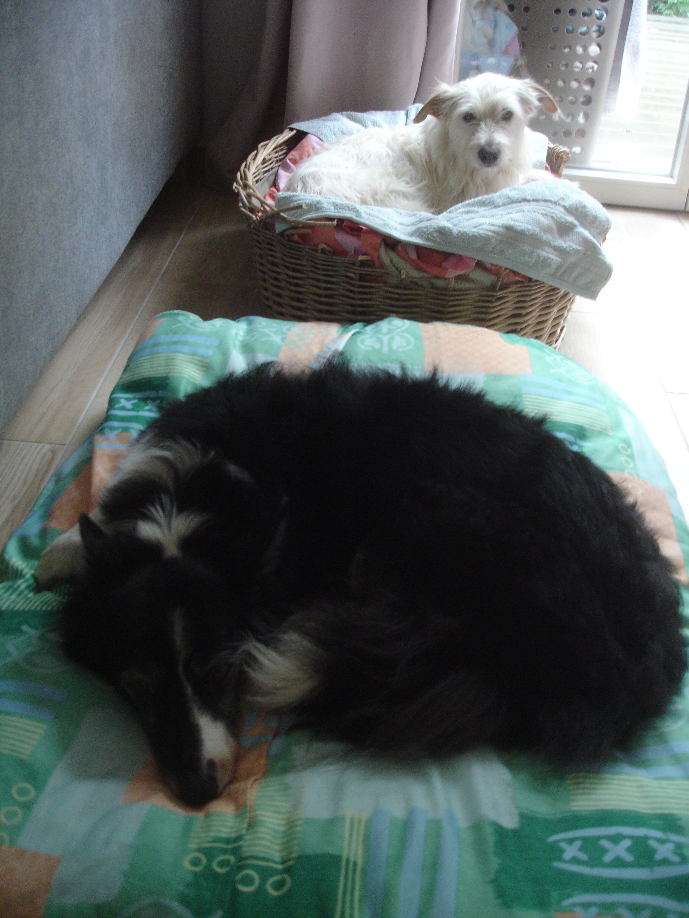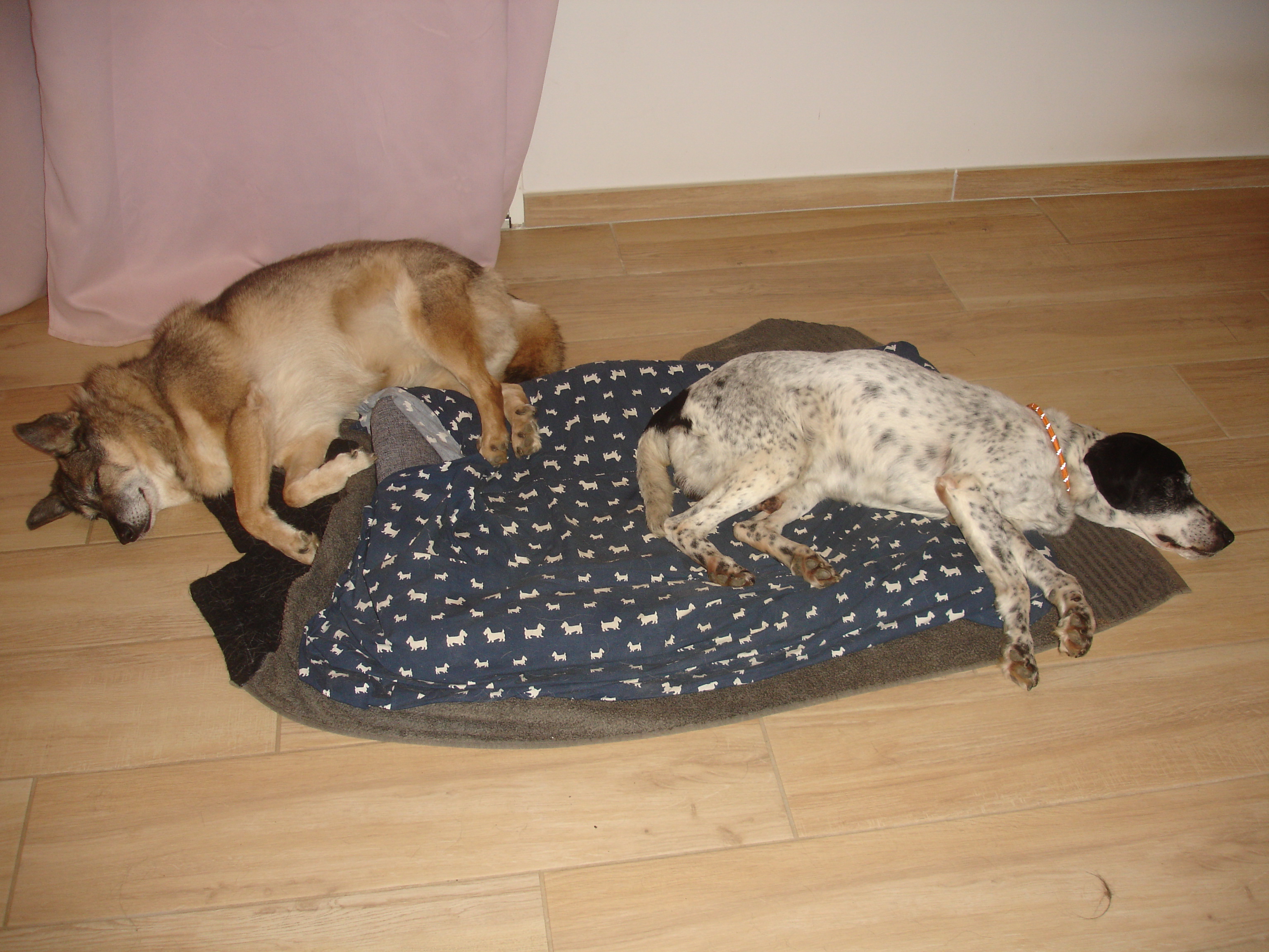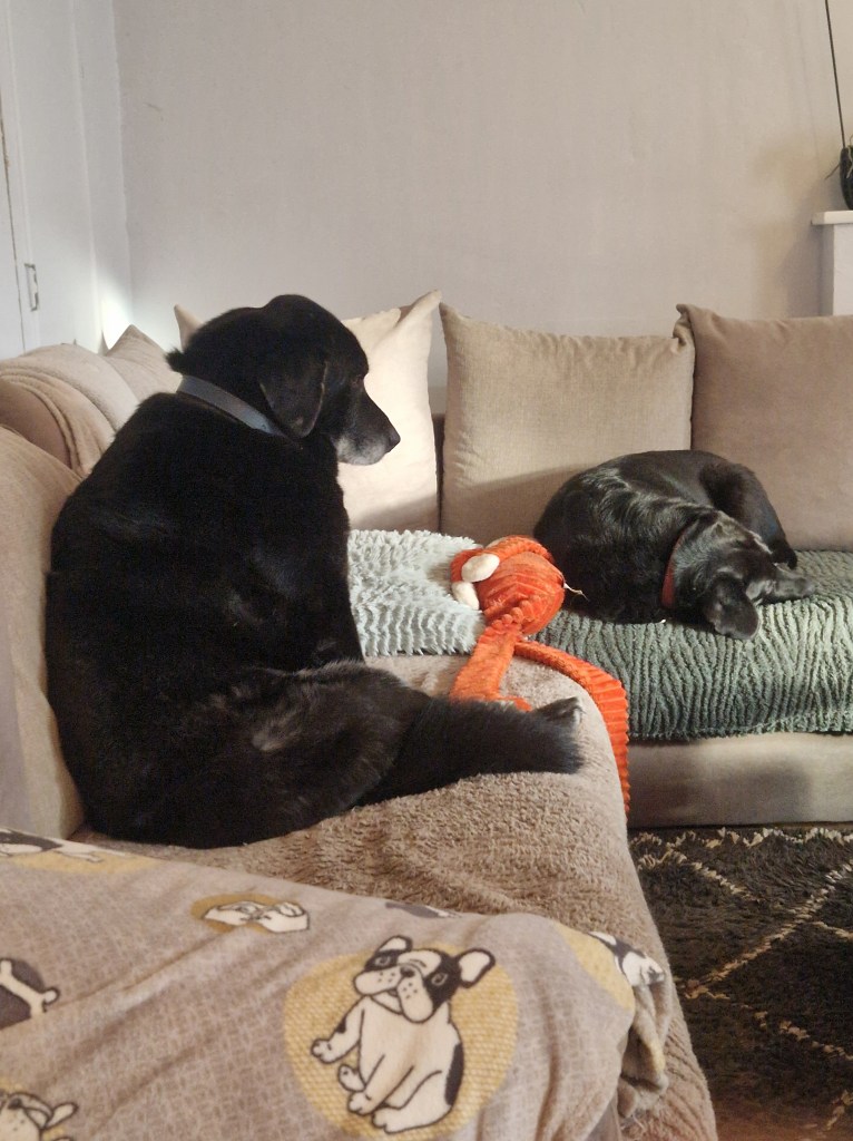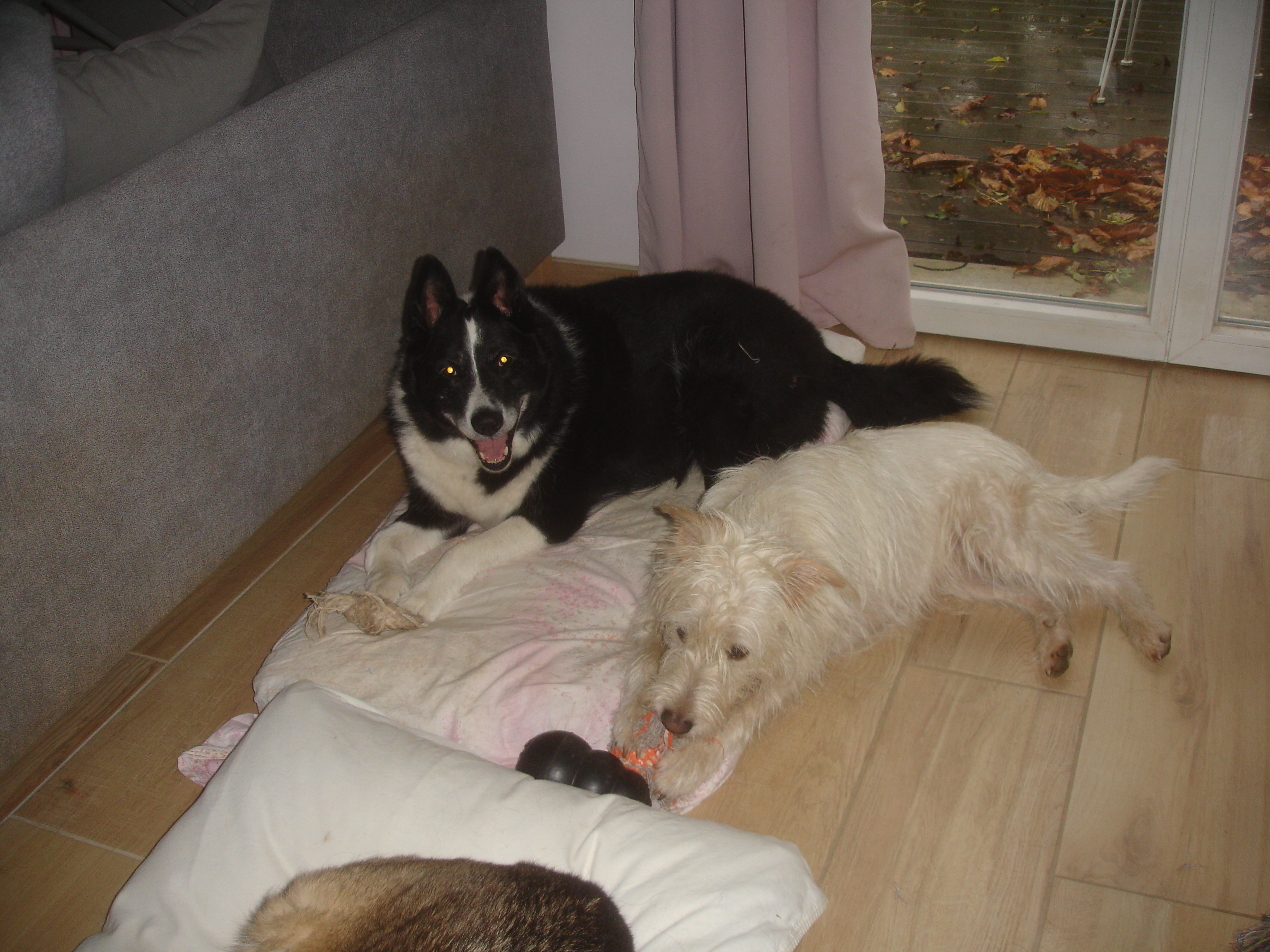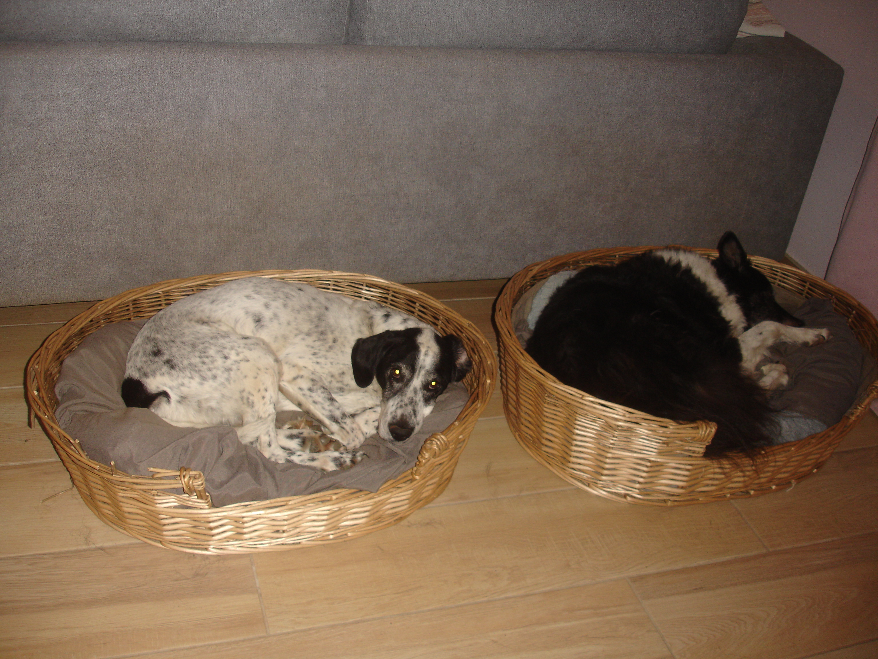 Nasha et Nolik sont toujours en pleine forme. De vrais chiens de canapé ! Il est drôle Nolik, en position assise ! On dirait qu’il veille sur Nasha qui fait sa sieste !