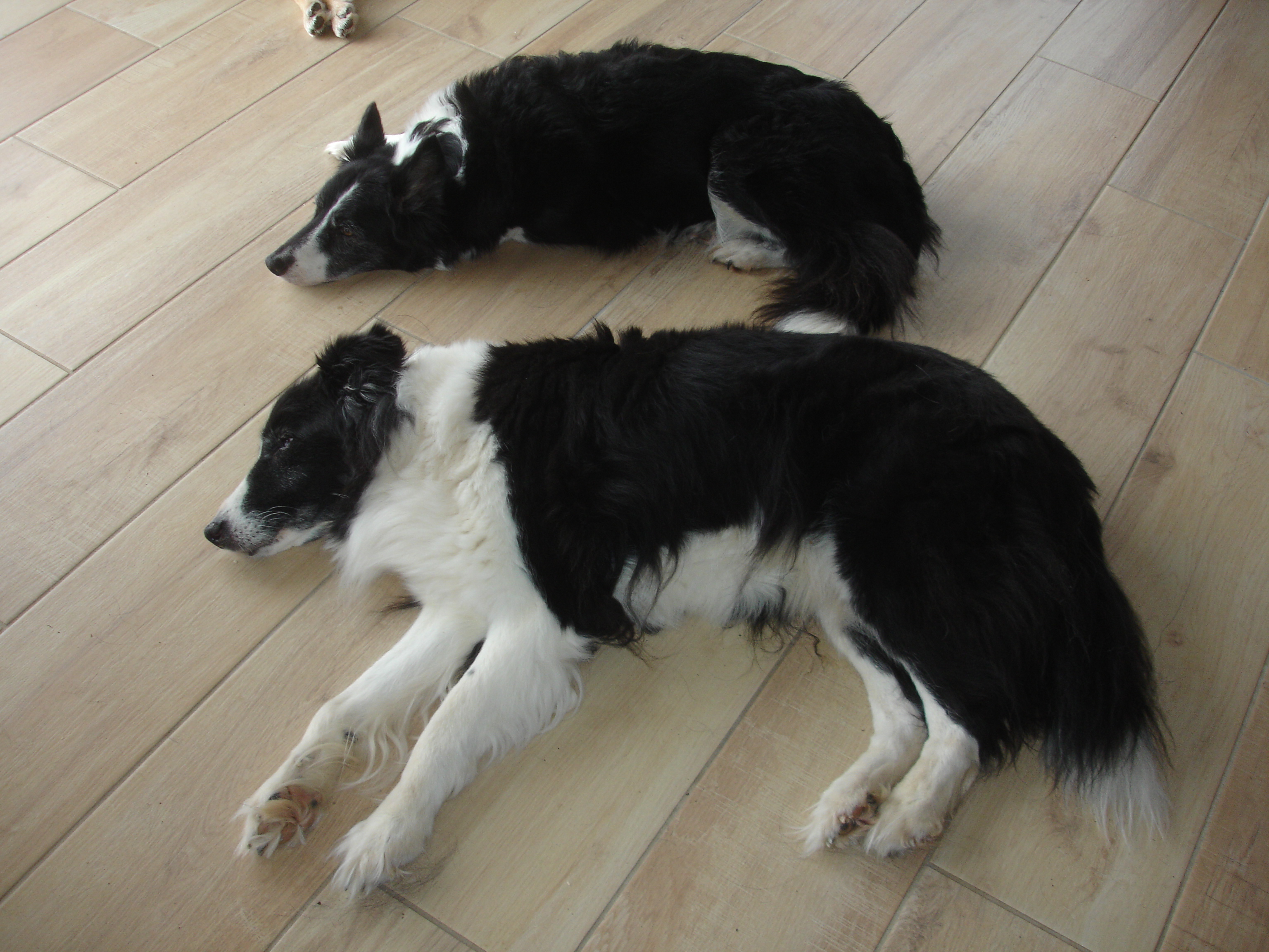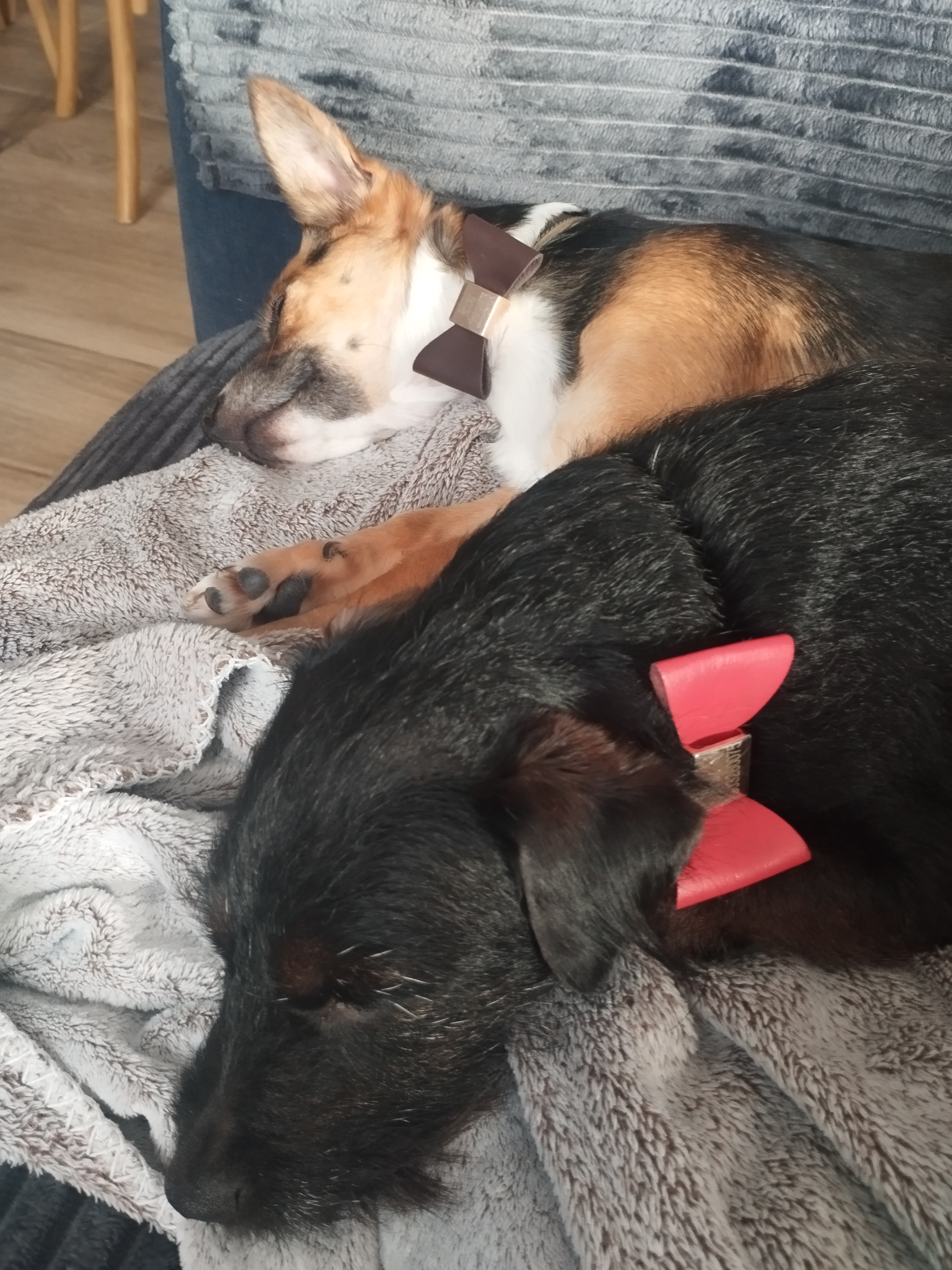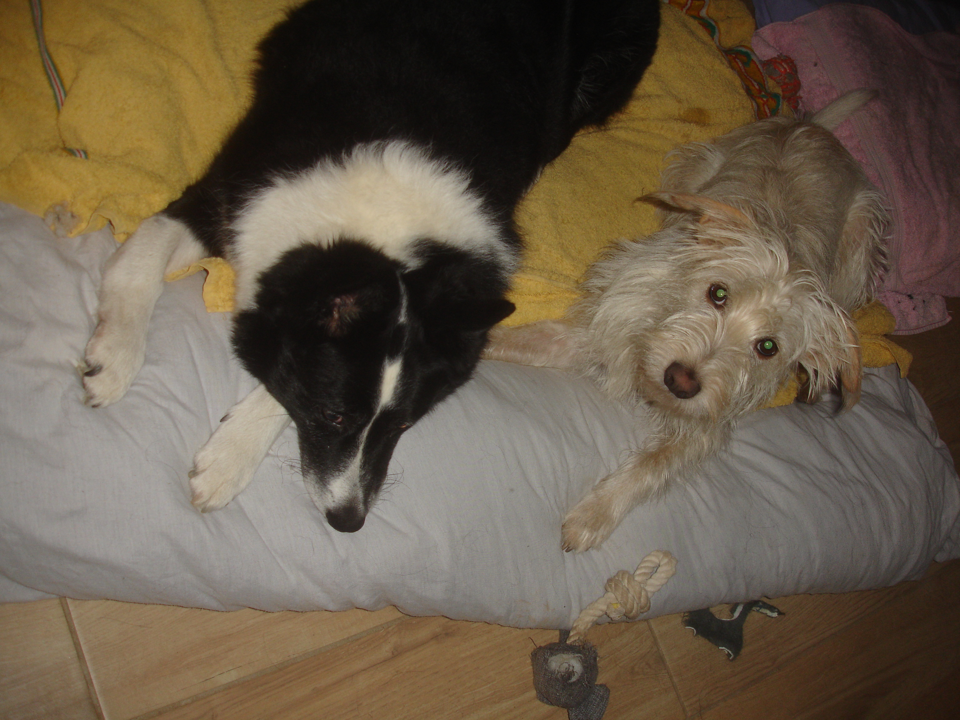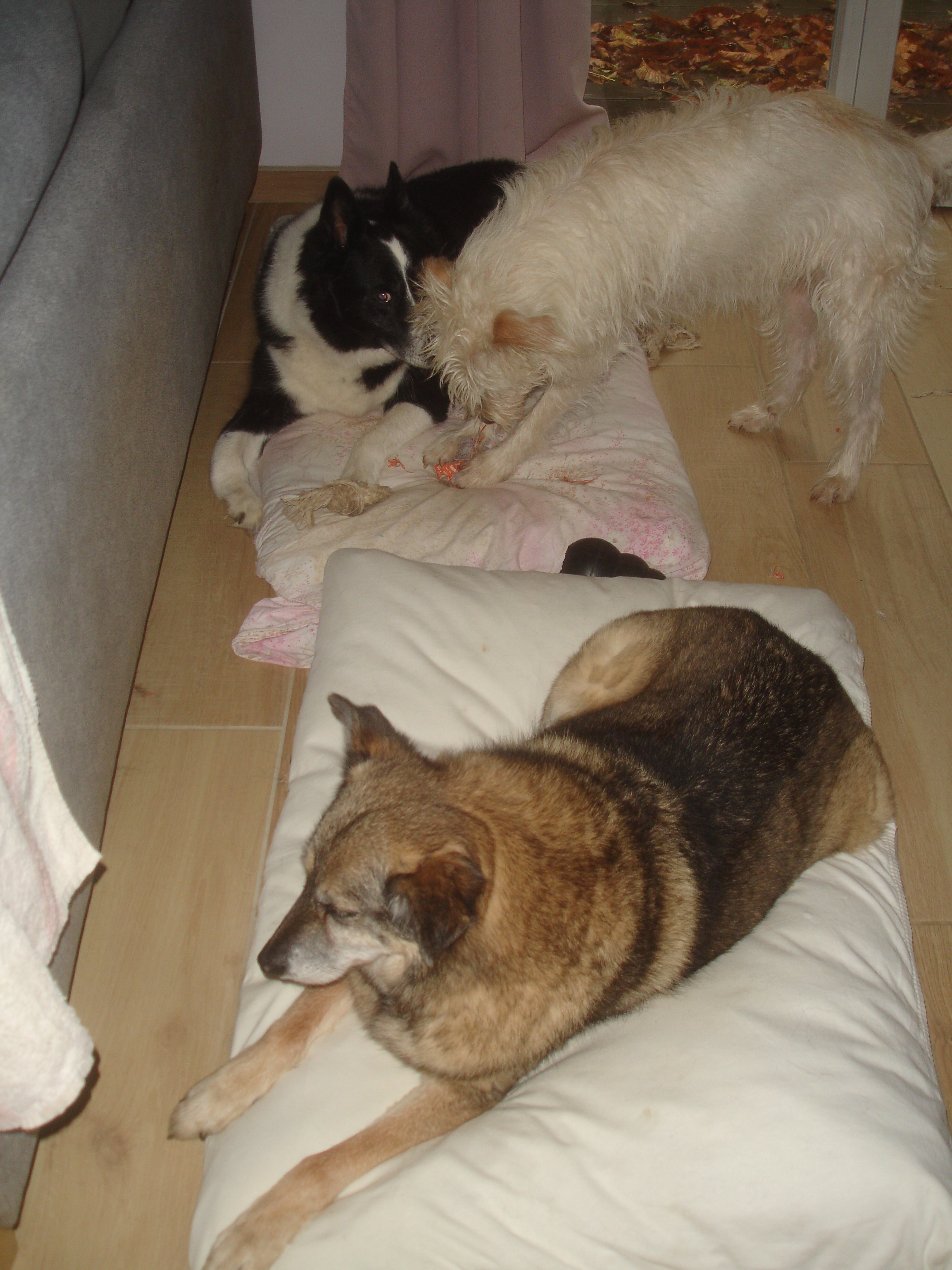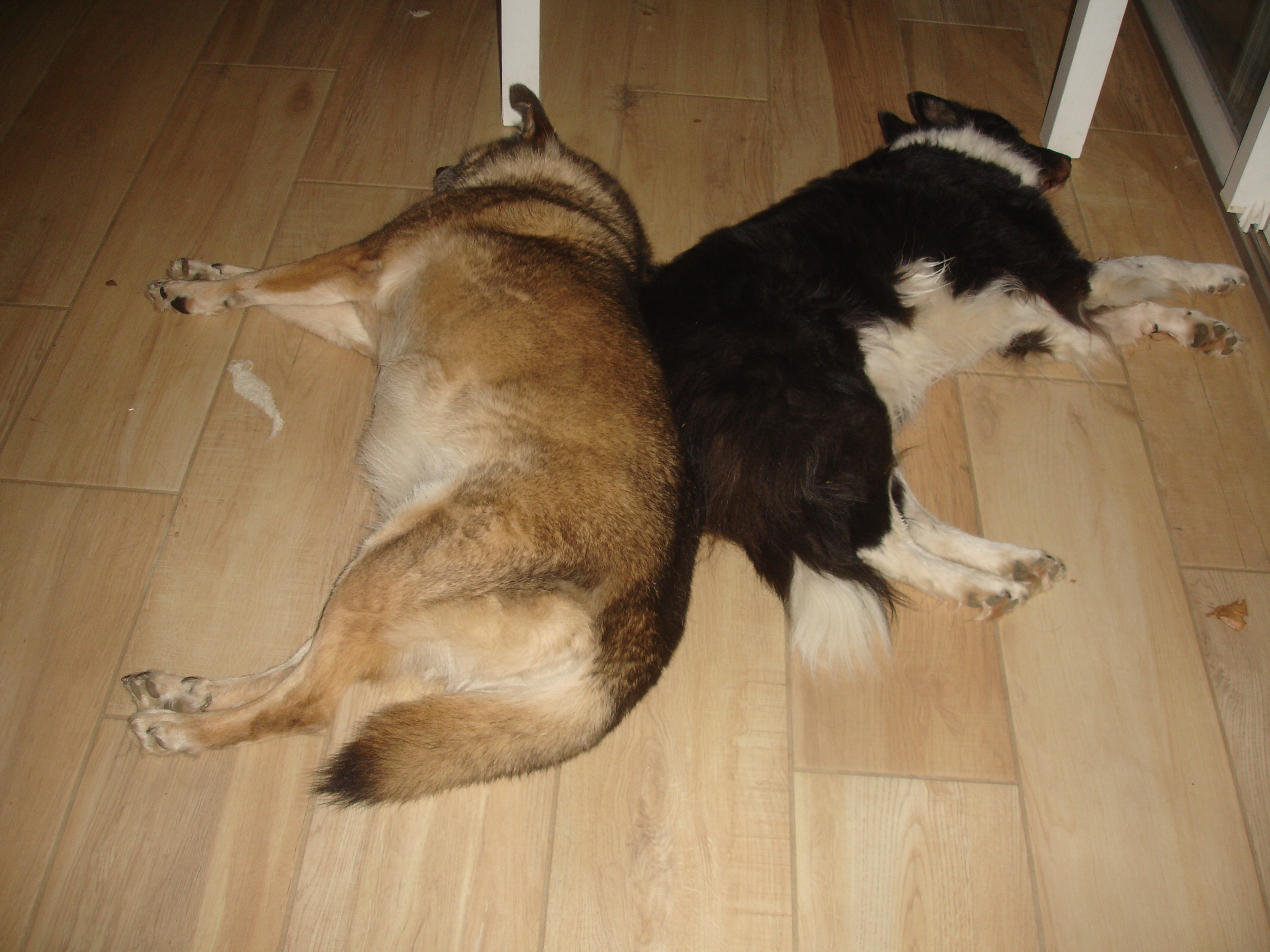 Nasha et Nolik sont toujours en pleine forme. De vrais chiens de canapé ! Il est drôle Nolik, en position assise ! On dirait qu’il veille sur Nasha qui fait sa sieste !