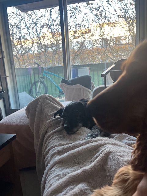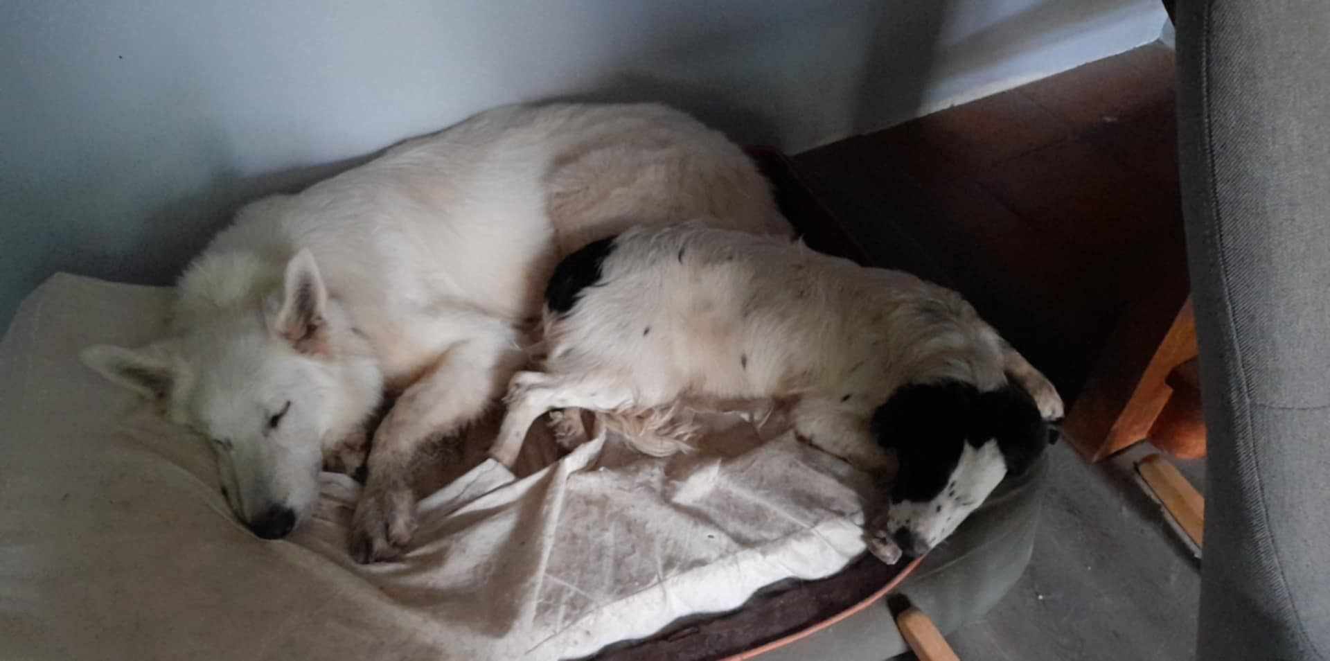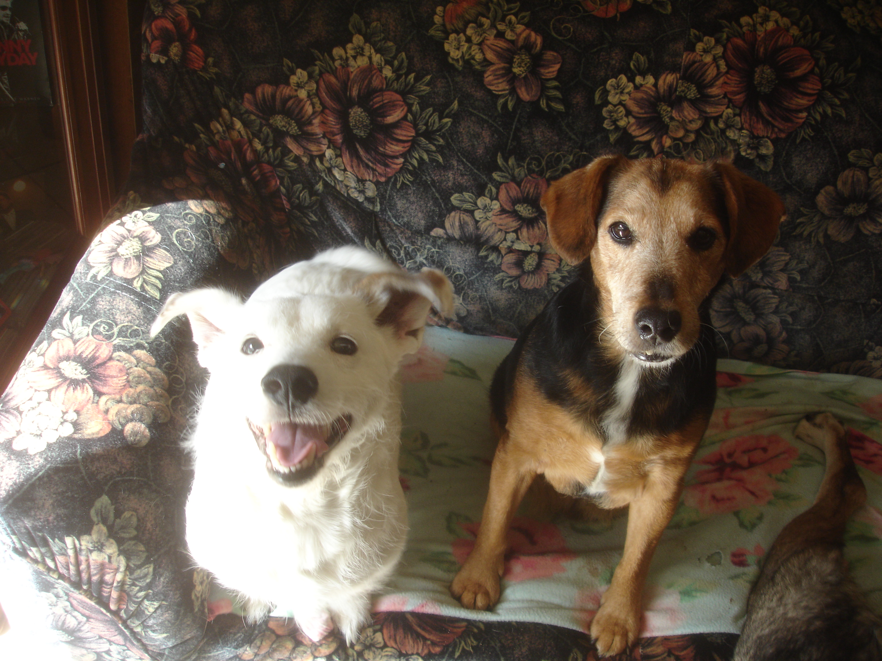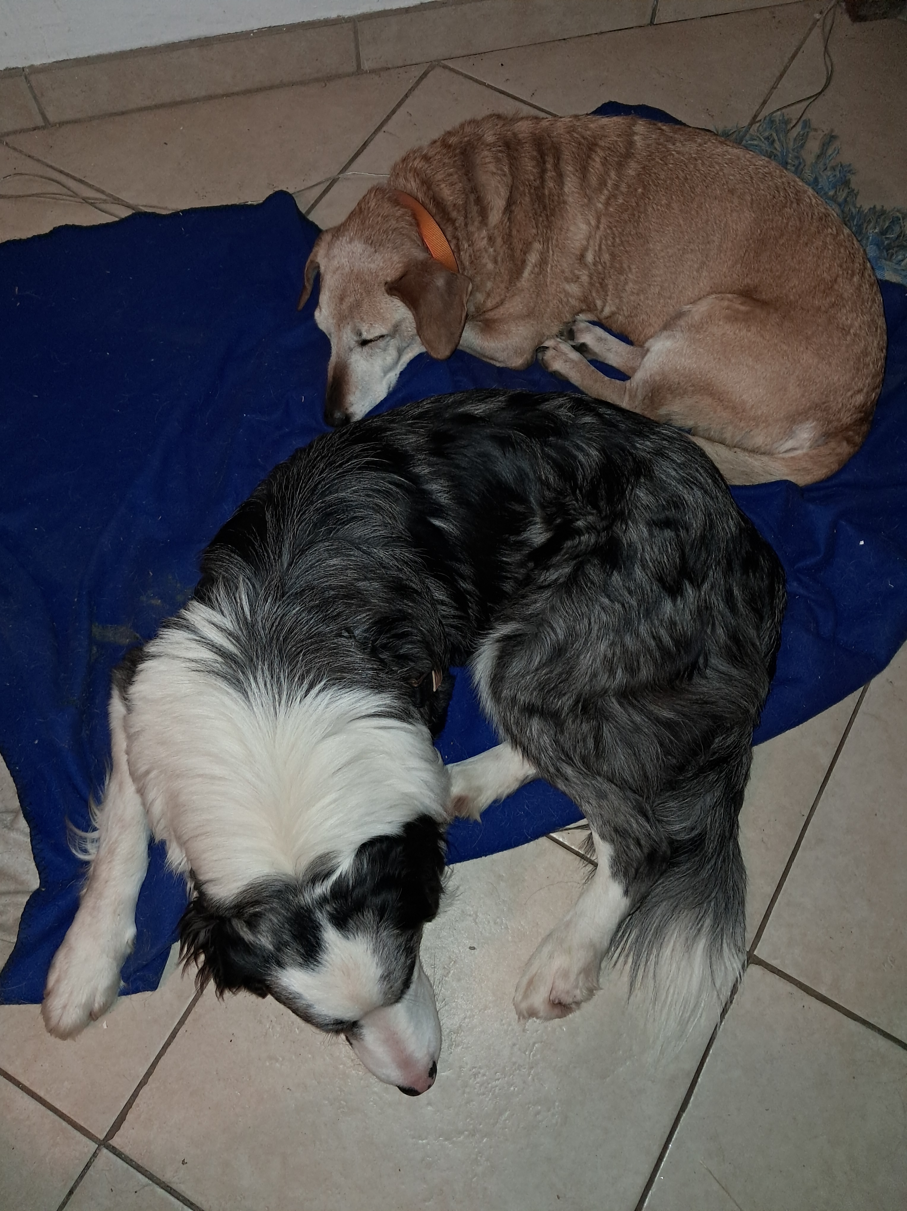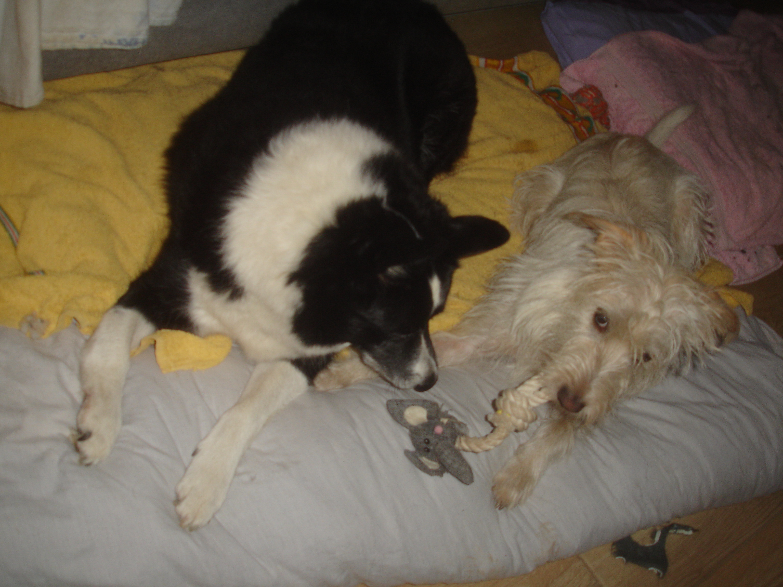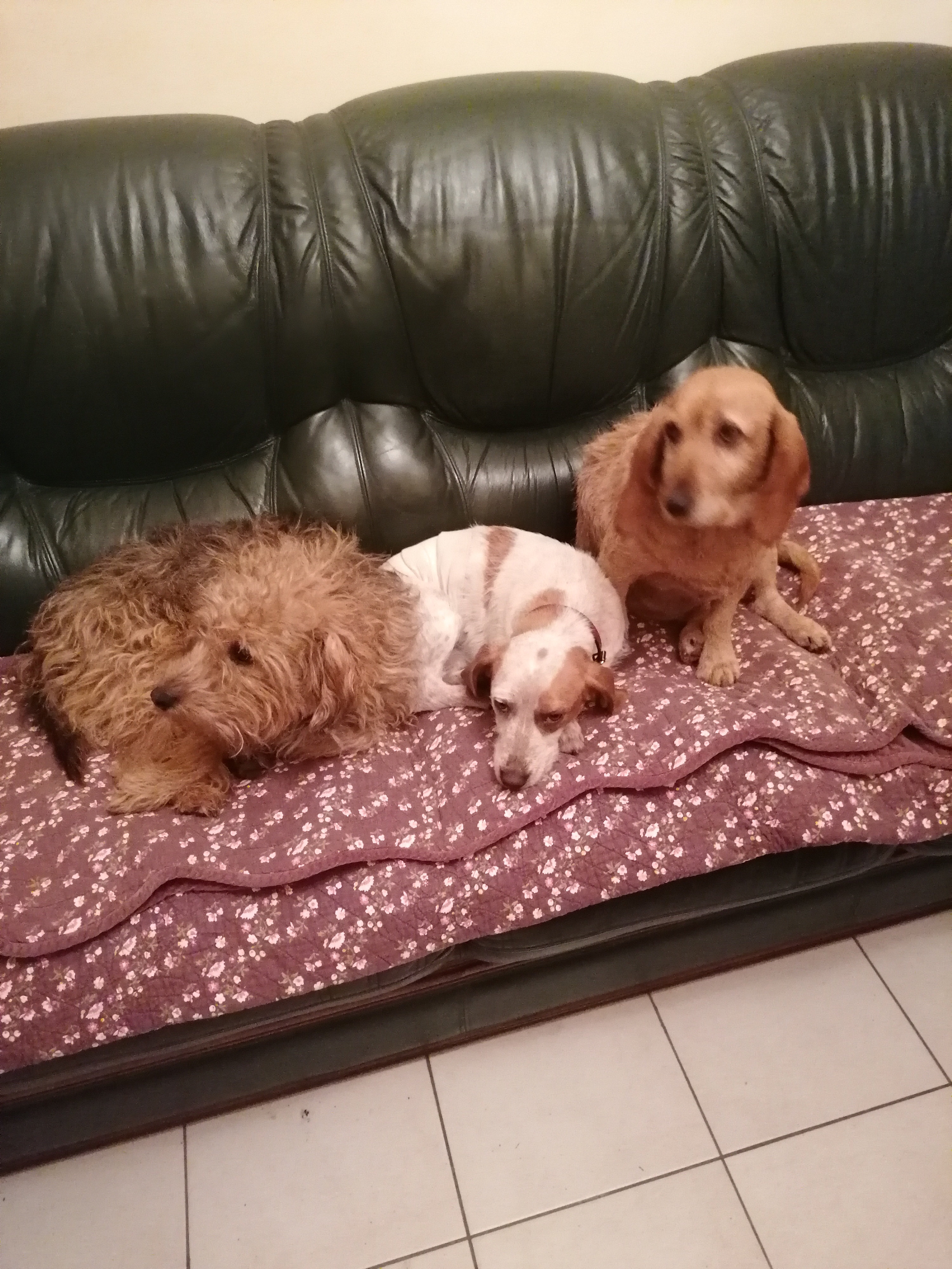 Nasha et Nolik sont toujours en pleine forme. De vrais chiens de canapé ! Il est drôle Nolik, en position assise ! On dirait qu’il veille sur Nasha qui fait sa sieste !