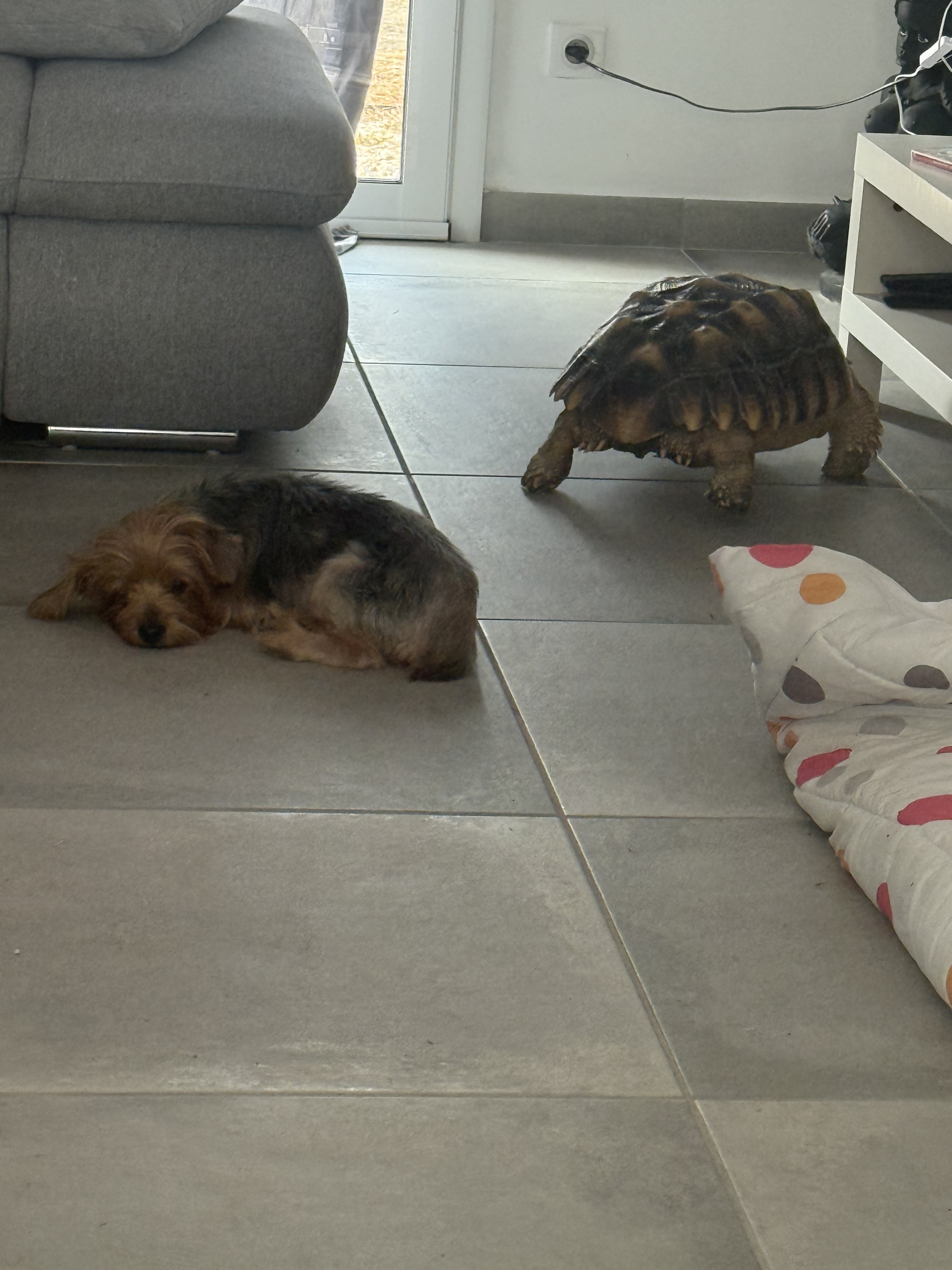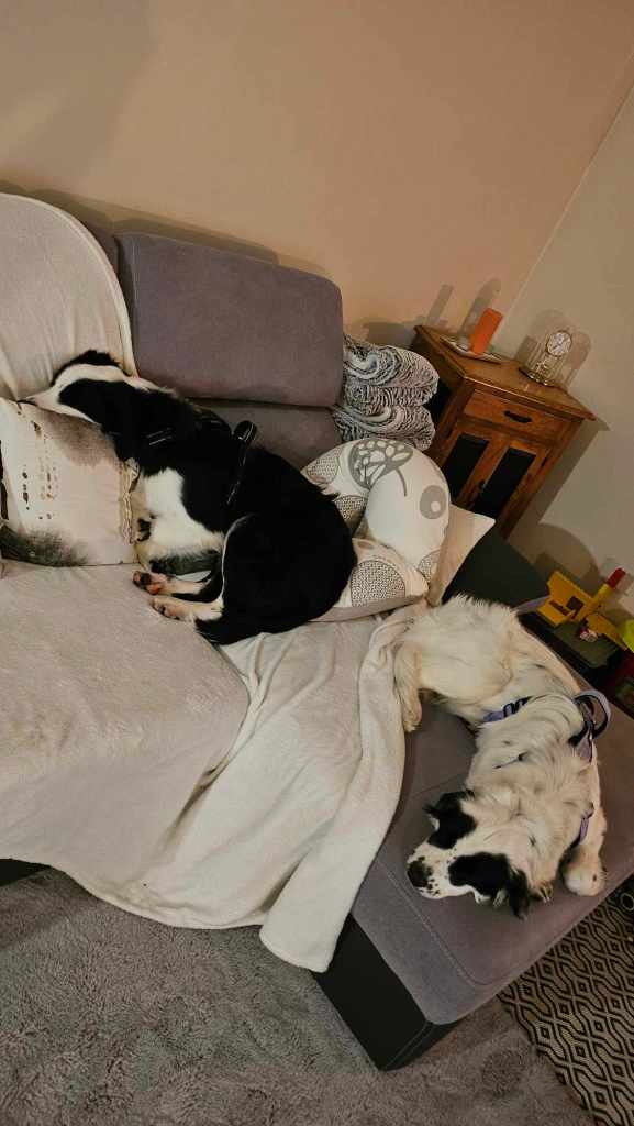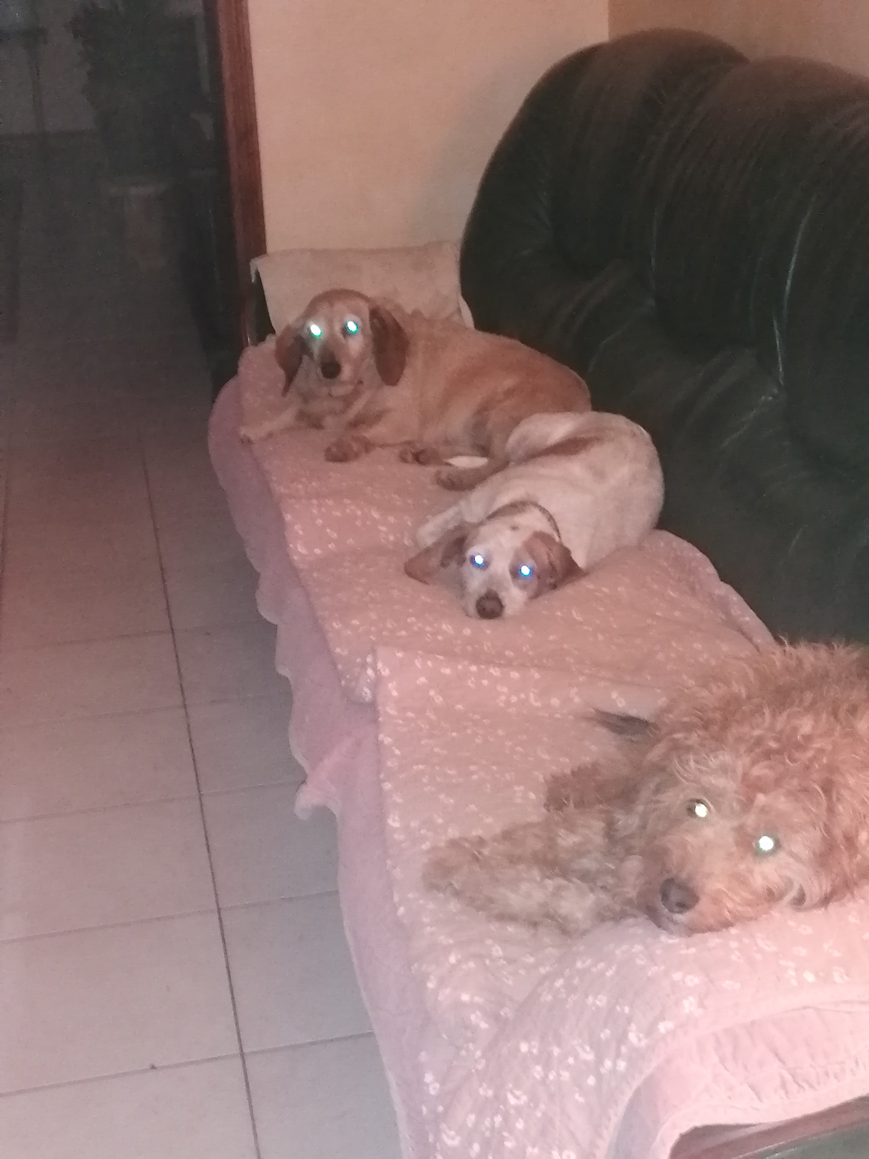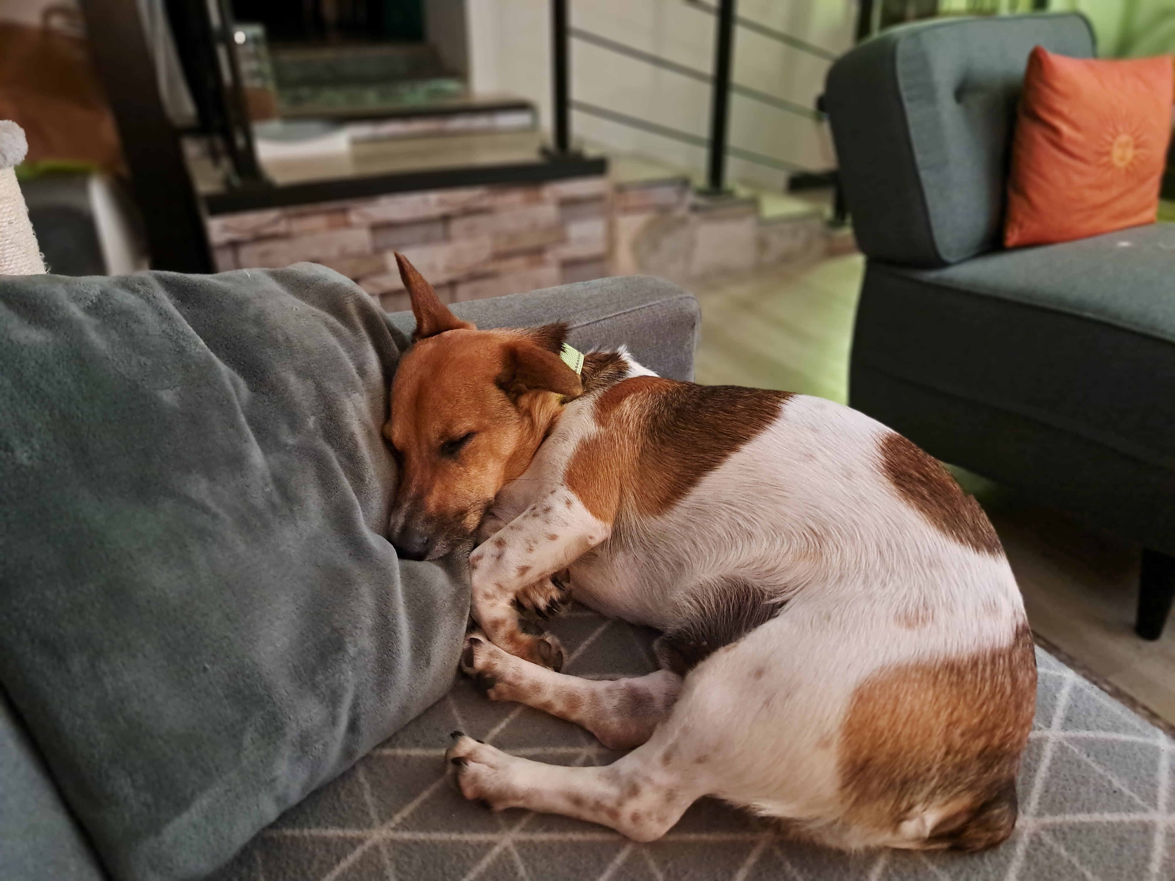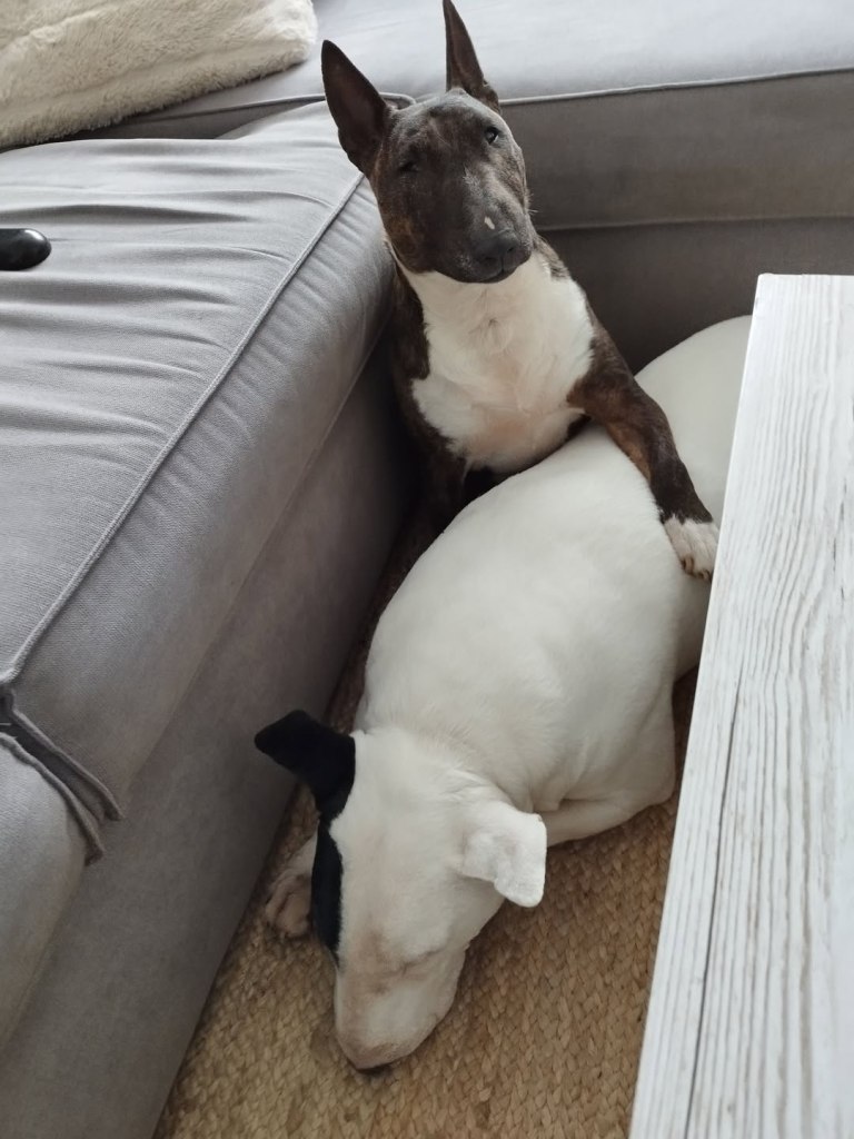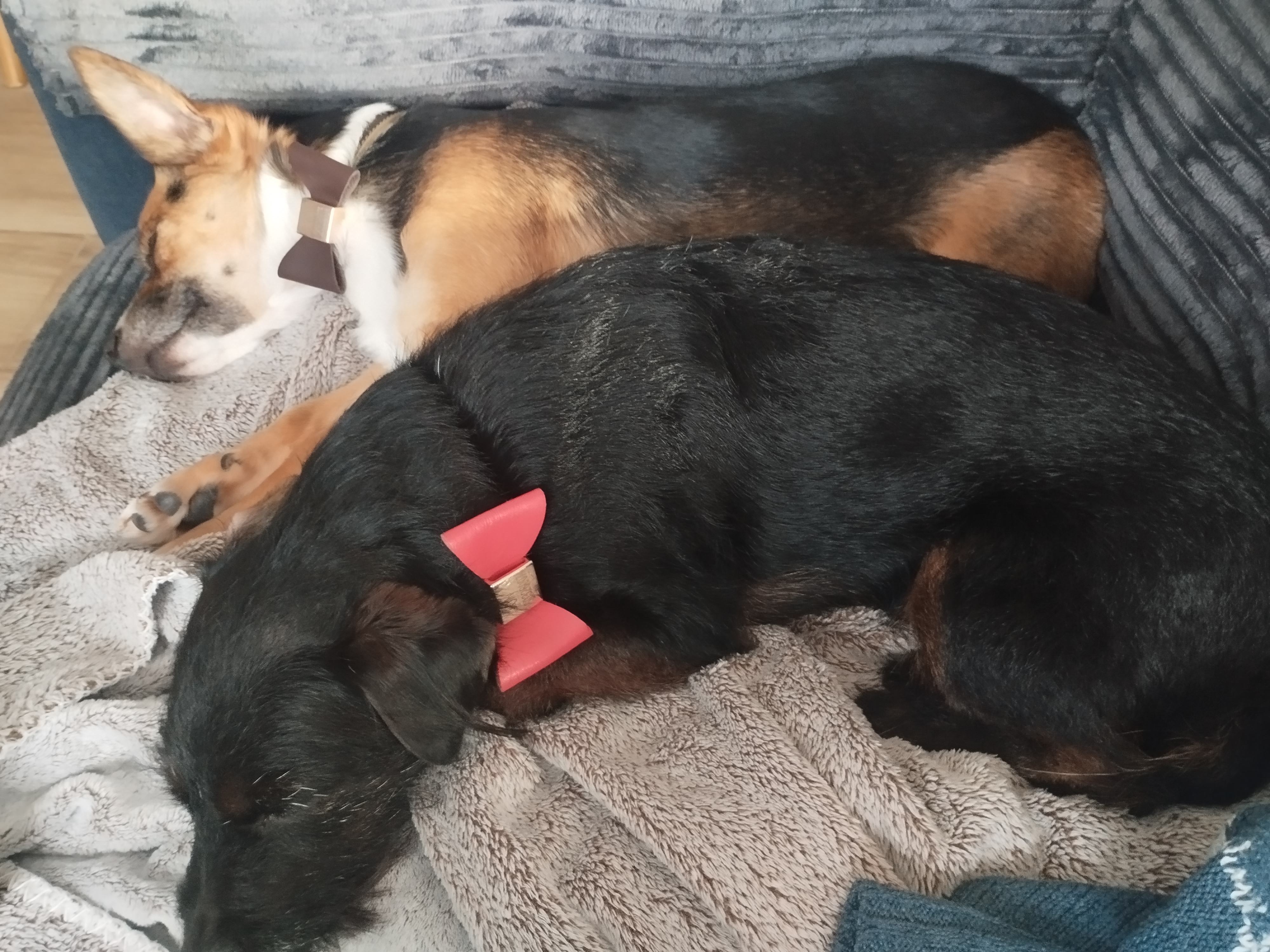 Nasha et Nolik sont toujours en pleine forme. De vrais chiens de canapé ! Il est drôle Nolik, en position assise ! On dirait qu’il veille sur Nasha qui fait sa sieste !
