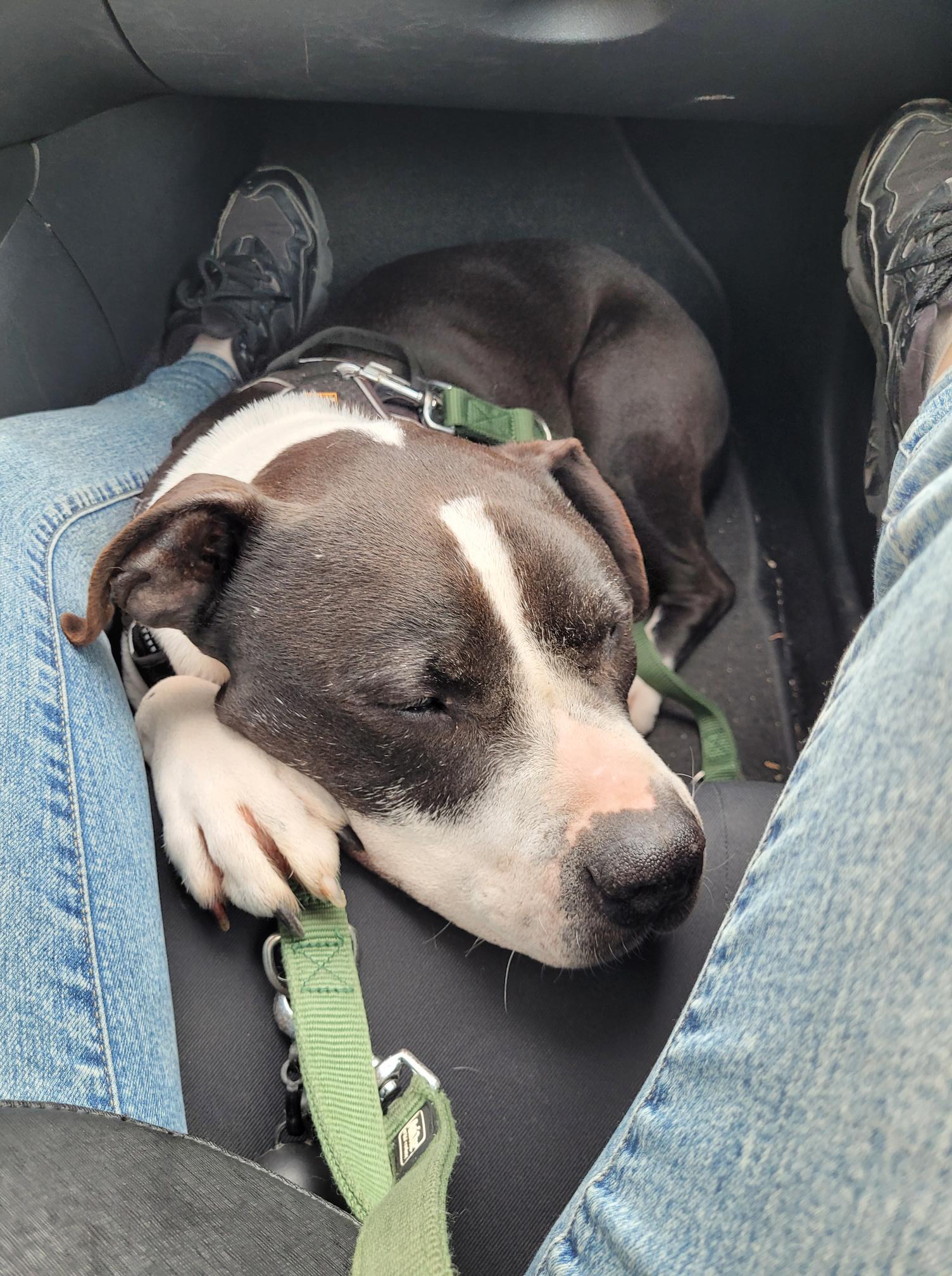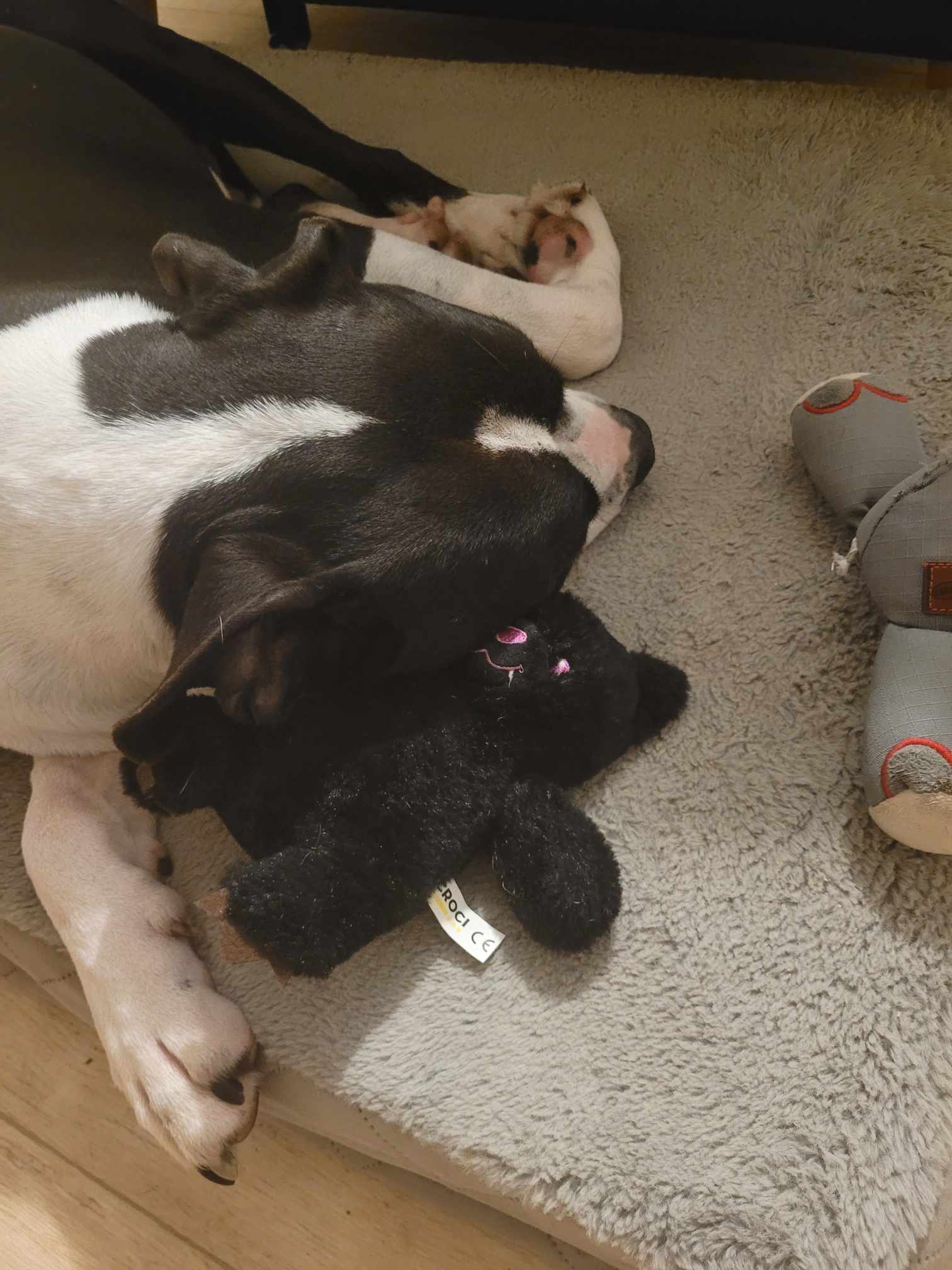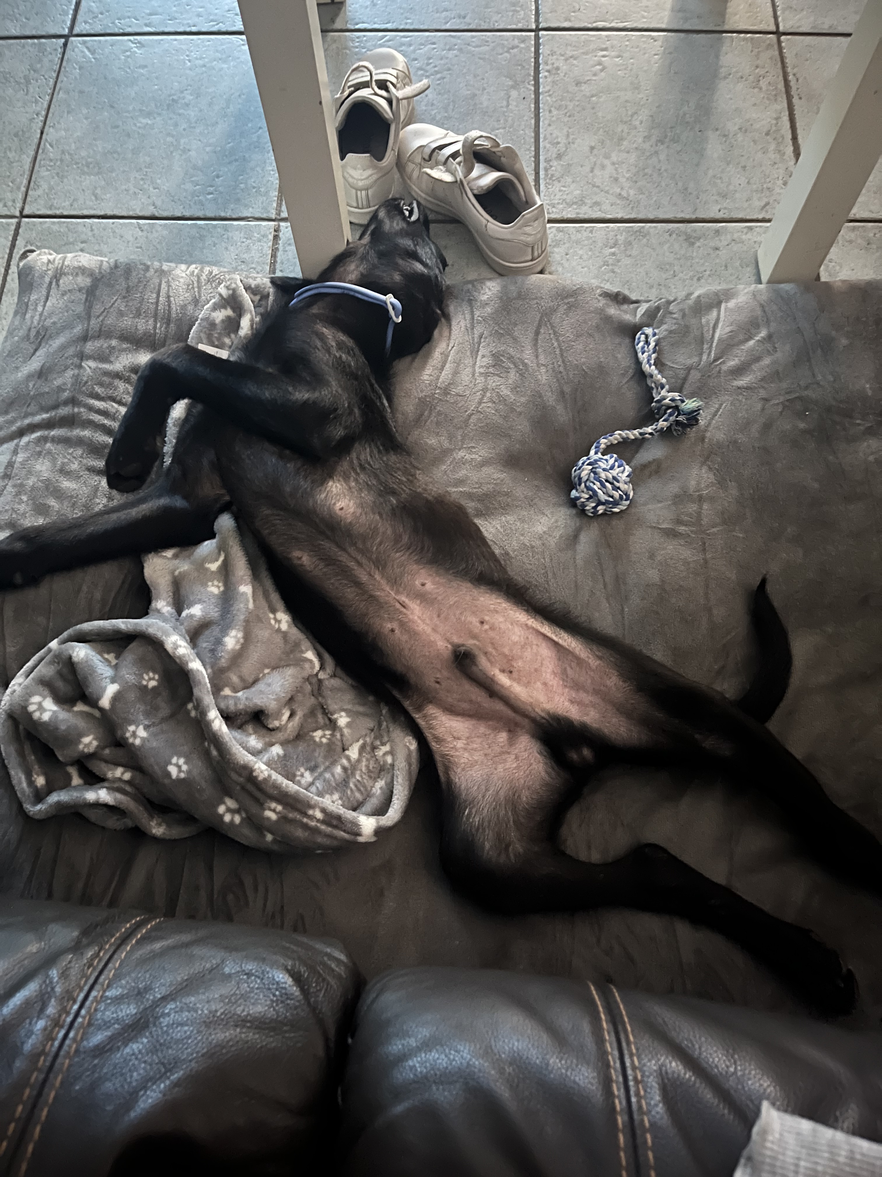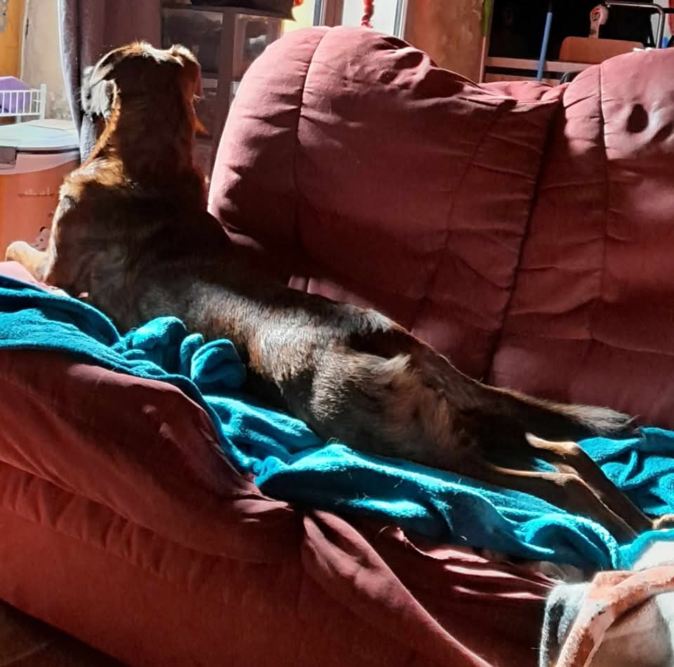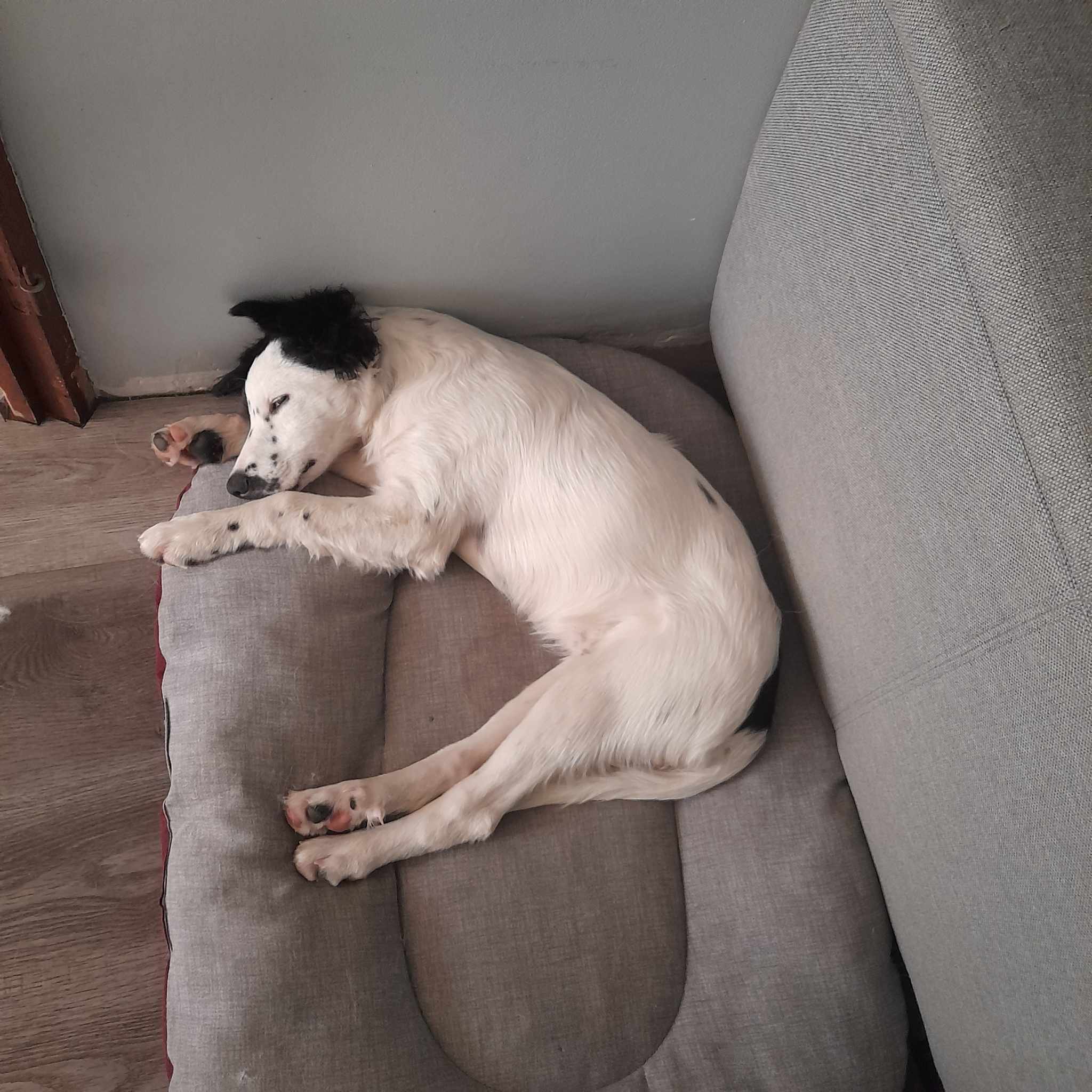 Falco a trouvé une jeune famille aimante et un nouveau copain ! Que d’émotions le jour de son départ : Falco était une vraie pile et s’agitait dans tous les sens ! Il semblait tellement joyeux de partir ! Impossible de le photographier correctement, même installé dans la voiture ! Depuis, la vie de famille semble l’avoir calmé : une bonne sieste sur le canapé avec ceux que l’on aime, c’est inestimable !