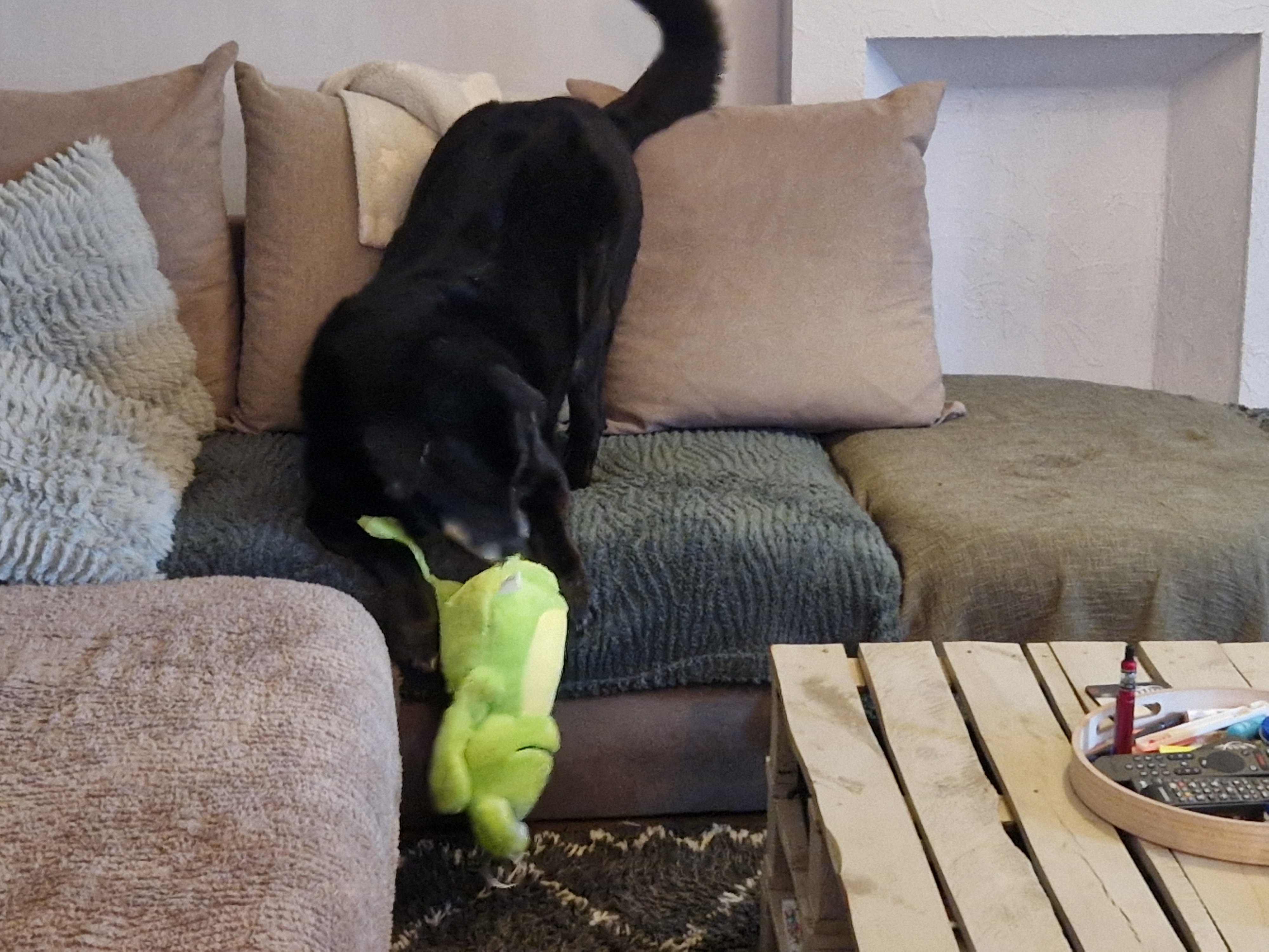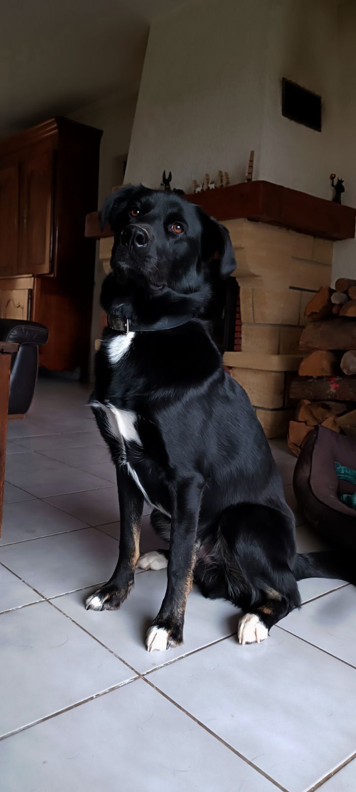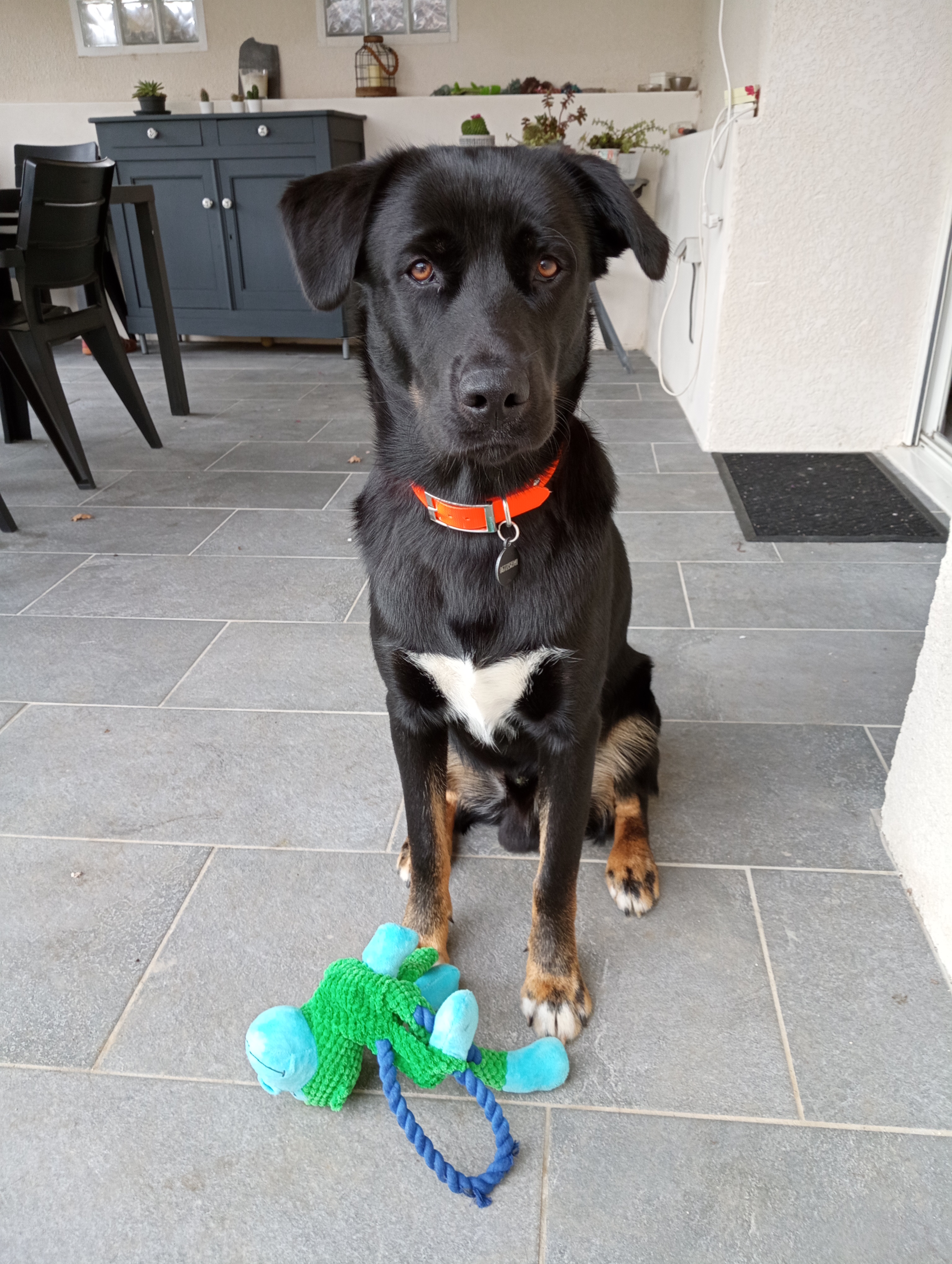 . Il n’a pas encore totalement terminé sa croissance. Il est très joueur, un vrai petit clown. Et un petit chapardeur, gare à ce qu’on laisse traîner et aux bêtises trouvées dehors