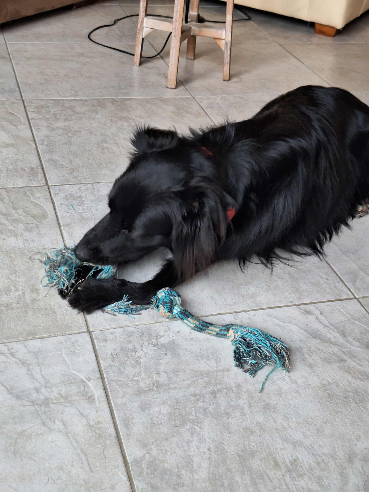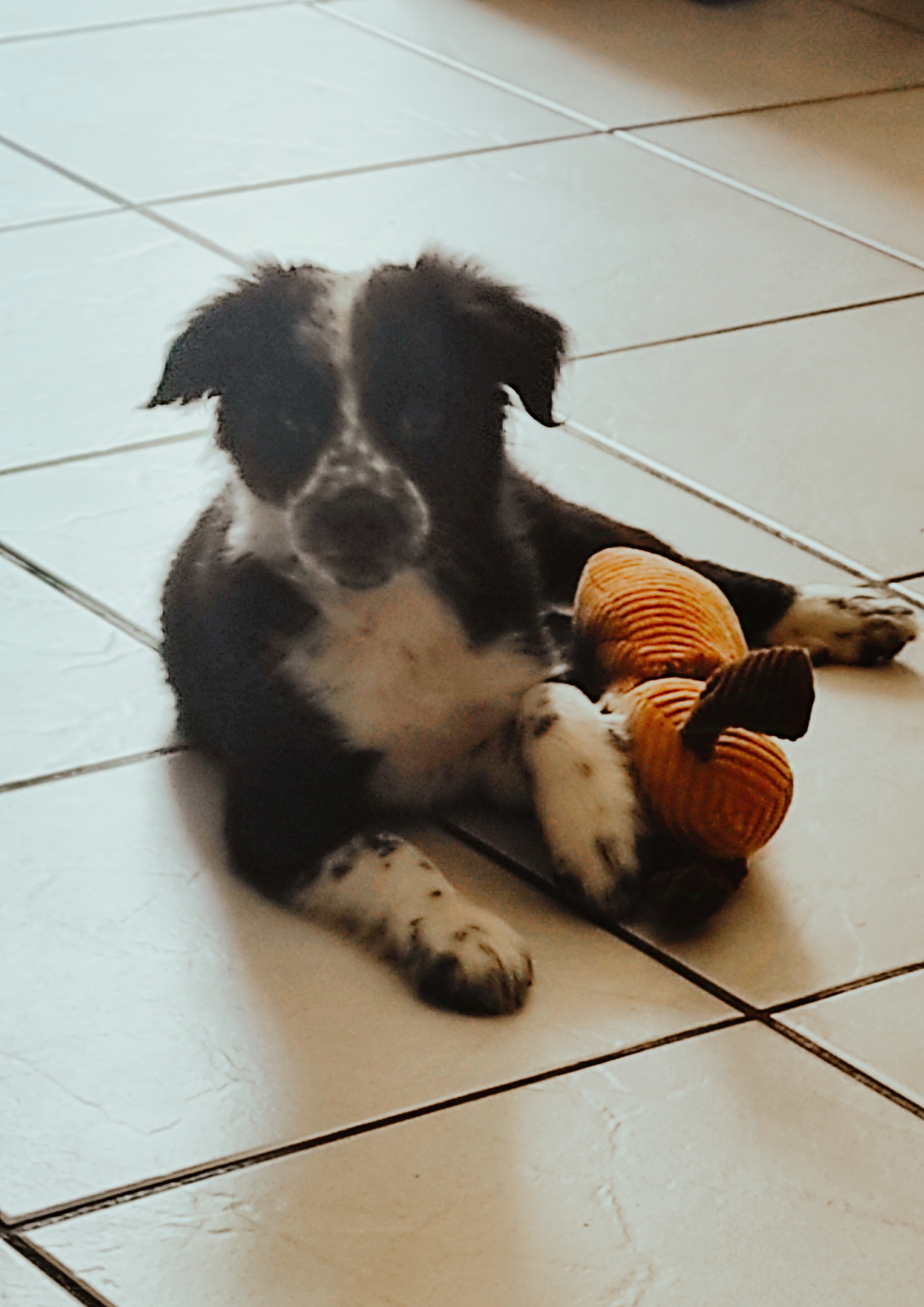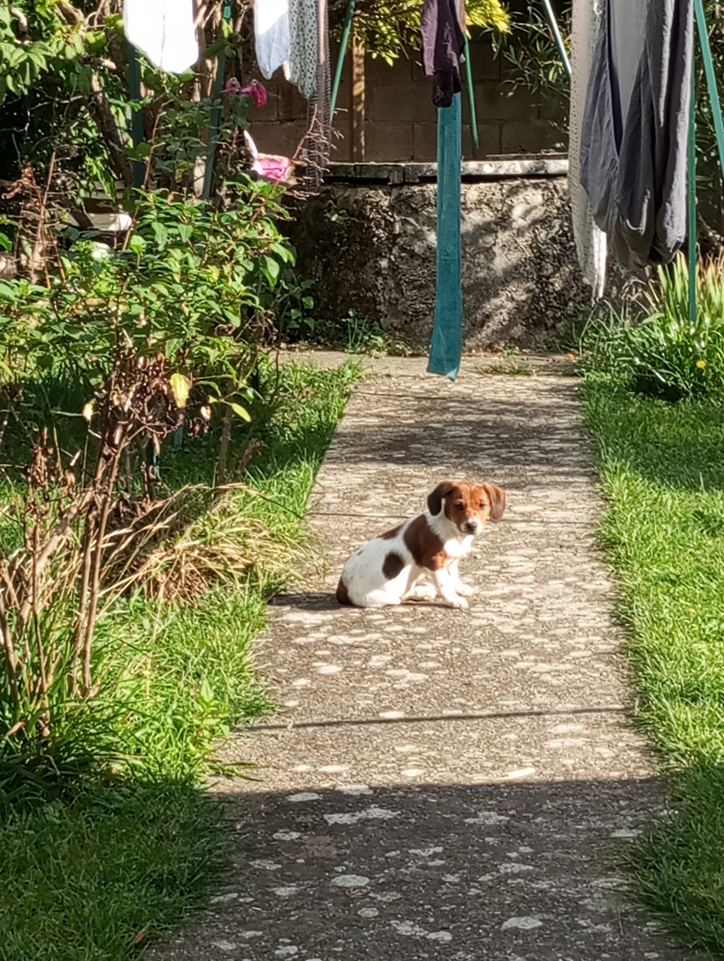 . Il n’a pas encore totalement terminé sa croissance. Il est très joueur, un vrai petit clown. Et un petit chapardeur, gare à ce qu’on laisse traîner et aux bêtises trouvées dehors