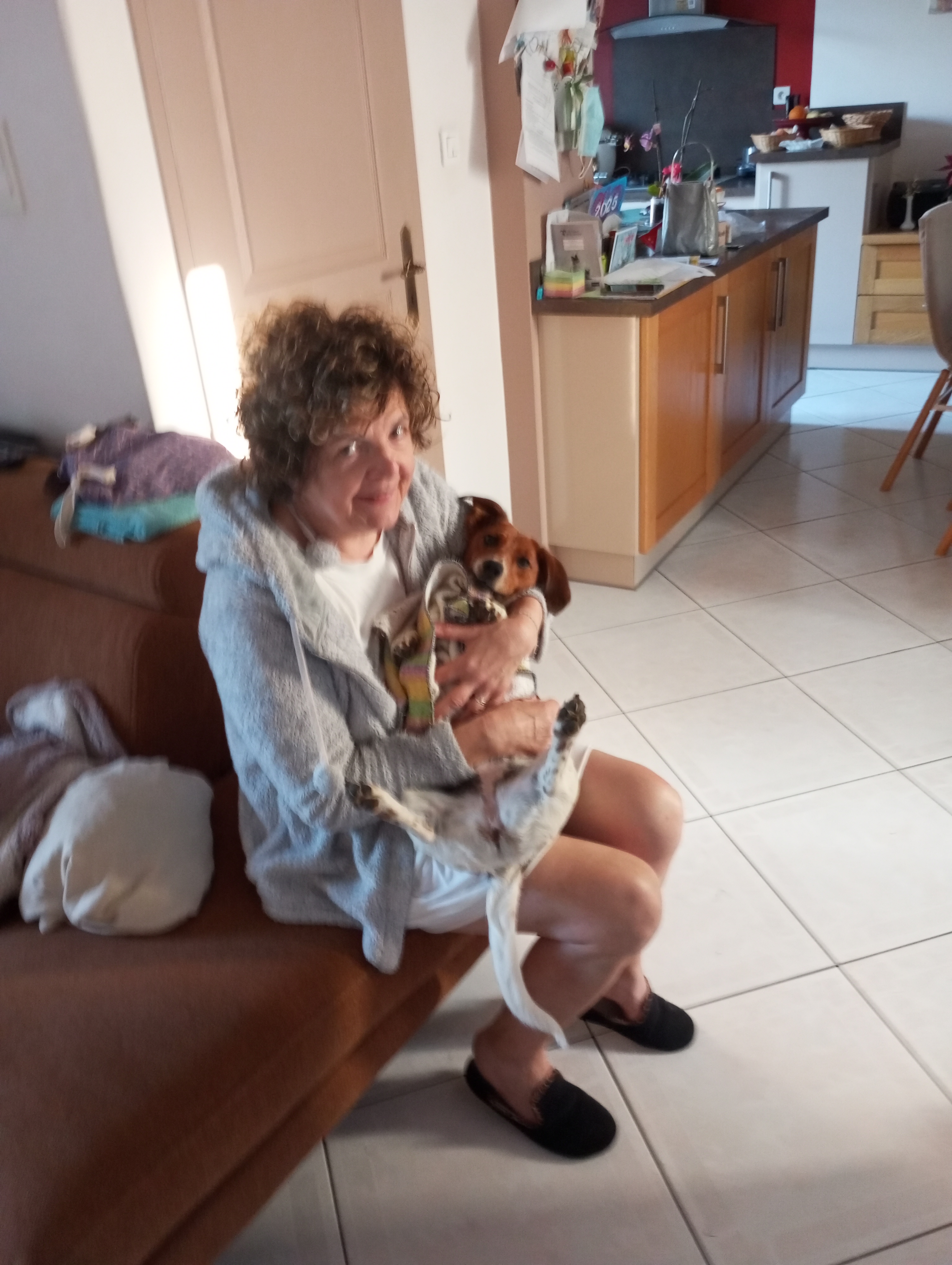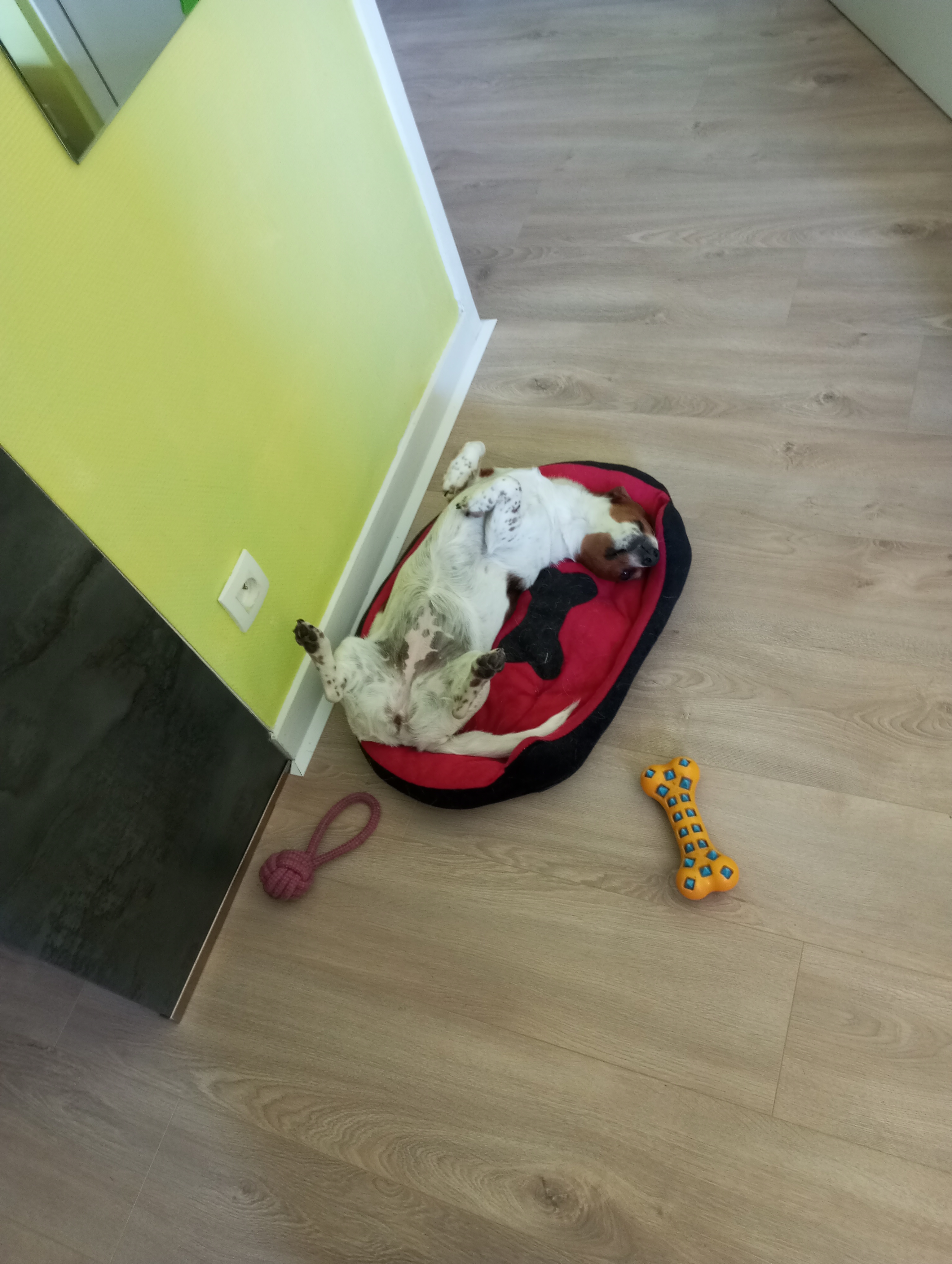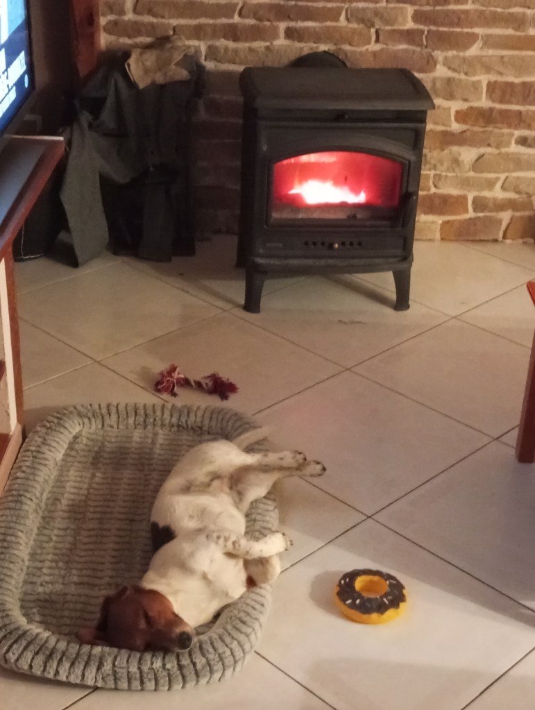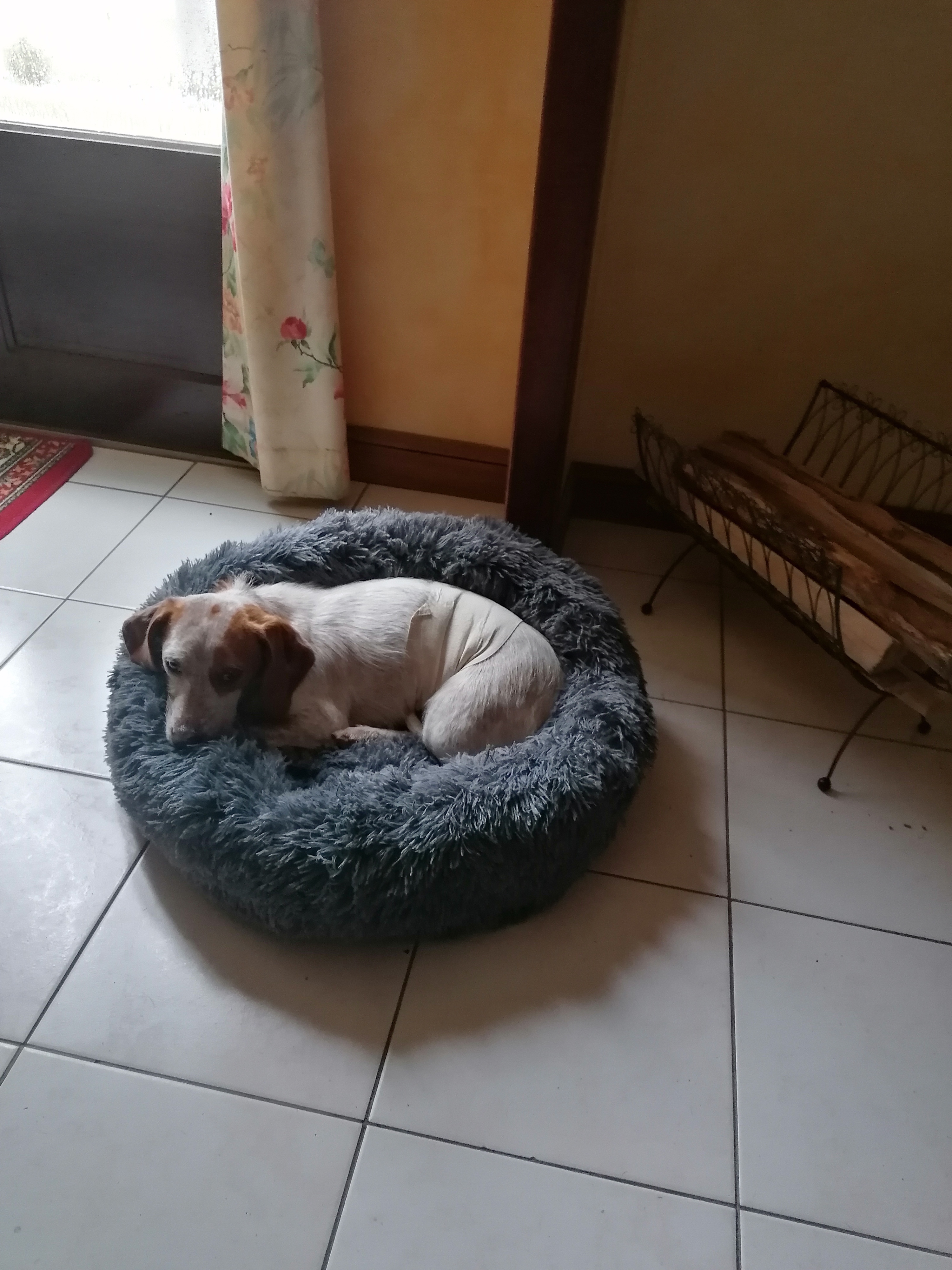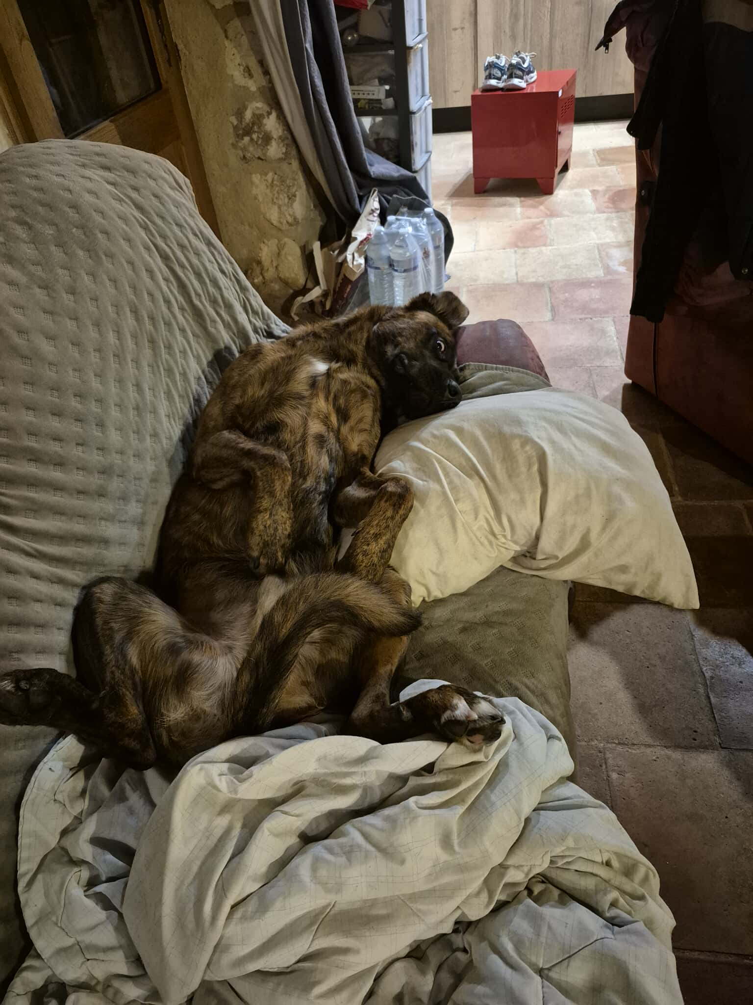 Tout se passe bien pour Rita : elle s’entend très bien avec notre chienne Minie. C’est un peu plus compliqué avec le chat mais c’est plutôt de son côté à lui qu’il y a du travail à faire… Car Rita est très douce y compris avec les enfants. Comme vous pouvez voir sur la photo ci-jointe elle ne sera pas malheureuse ici, surtout près du poêle !!! Je vous tiens au courant pour la suite. Bonne soirée et merci pour tout ce que vous faites pour tous ces petits cœurs abandonnés !
