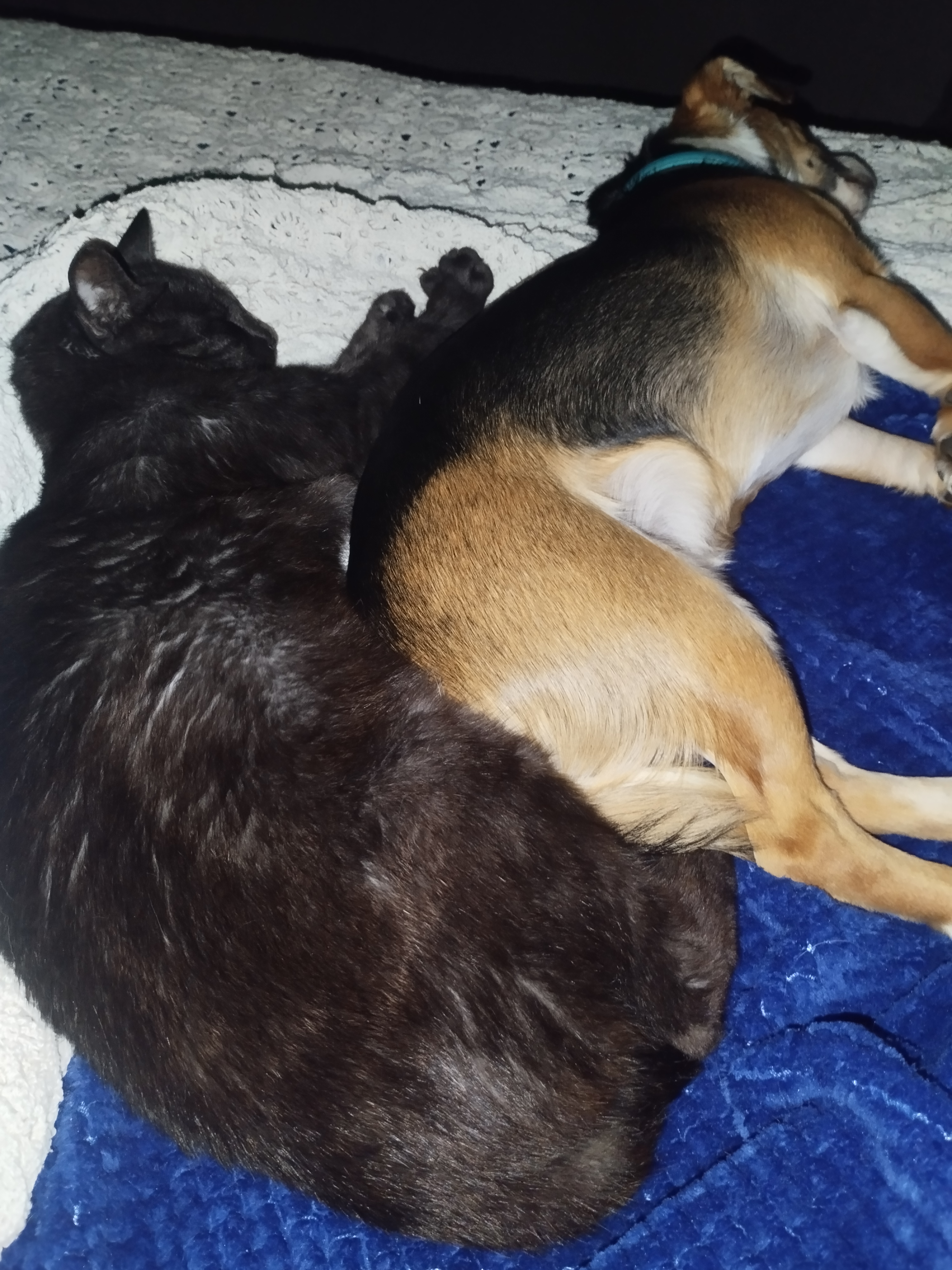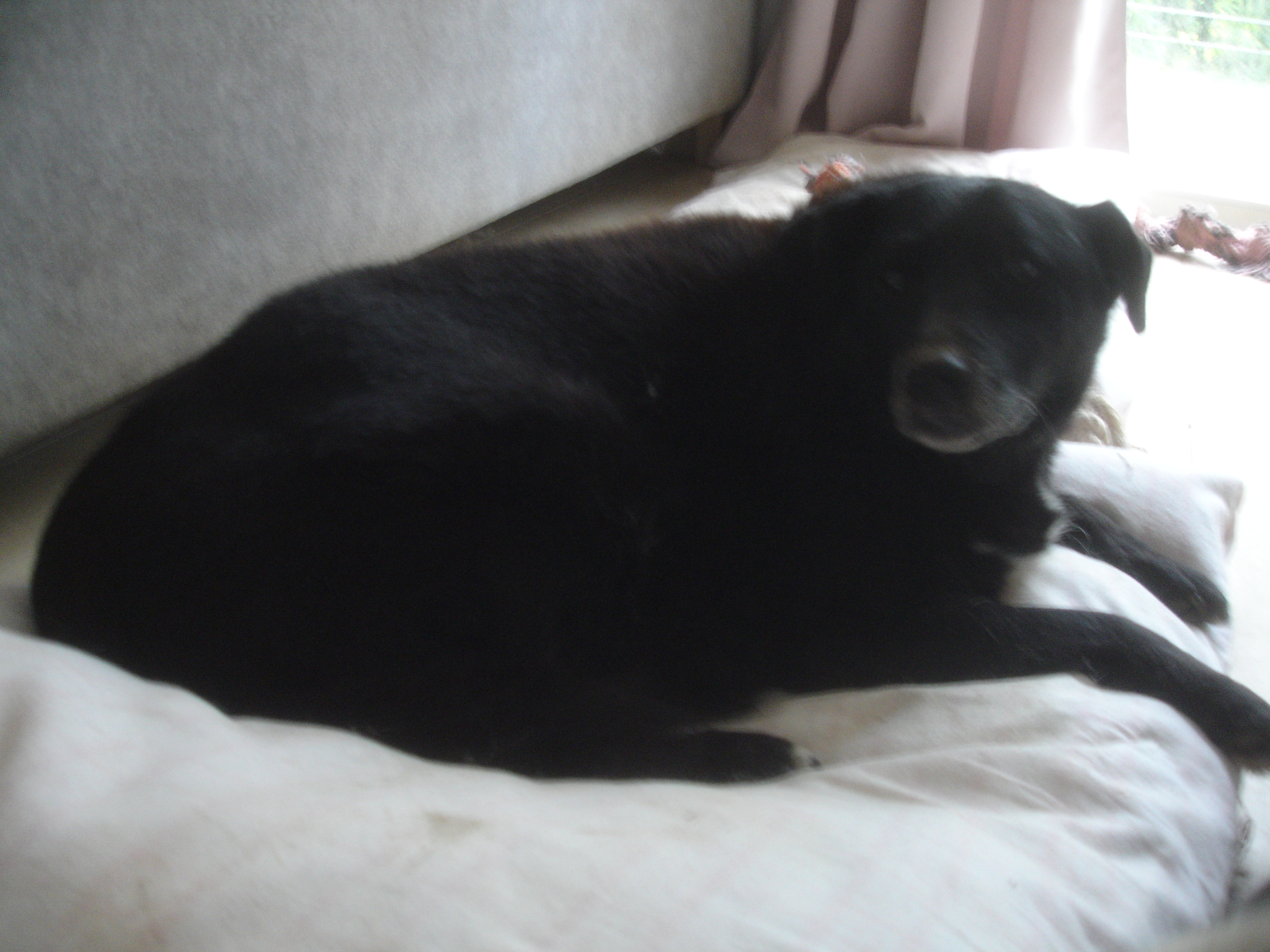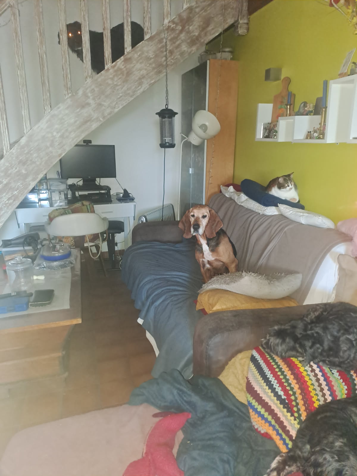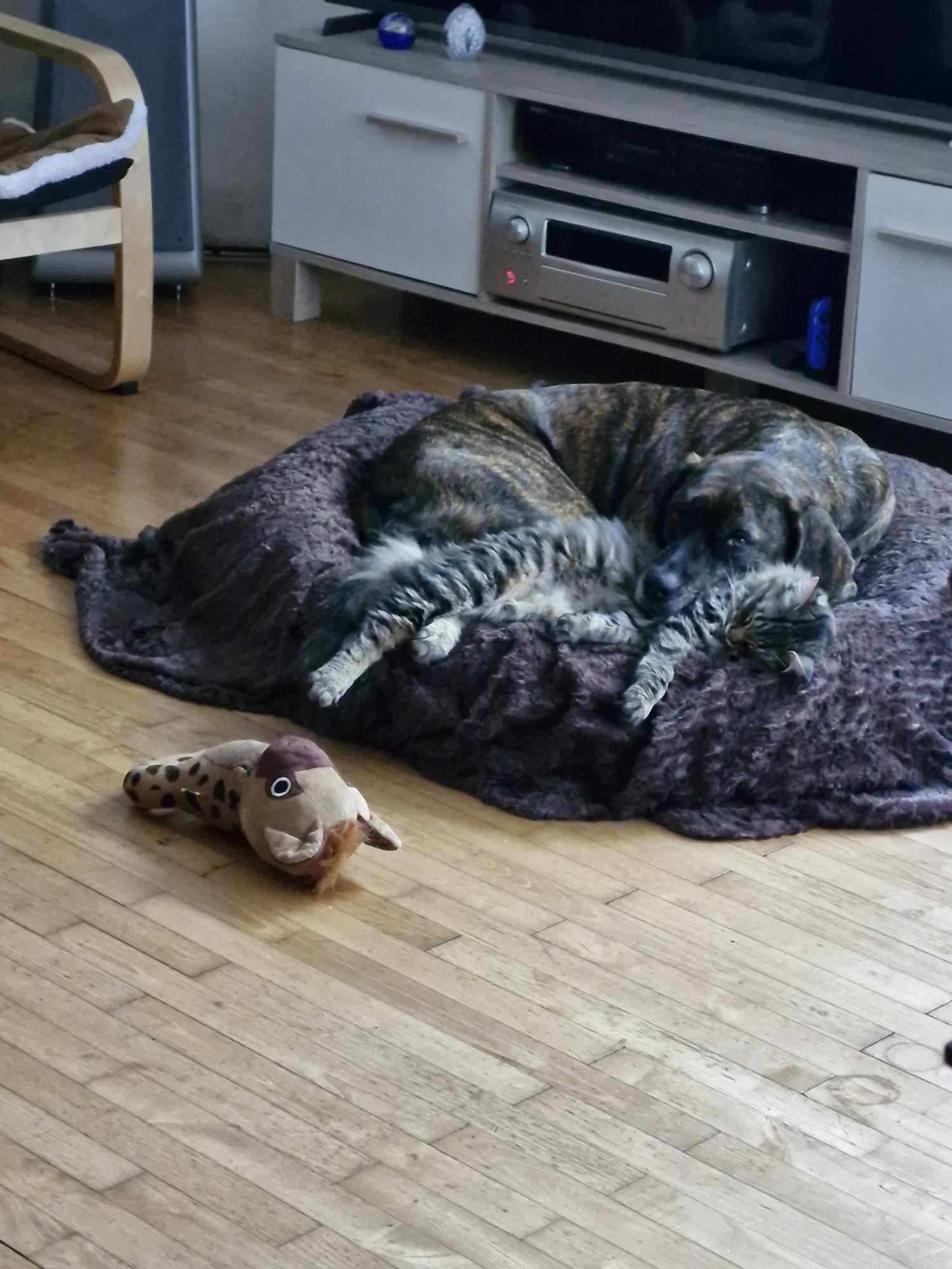 Tout se passe bien pour Rita : elle s’entend très bien avec notre chienne Minie. C’est un peu plus compliqué avec le chat mais c’est plutôt de son côté à lui qu’il y a du travail à faire… Car Rita est très douce y compris avec les enfants. Comme vous pouvez voir sur la photo ci-jointe elle ne sera pas malheureuse ici, surtout près du poêle !!! Je vous tiens au courant pour la suite. Bonne soirée et merci pour tout ce que vous faites pour tous ces petits cœurs abandonnés !
