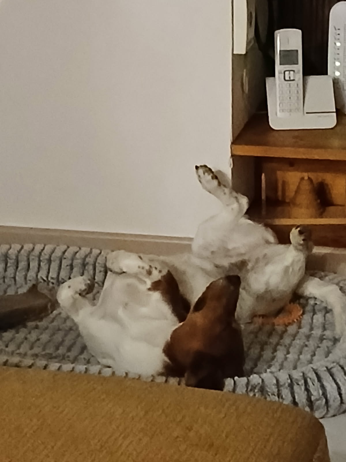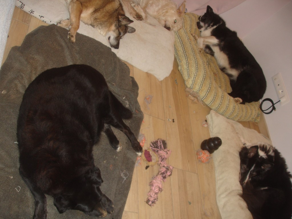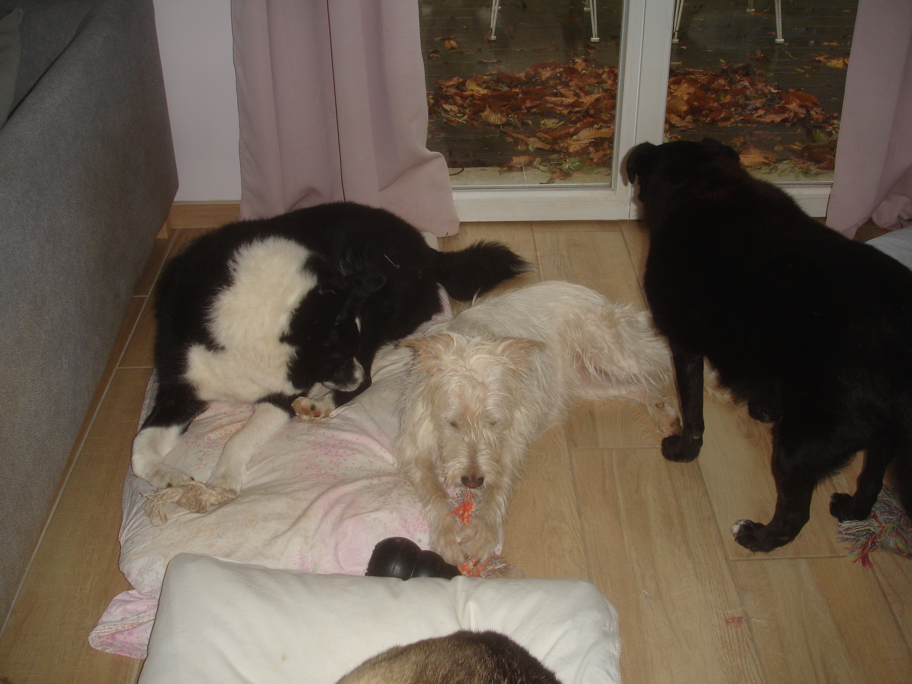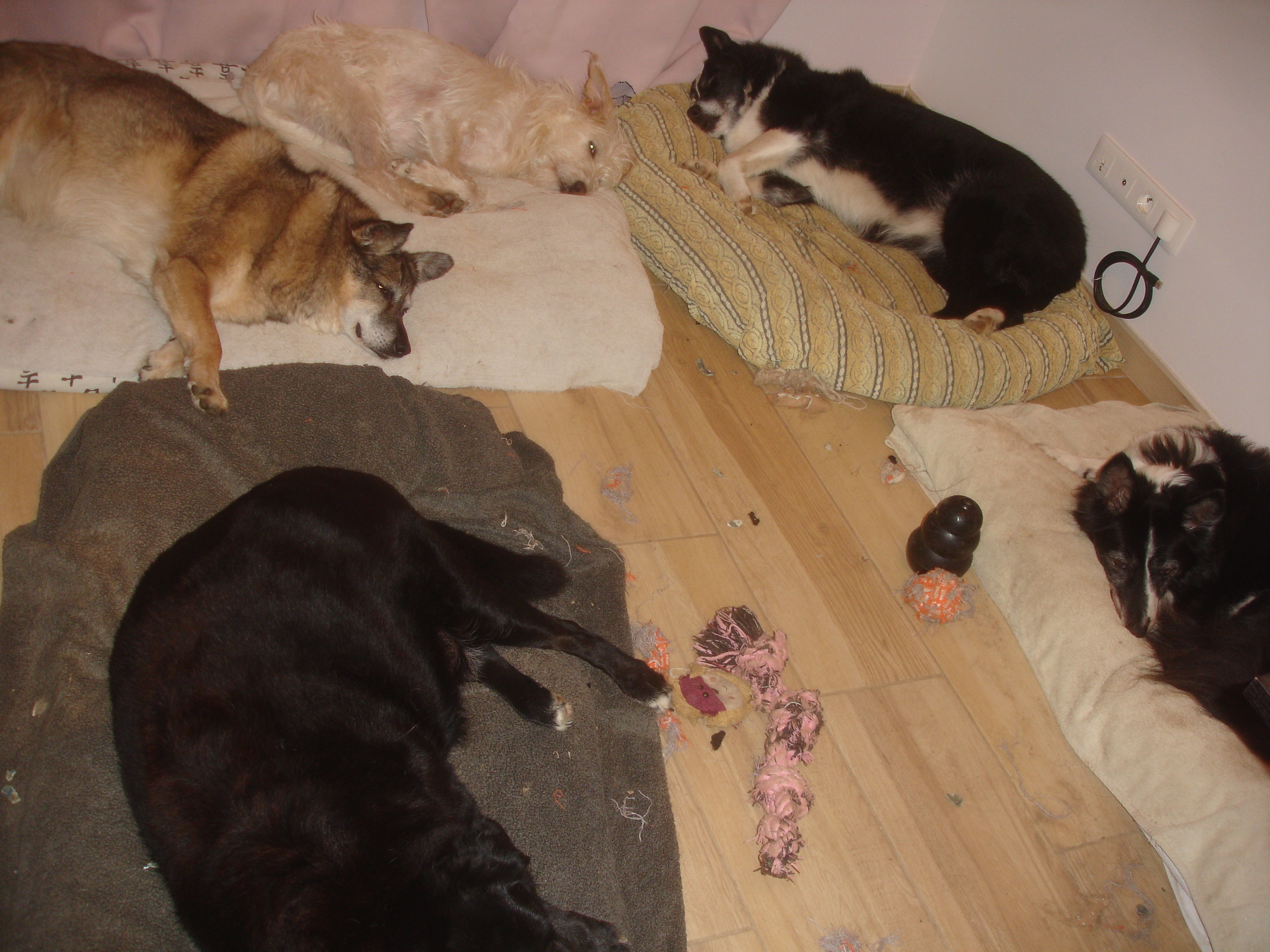 Quel bazar ! Après avoir joué et démonté les jouets, tout le monde se repose ! Bella et sa complice Téquila sont à l’origine de ce désordre ! Inséparables ces deux-là ! Jagger, Lola et Gaya ont surtout été spectateurs. Tout ce petit monde s’entend parfaitement bien, malgré les différences d’âge. Leurs points communs ? Ils viennent du refuge (sauf Gaya), sont très câlins, pots de colle et gourmands !