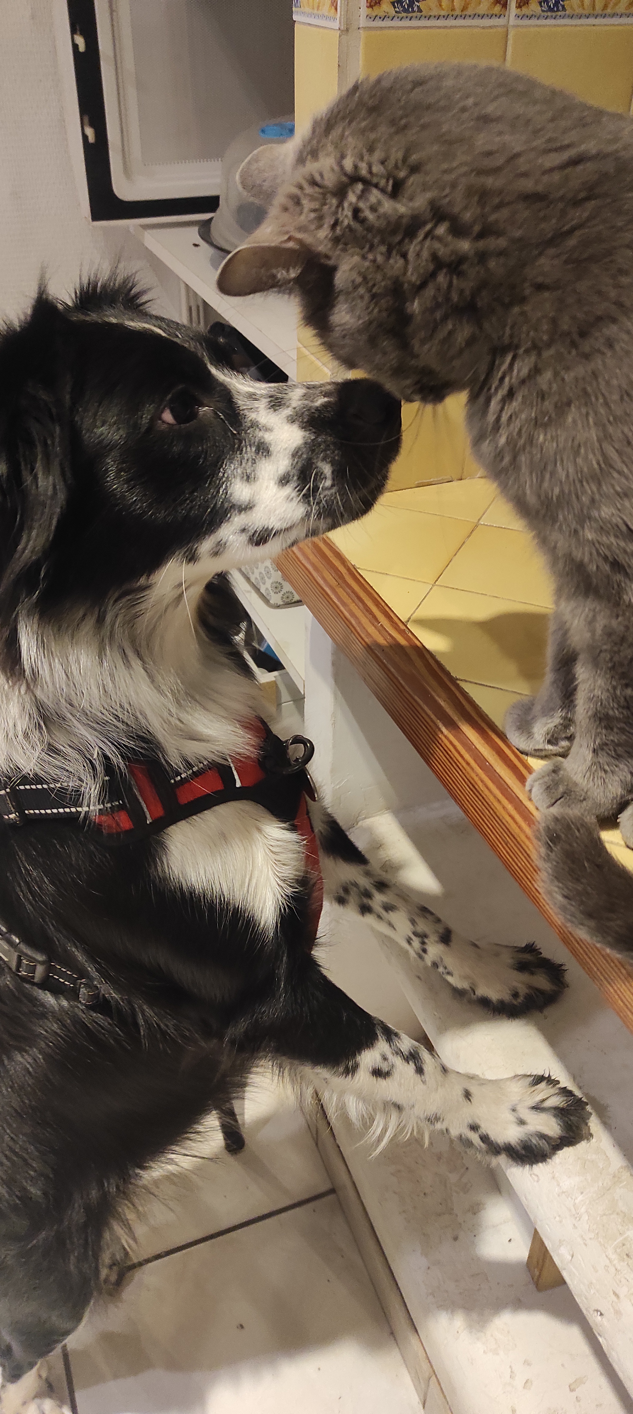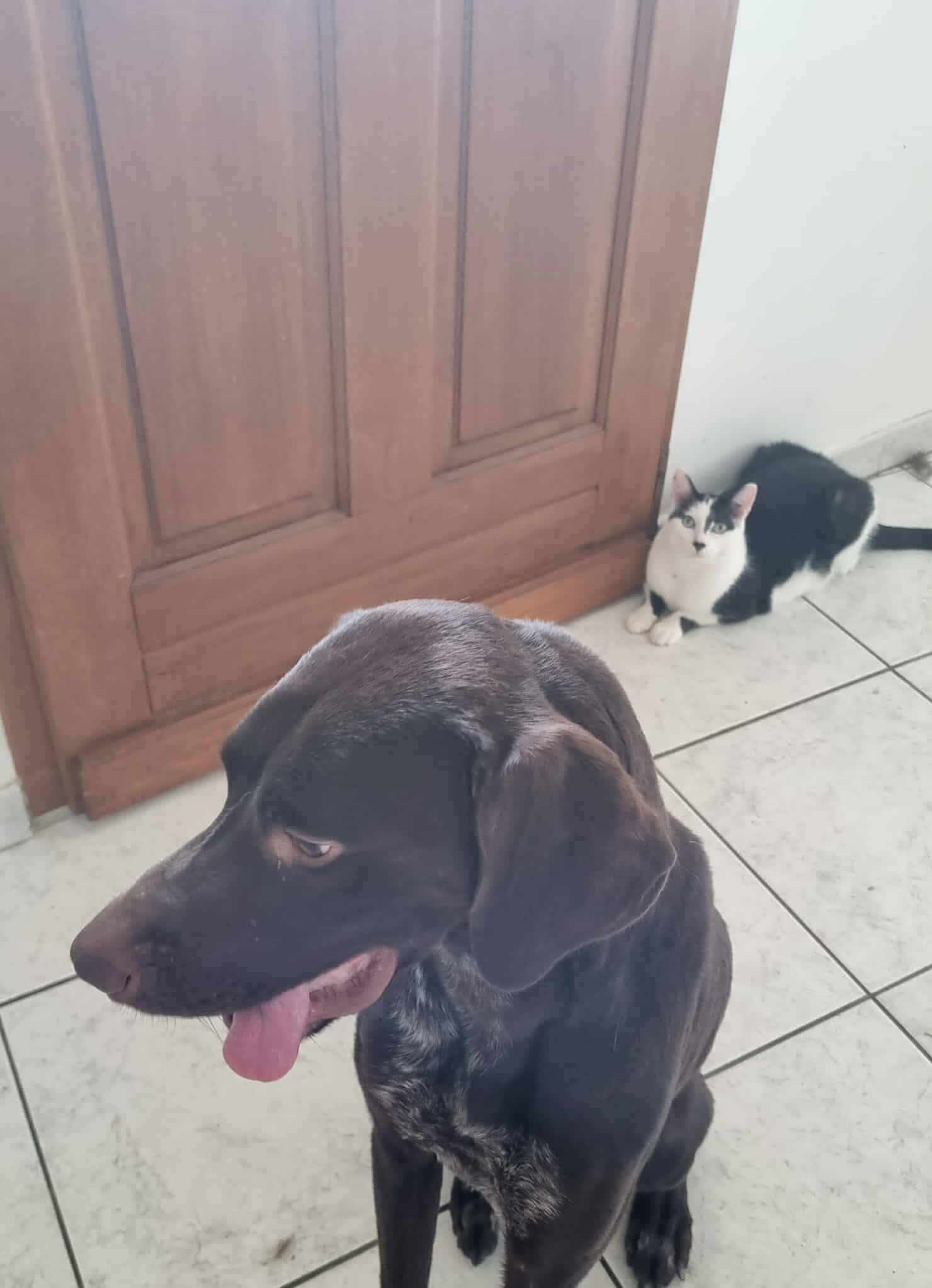 – Mercredi, test auprès de Mystic, le chat du refuge. Bruno préfère renifler les sacs de croquettes de la cuisine plutôt que de courir après Mistic, trop d’effort à fournir !
