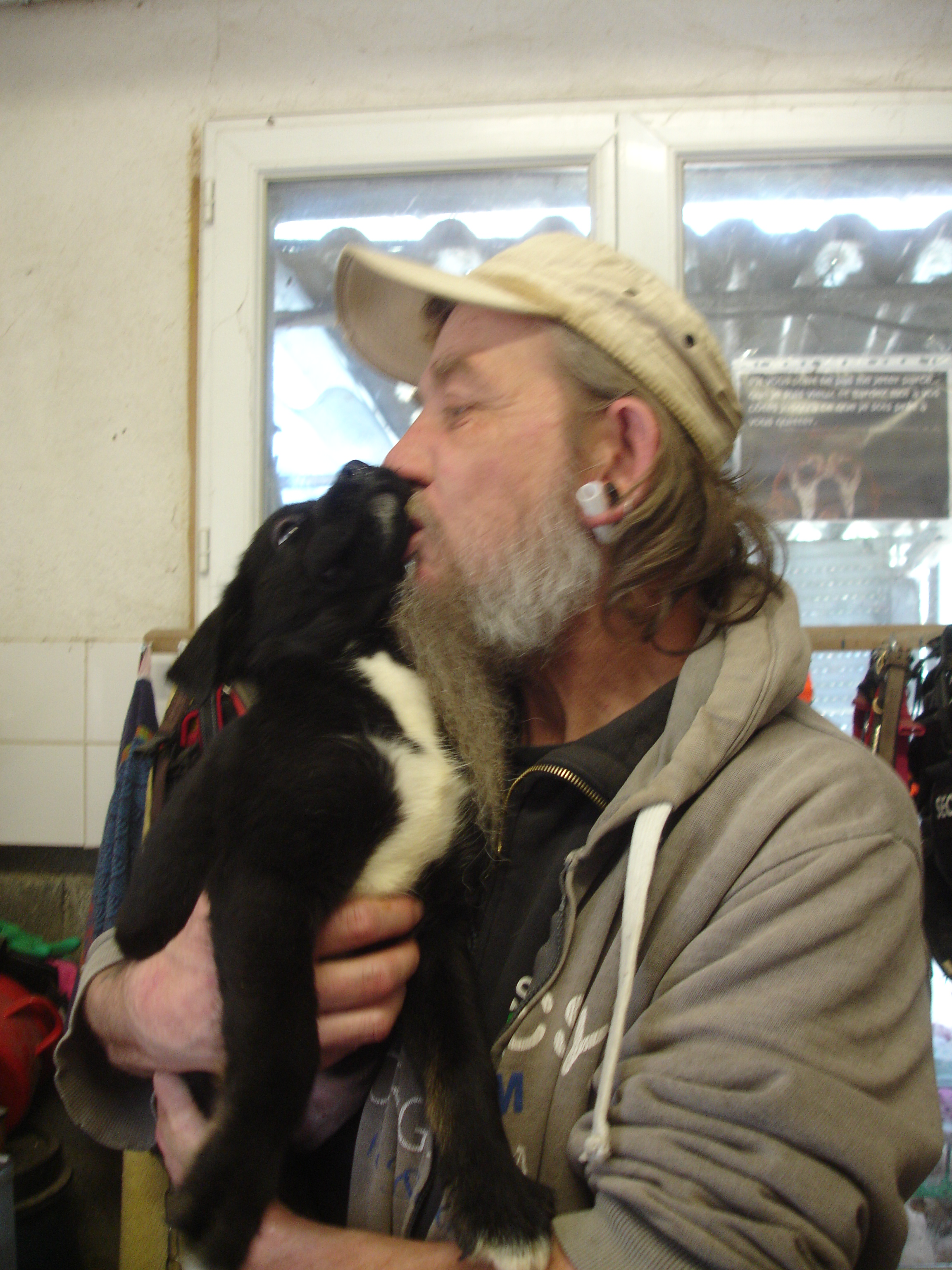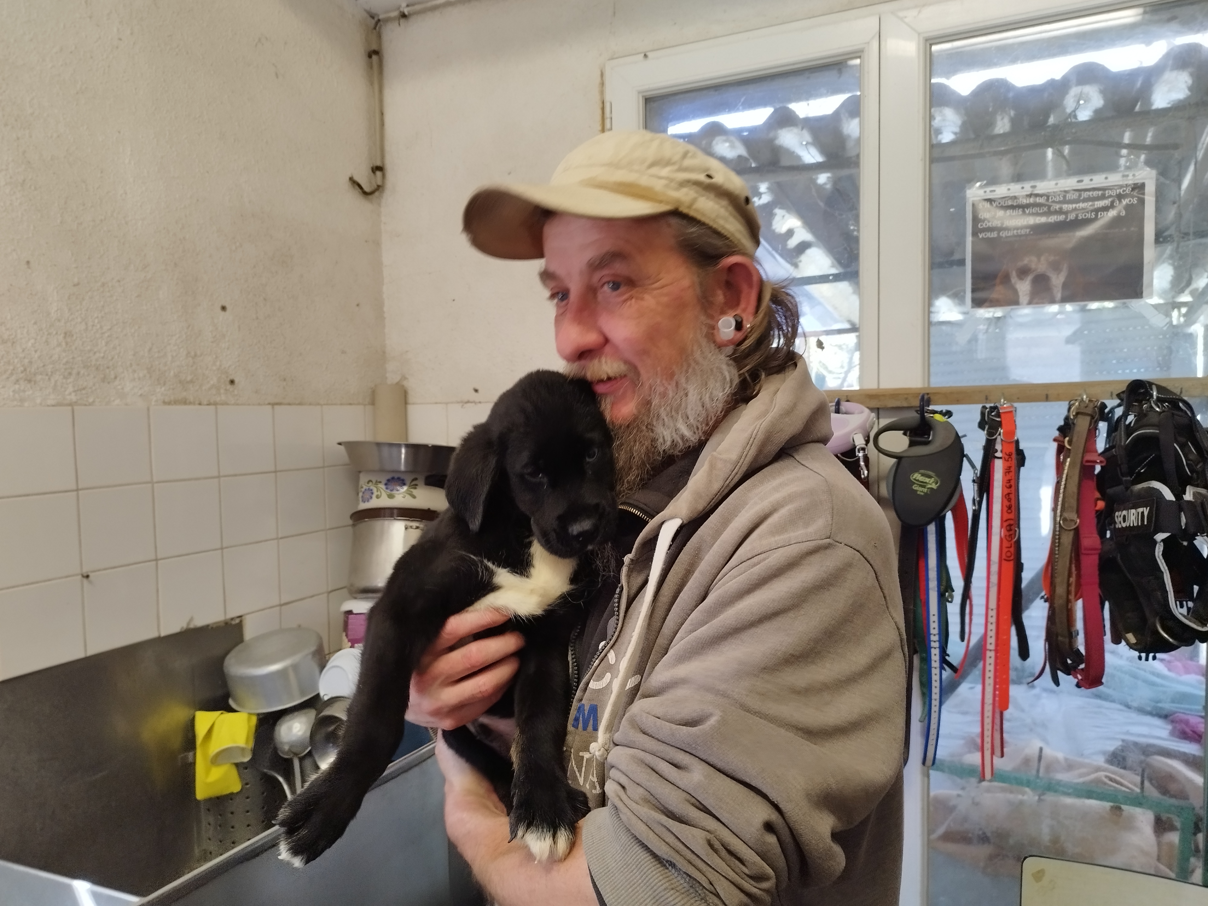 Marco fait un câlin à Vickie qui est le dernier chiot de Négrita à partir !