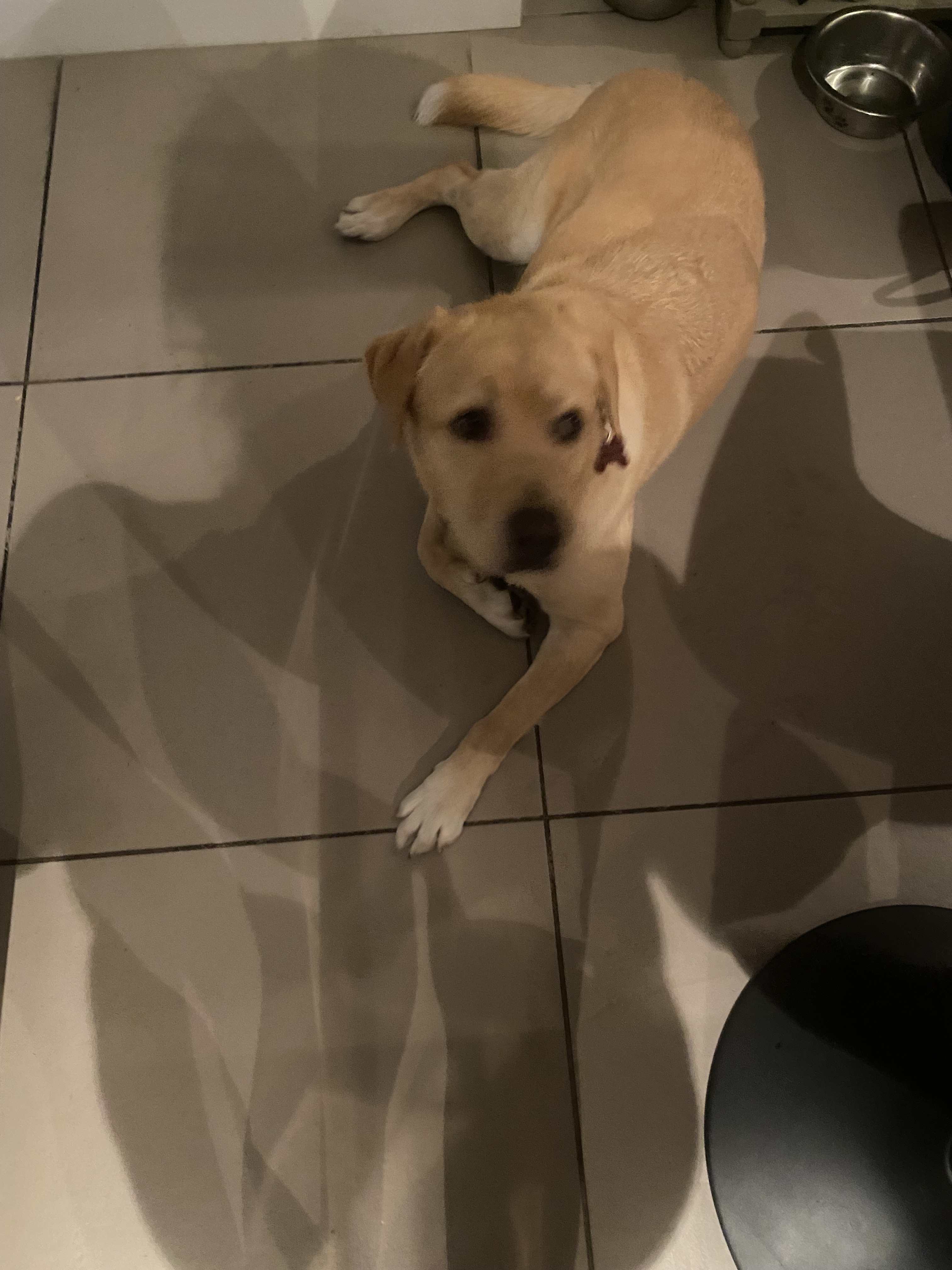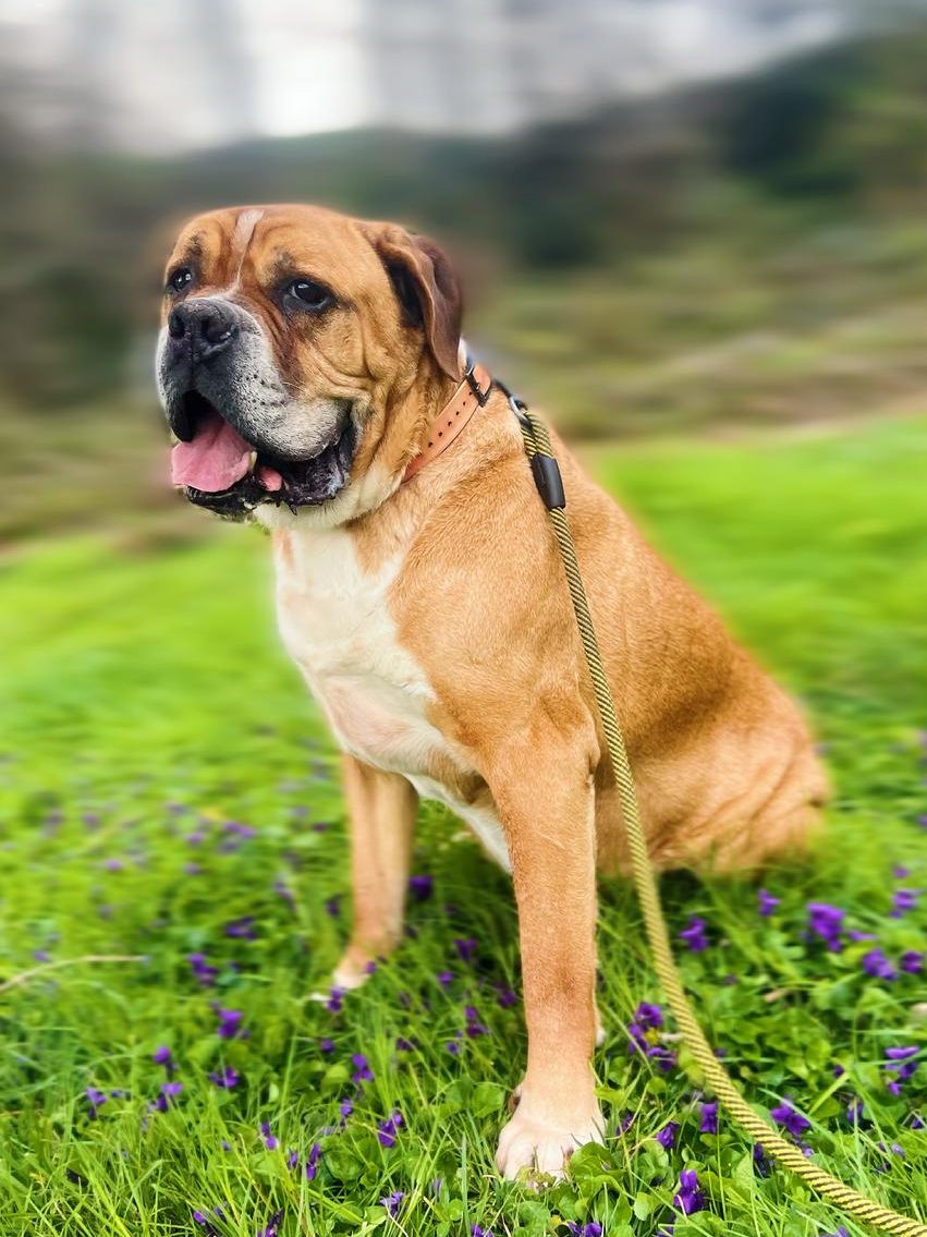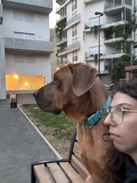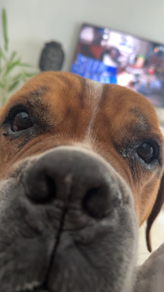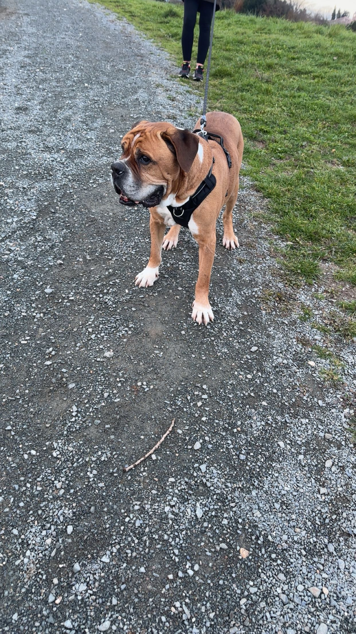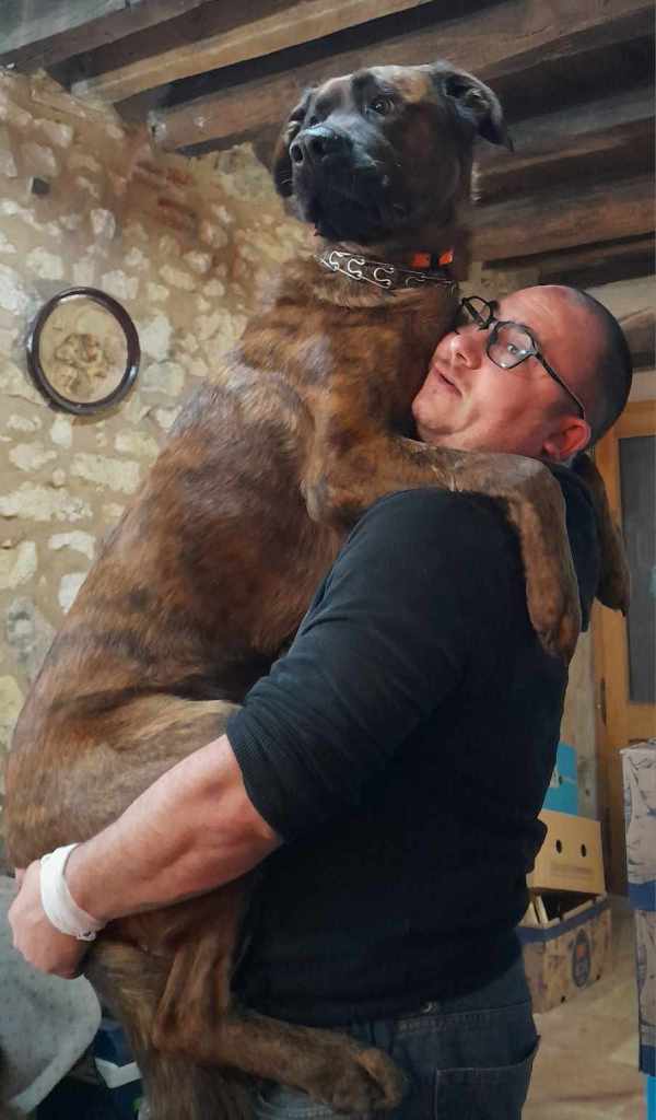 « Manny : 40 kilos d’amour, de ronflements et de bave artistique ! Adopté, pas acheté (parce que le vrai luxe, c’est l’amour poilu), il a transformé la maison en havre de câlins et en terrain d’entraînement cardio pour éviter sa queue quand il est content. Dans le quartier, il est déjà une petite célébrité :