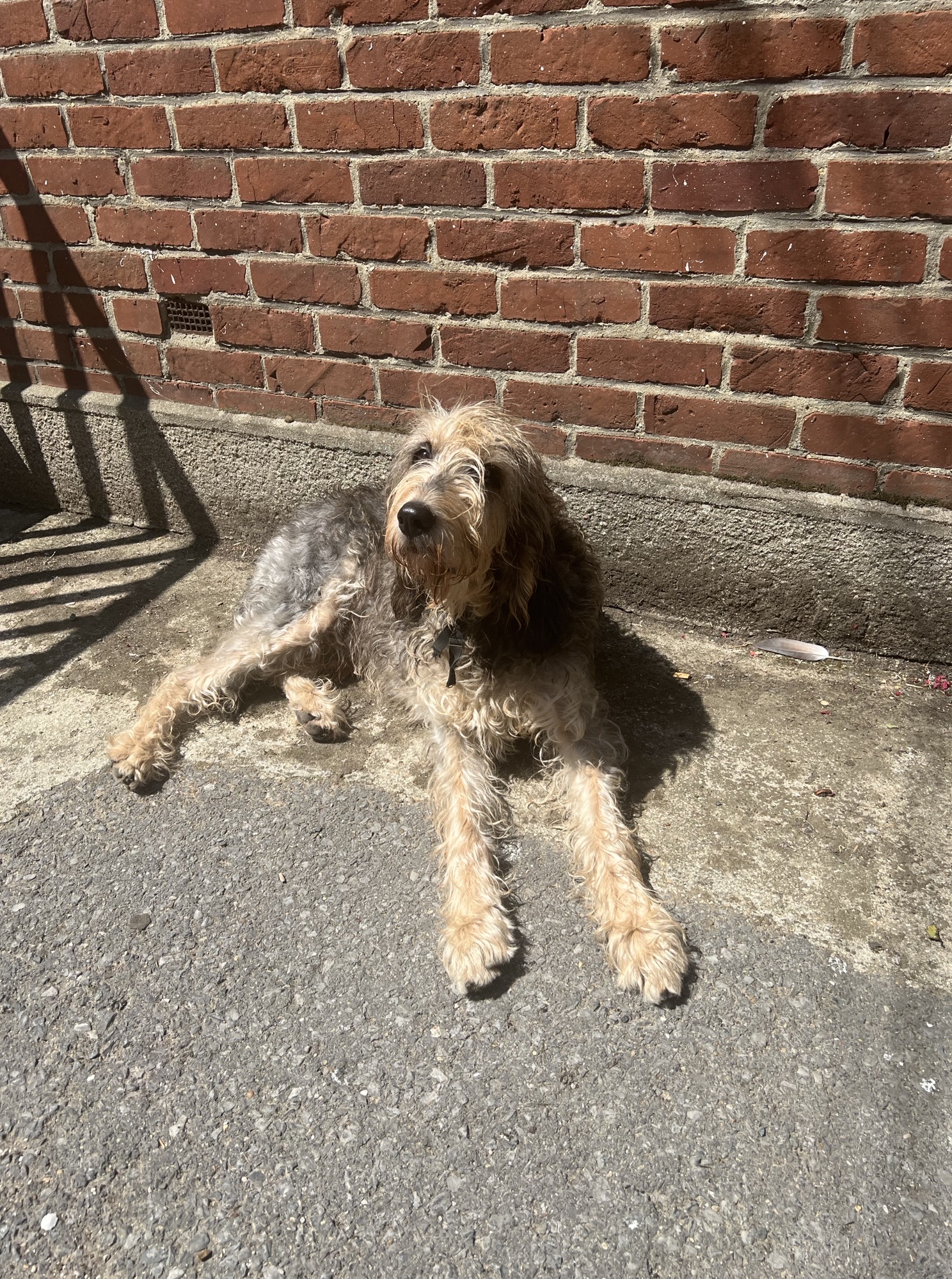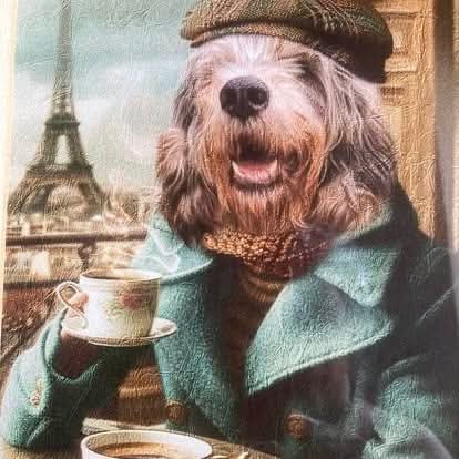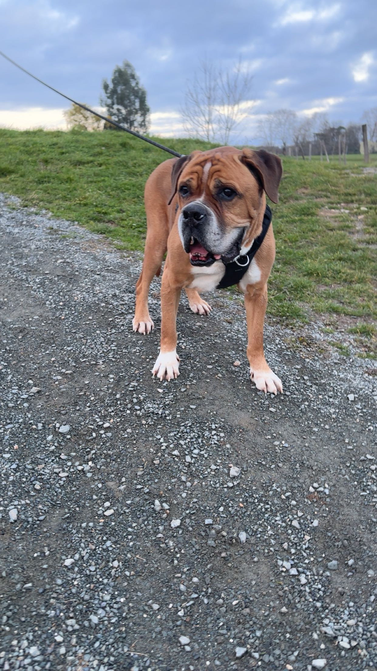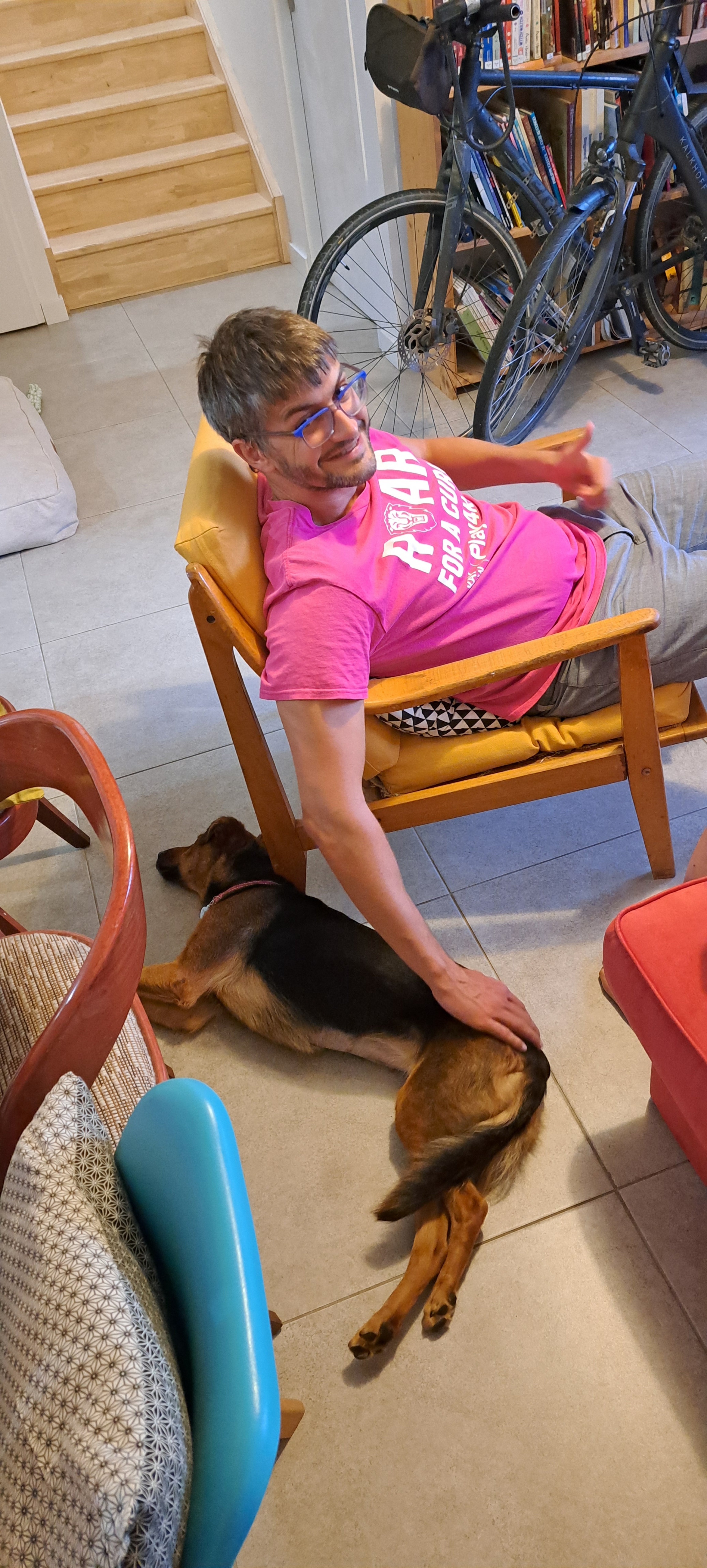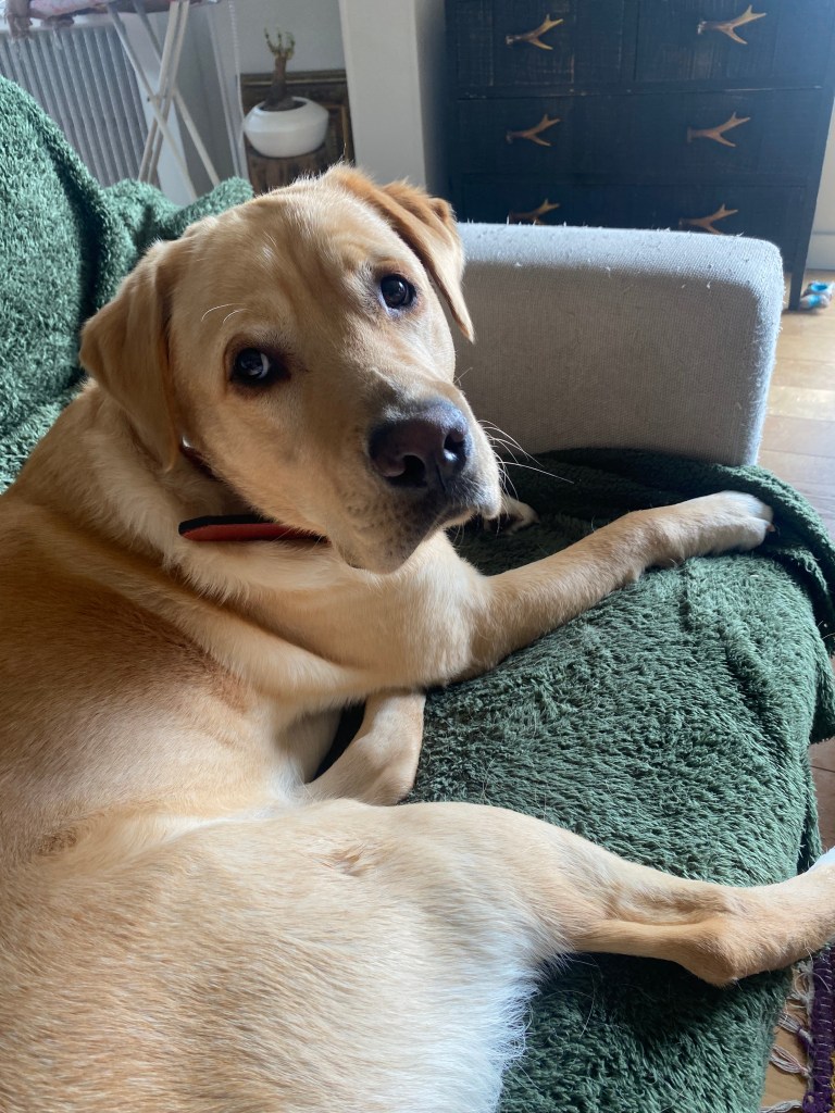« Manny : 40 kilos d’amour, de ronflements et de bave artistique ! Adopté, pas acheté (parce que le vrai luxe, c’est l’amour poilu), il a transformé la maison en havre de câlins et en terrain d’entraînement cardio pour éviter sa queue quand il est content. Dans le quartier, il est déjà une petite célébrité :