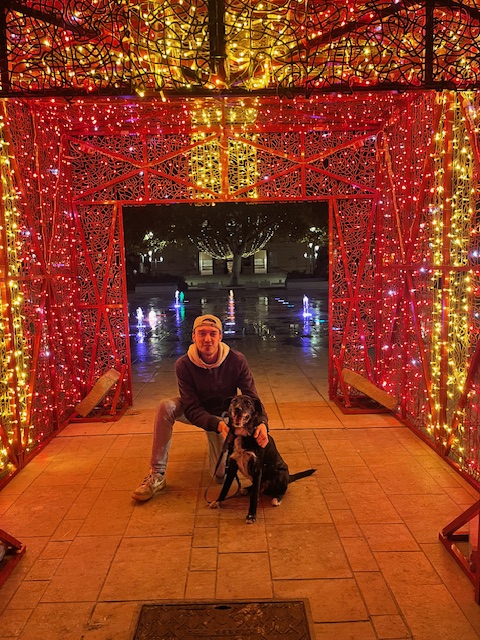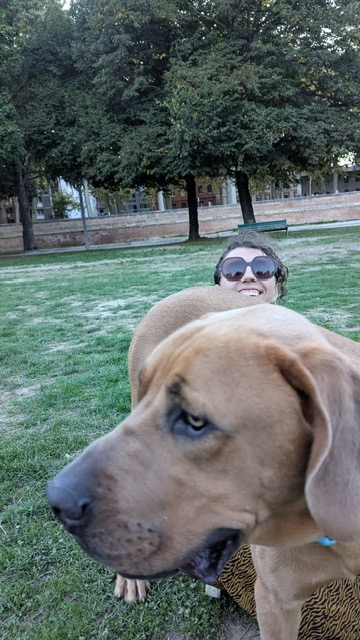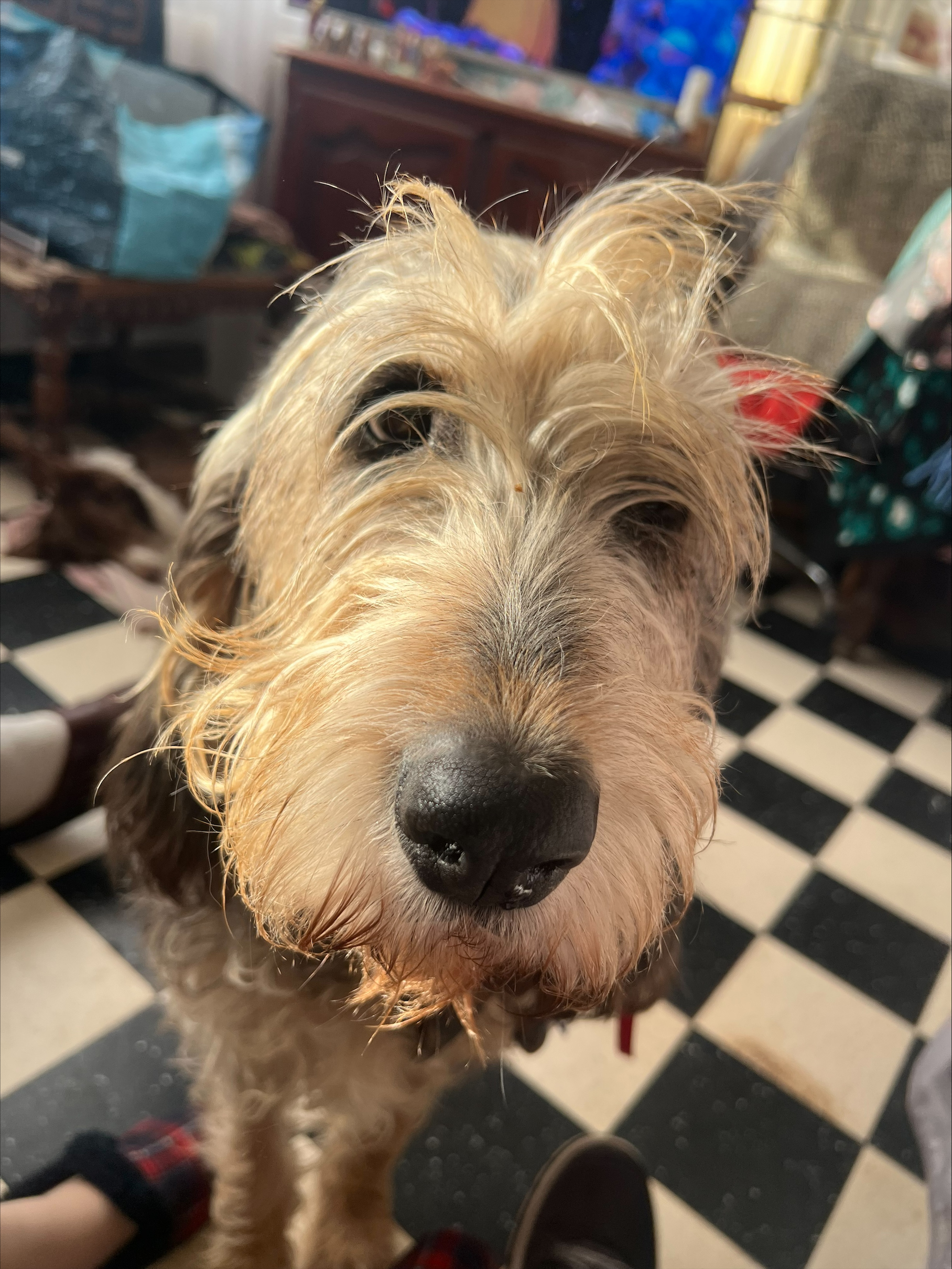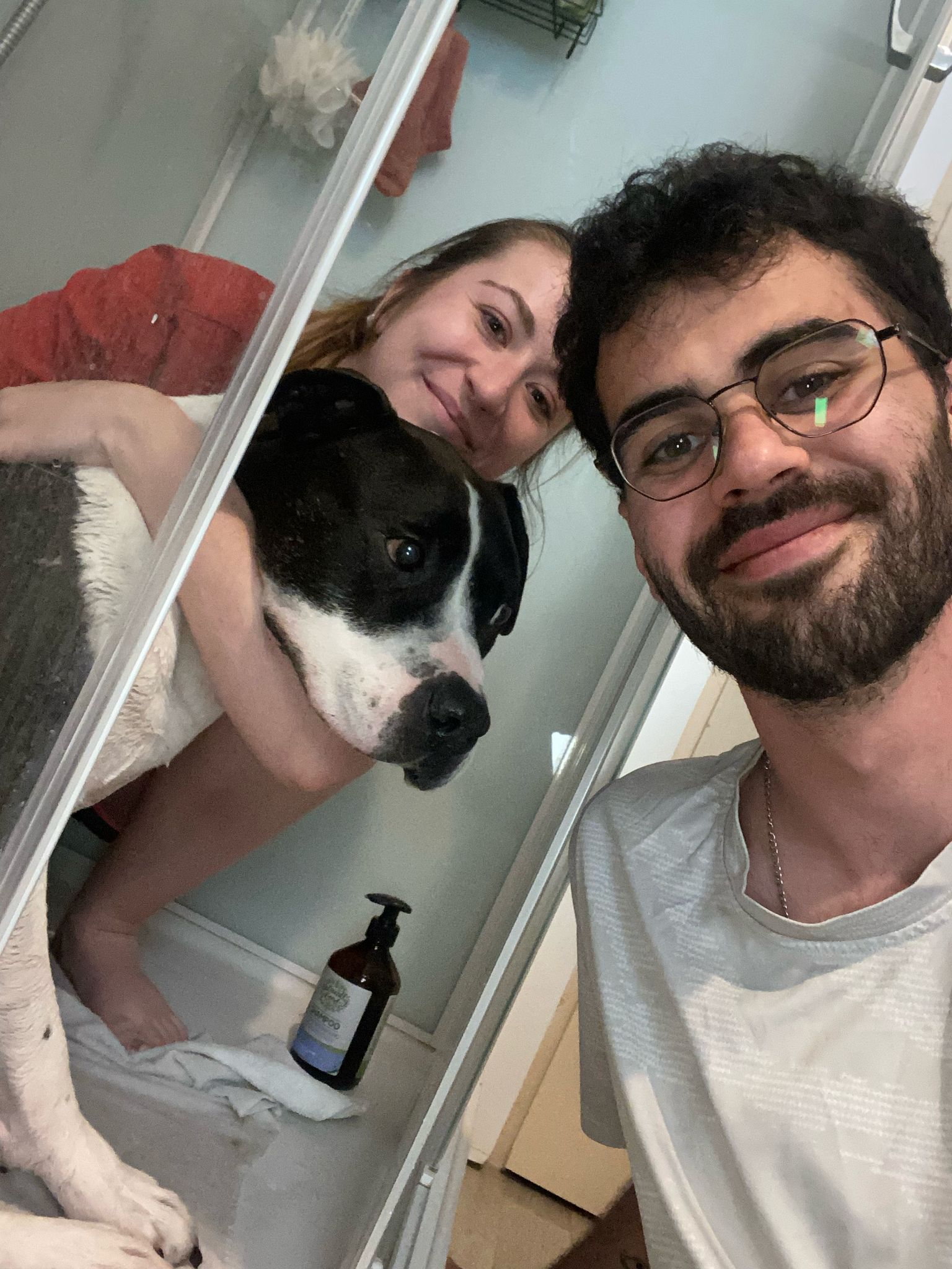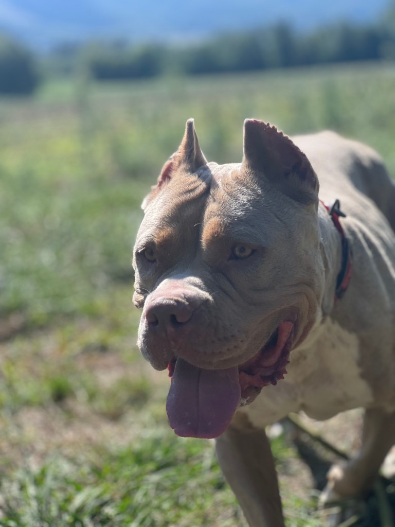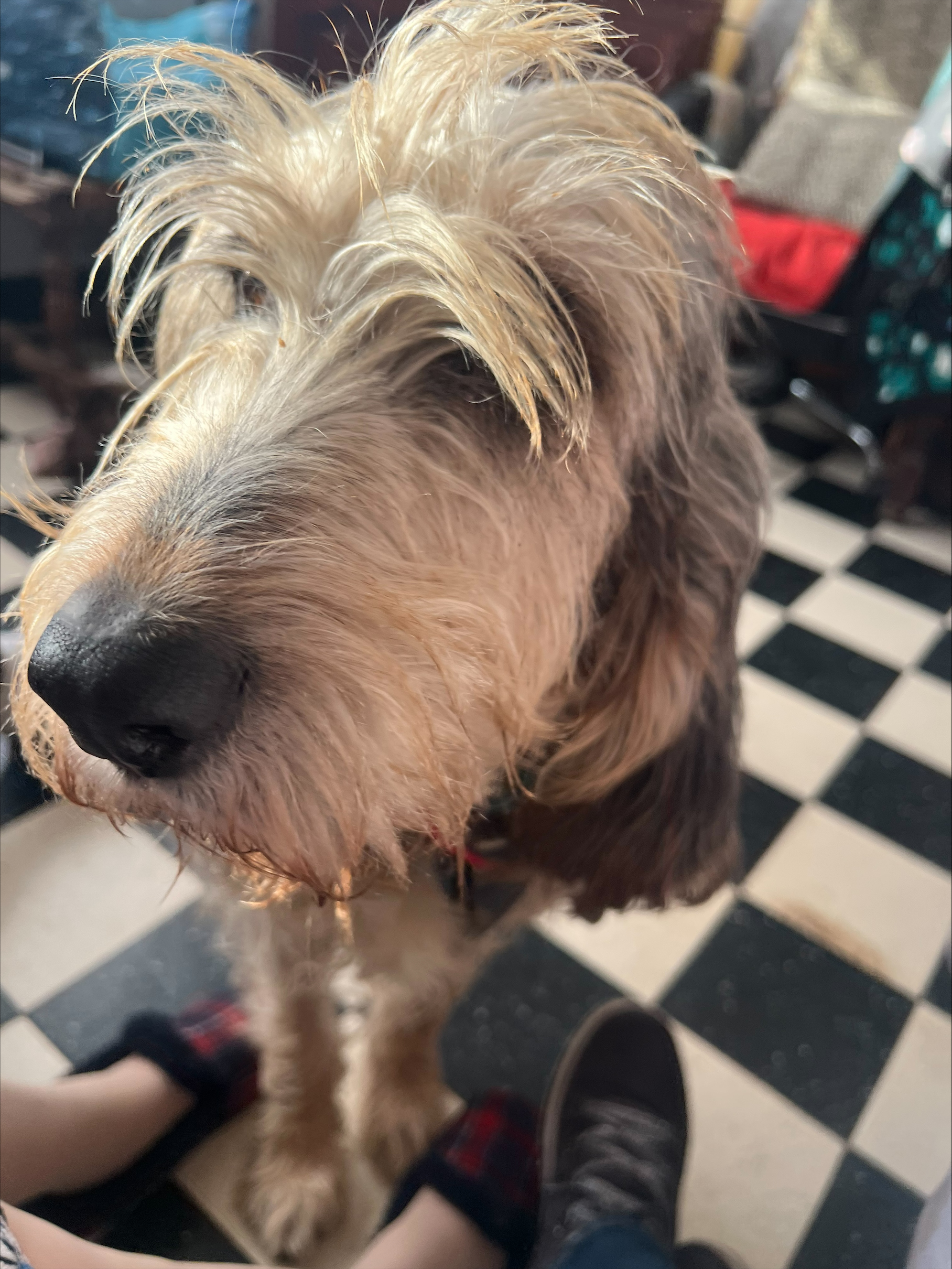 « Manny : 40 kilos d’amour, de ronflements et de bave artistique ! Adopté, pas acheté (parce que le vrai luxe, c’est l’amour poilu), il a transformé la maison en havre de câlins et en terrain d’entraînement cardio pour éviter sa queue quand il est content. Dans le quartier, il est déjà une petite célébrité :
