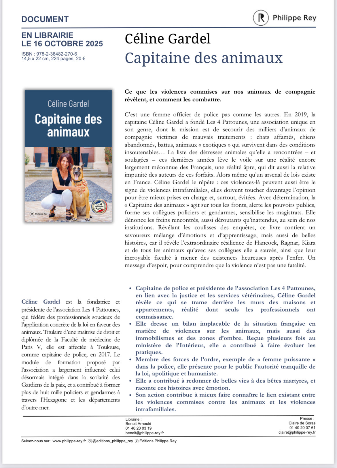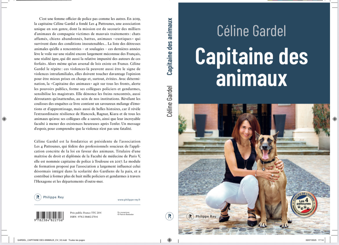 Le 16 octobre 2025, le livre Capitaine des animaux paraîtra dans les librairies. L’autrice est Céline Gardel, la présidente de l’association toulousaine Les 4 Pattounes. Cette association œuvre pour la maltraitance animale et nous sommes régulièrement en contact avec elle. Céline dédicacera son livre à la librairie Coulier, à Castres (où vous pouvez l’acheter), le vendredi 31 octobre, de 16h30 à 18h30. Par ailleurs, voici deux liens pour commander le livre :