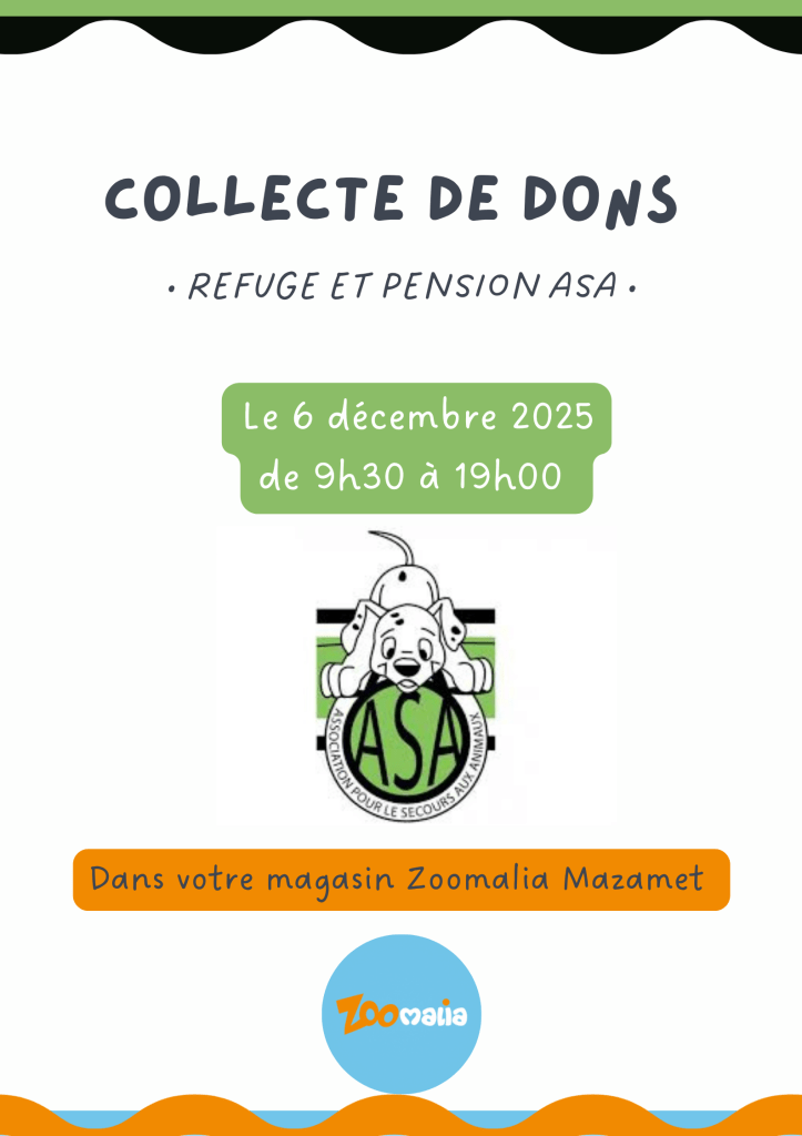 Nous remercions l’équipe de Zoomalia qui propose une collecte au profit du refuge (colliers, laisses, friandises, croquettes, jouets…). Merci également à Betti, Marianne, Marie et Marie-Christine, nos fidèles bénévoles, qui sont déjà partantes pour récolter les dons, le samedi 6 décembre !