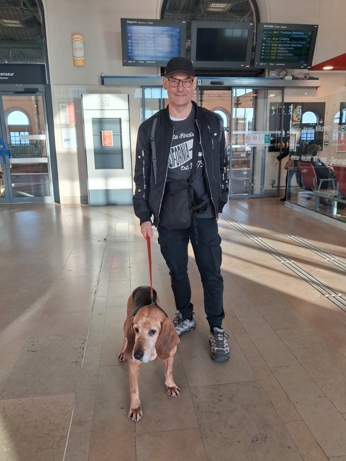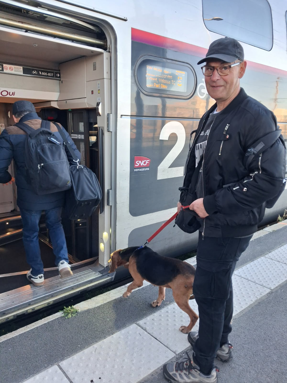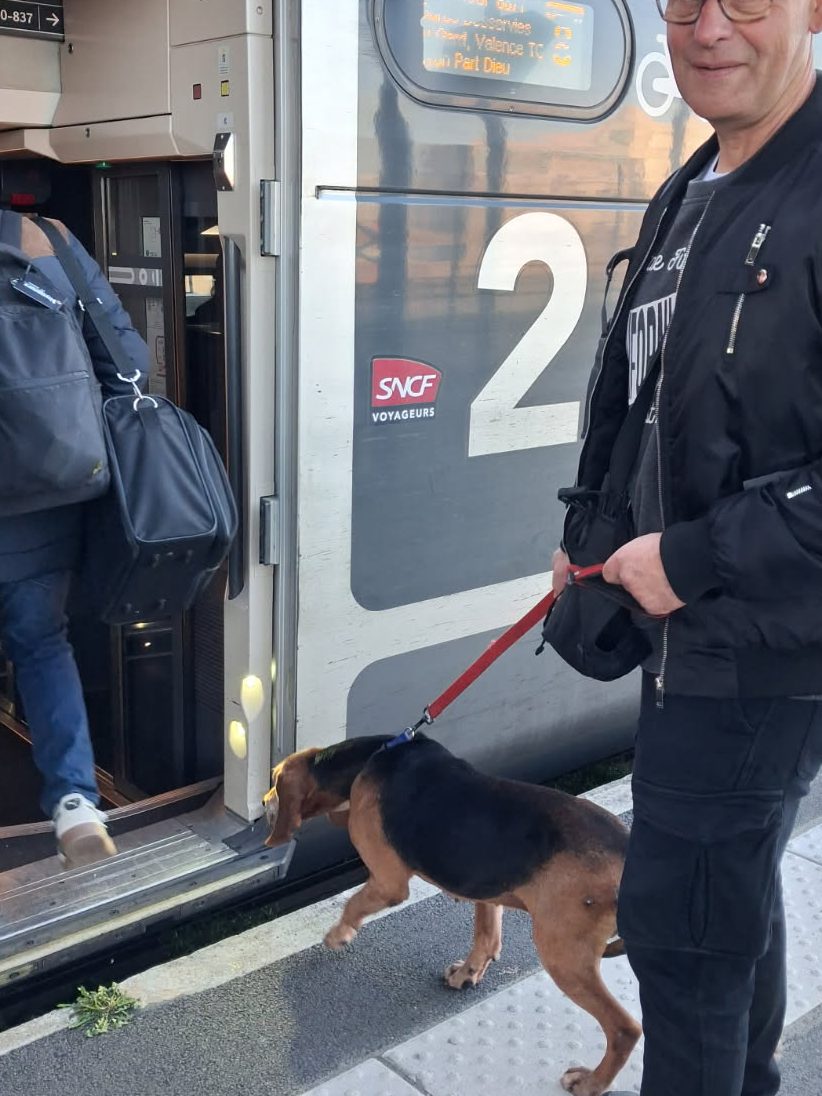 – Dimanche, départ en TGV avec un ami de Valérie jusqu’au Sud-Est de la France. Puis réception de Bruno par ses adoptants. Enfin, nouveau voyage en voiture jusqu’à destination où Bruno « s’avachit » sur le confortable canapé pour se remettre de ses émotions !