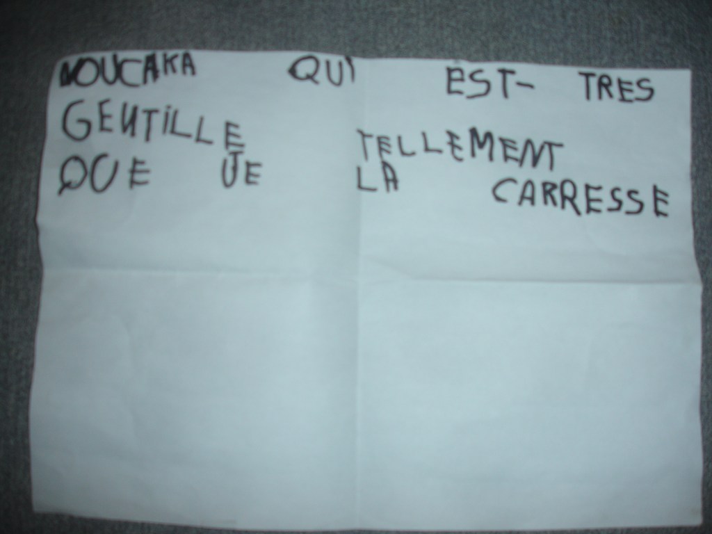 Cet après-midi, malgré la pluie, un petit garçon est venu avec toute sa famille pour promener Noushka et Jack. Il avait déjà rencontré Noushka, lors d’une promenade précédente. Elle lui avait tellement plu qu’il lui avait écrit un message. Ce message, il l’avait soigneusement plié et scotché. Il voulait lui lire, aujourd’hui. Mais Noushka a été adoptée et il ne l’a pas vue. Le jeune garçon était déçu. Je lui ai alors demandé s’il acceptait que j’ouvre sa lettre pour la photographier et l’envoyer à Noushka. Il a bien voulu. Je lui ai promis que j’enverrai son message, dès ce soir. Le voici, c’est très émouvant… (Florence).