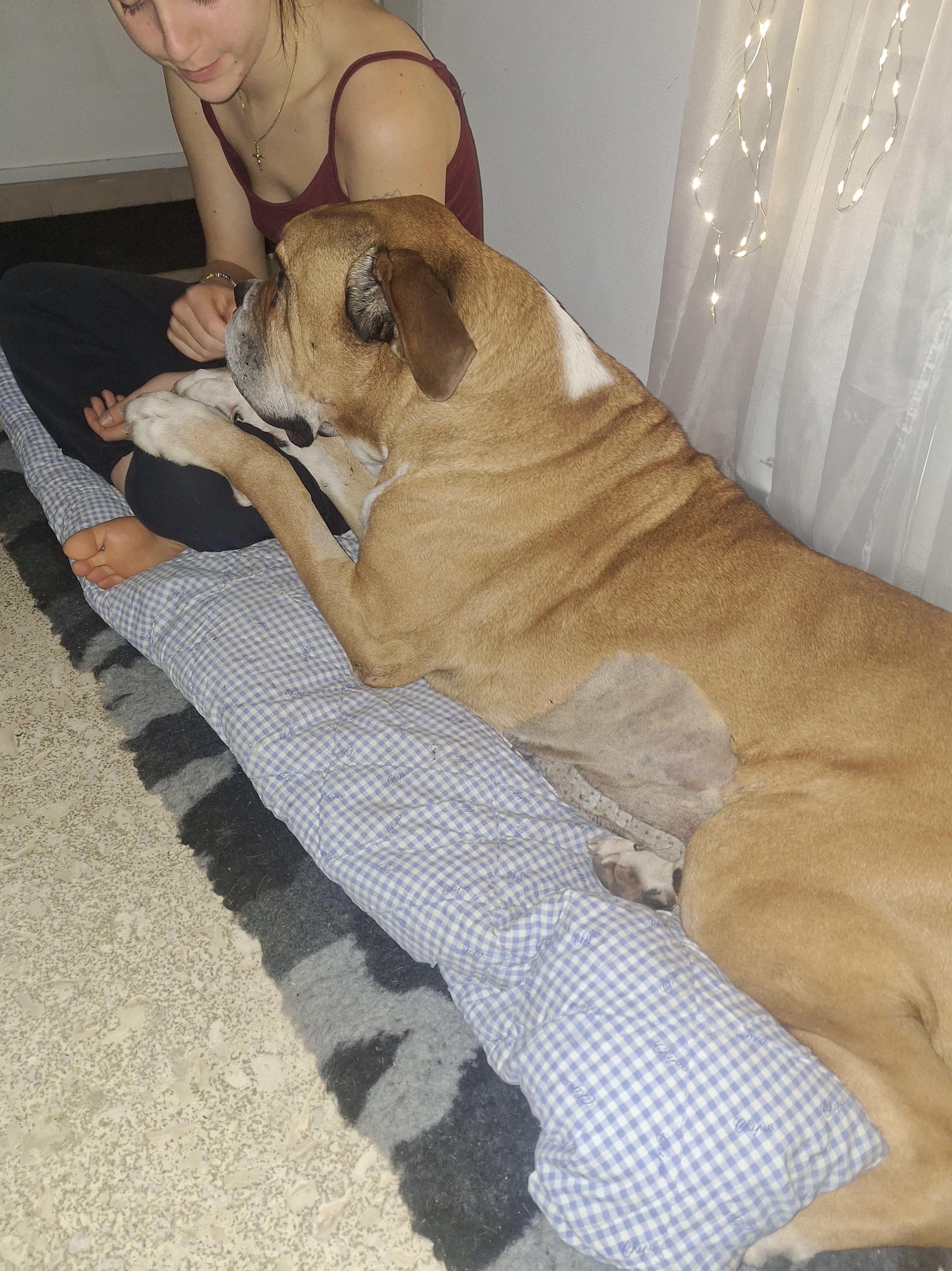 Spyro était un chien traumatisé des hommes, il a été témoin et victime de violences conjugales dramatiques où seul lui en est sorti vivant mais très traumatisé. Il a fallu des mois pour pouvoir l’approcher, le caresser et le sortir de sa cage… »