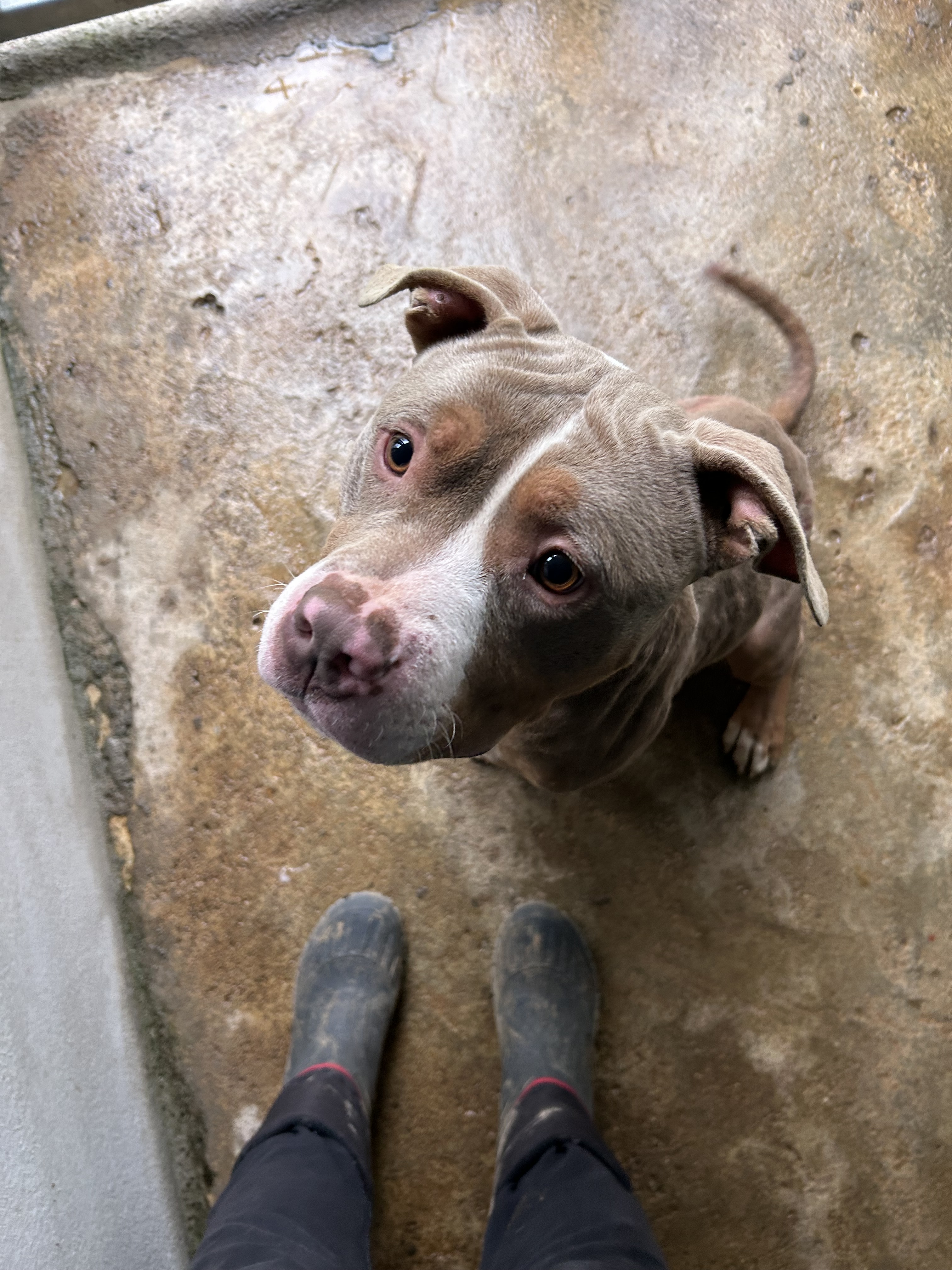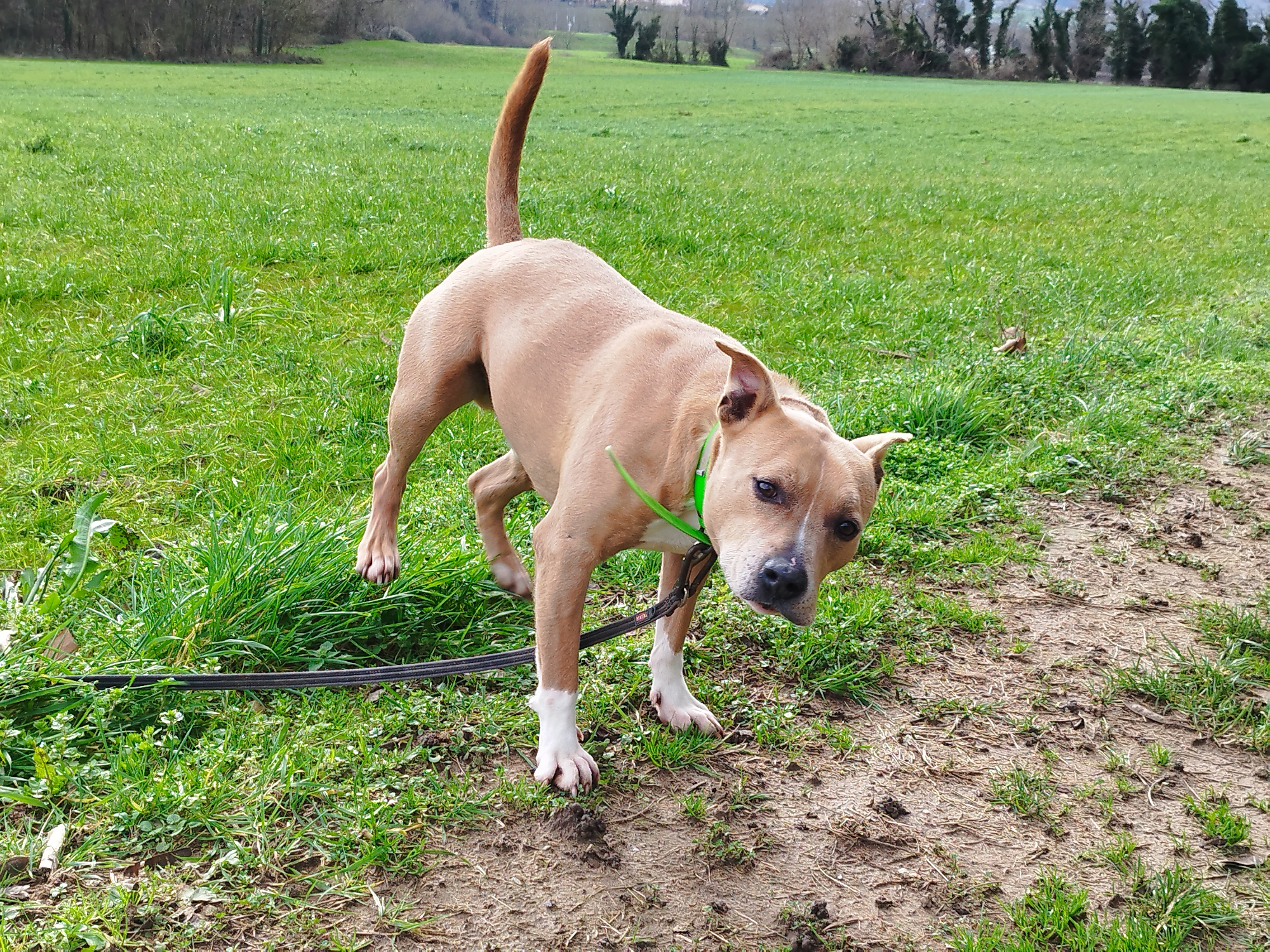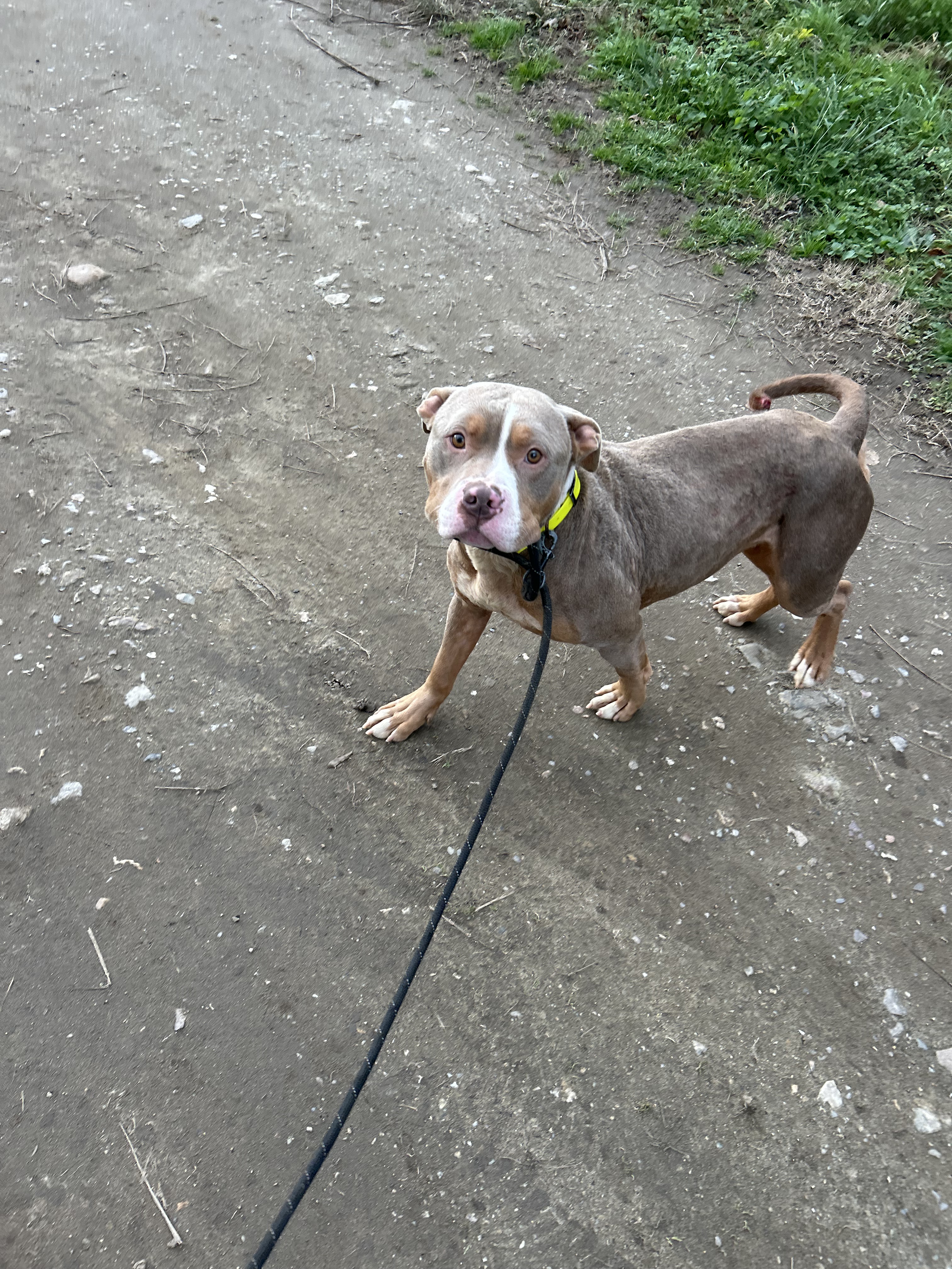 Shaman (né en 2023) est un chien puissant de 3 ans, de taille moyenne, croisé American Bully. Il est très proche des humains et aime les caresses. Shaman adore l’eau et il est même difficile de l’en sortir ! Un vrai poisson !
