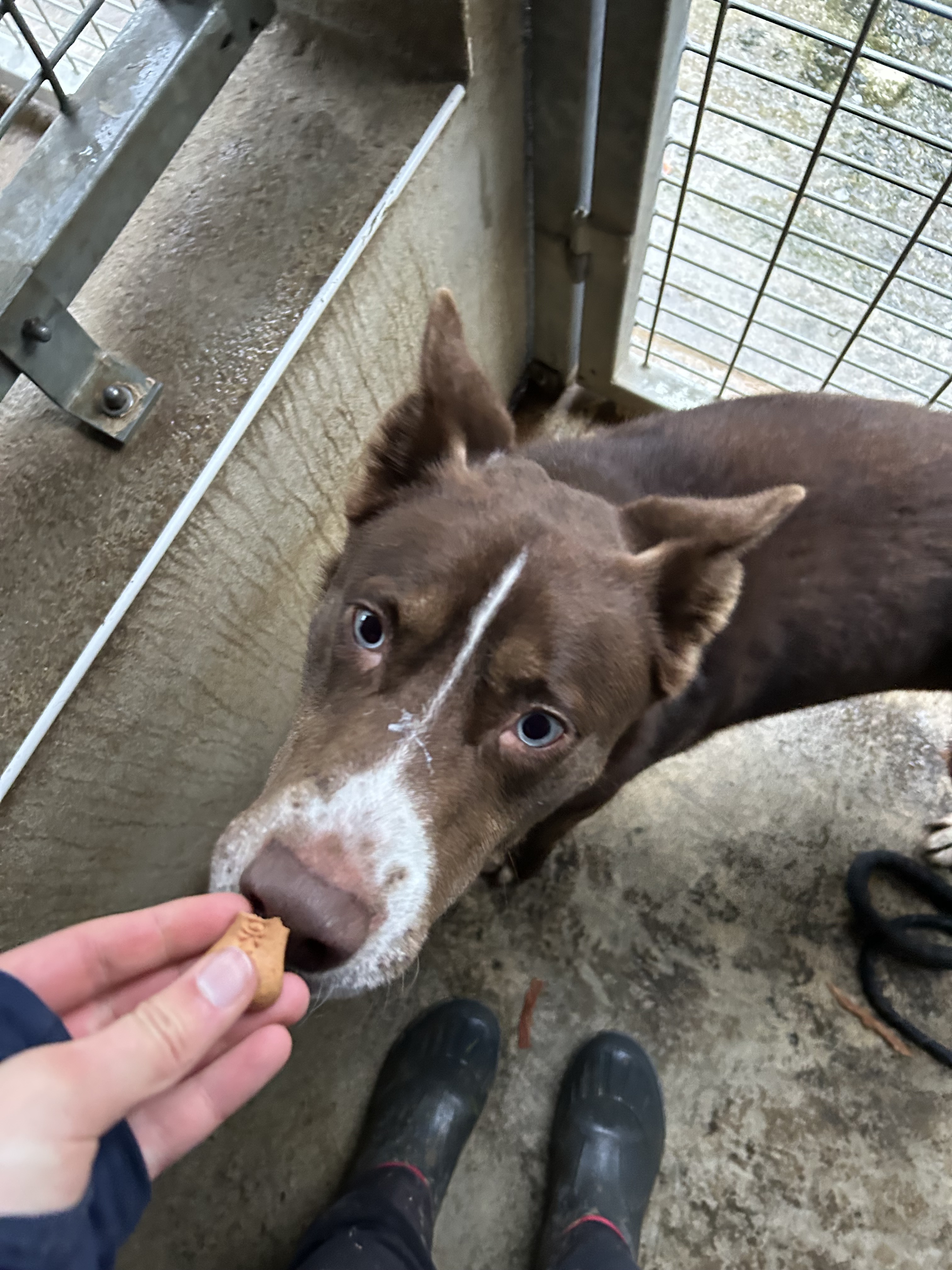 Blacky (né en 2023) est un chien de taille moyenne, de 2 ans et demi environ, croisé Berger. Blacky était très peureux et n’est pas sorti de son box pendant longtemps. Avec l’aide de l’éducateur canin Jean-François Holleville, patient et extrêmement bienveillant, Blacky a accepté de quitter le box, pour se promener. Désormais, Blacky se promène comme les autres chiens du refuge, au grand air. Cependant, pour attacher la longe à son collier, il faut encore ruser et lui proposer des friandises… Si vous êtes intéressés par Blacky, il vous faudra beaucoup de patience et de présence avant de pouvoir l’adopter. Mais c’est un loulou qui en vaut la peine : il a tellement d’amour à offrir !